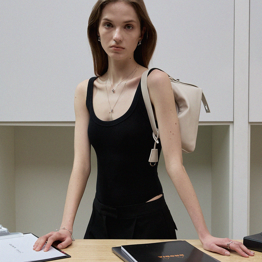 都市で働く女性の静かな強さと日常のリズムを表現したコレクション。流れるように重なり合うラインと、結び目から着想を得たディテールが、繊細な緊張感と“つながり”の本質を描き出します。過度な装飾に頼らず、構造美と洗練されたフォルムによって、レイヤードから単体まで自在に馴染むモダンなバランスを提案します。