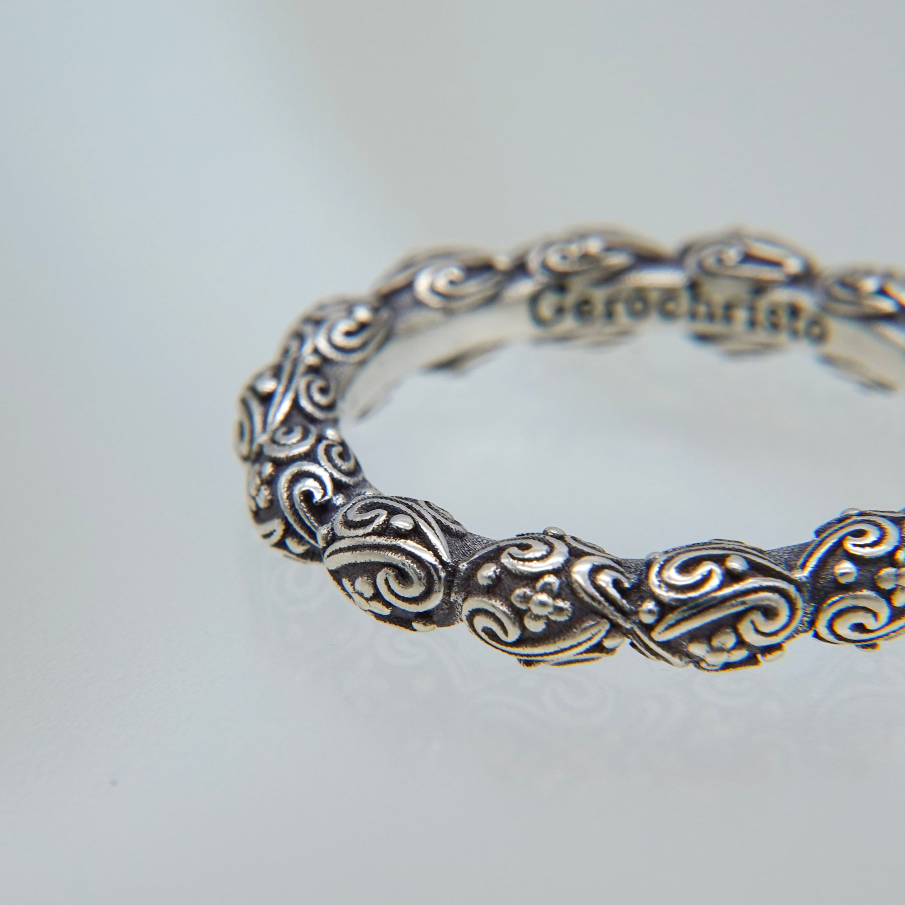 全周に連続する装飾を施した、細身ながら存在感のあるシルバーリングです。