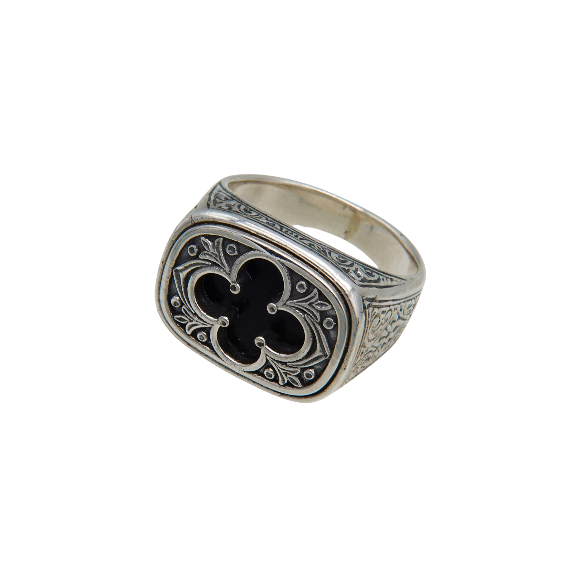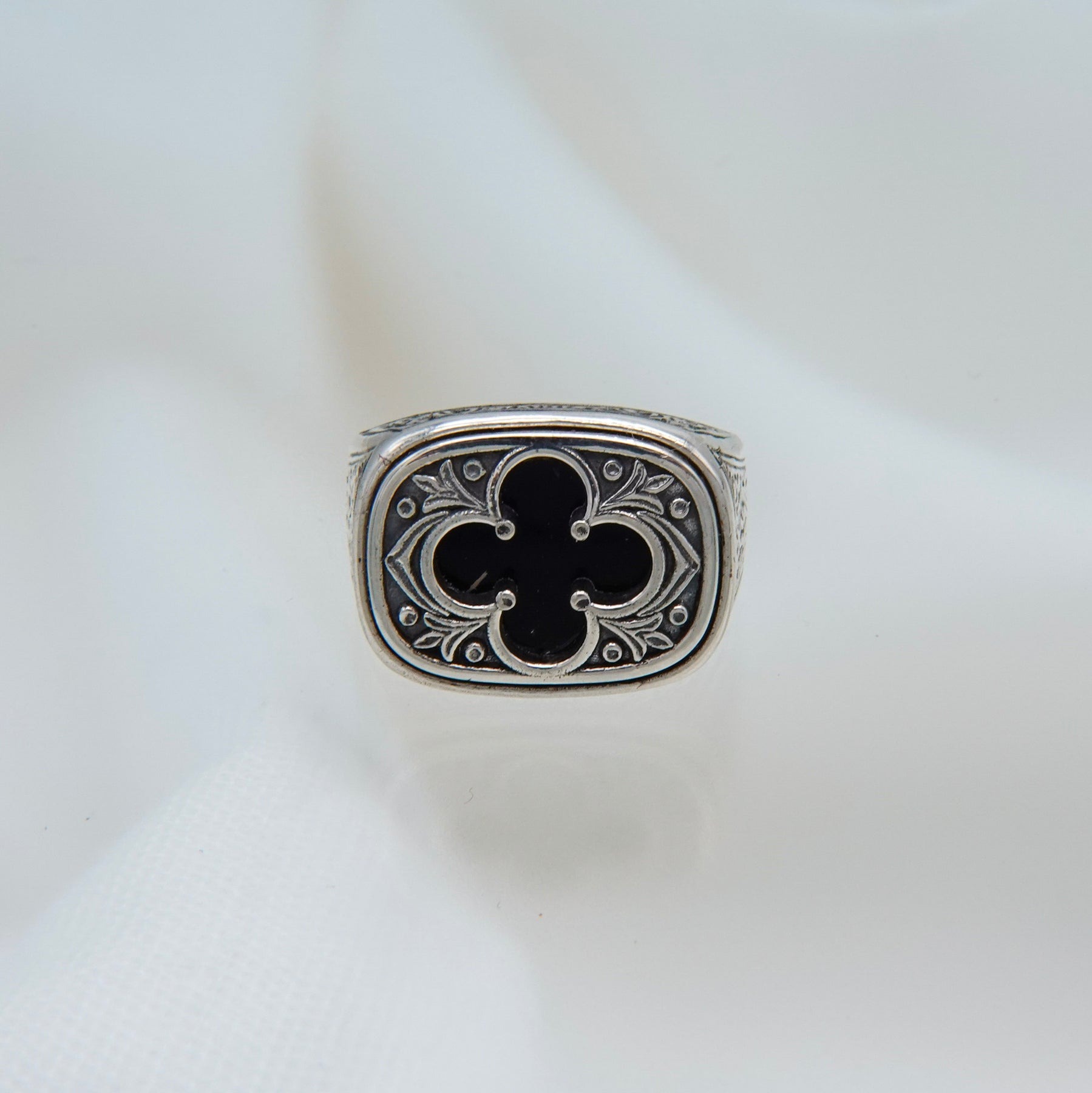 幅広のトップにクローバー状モチーフを配した、存在感のあるリングです。