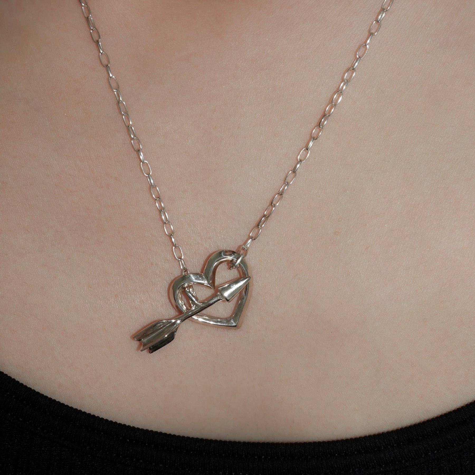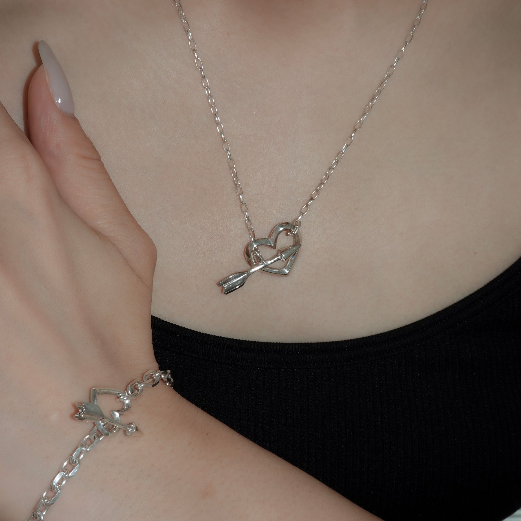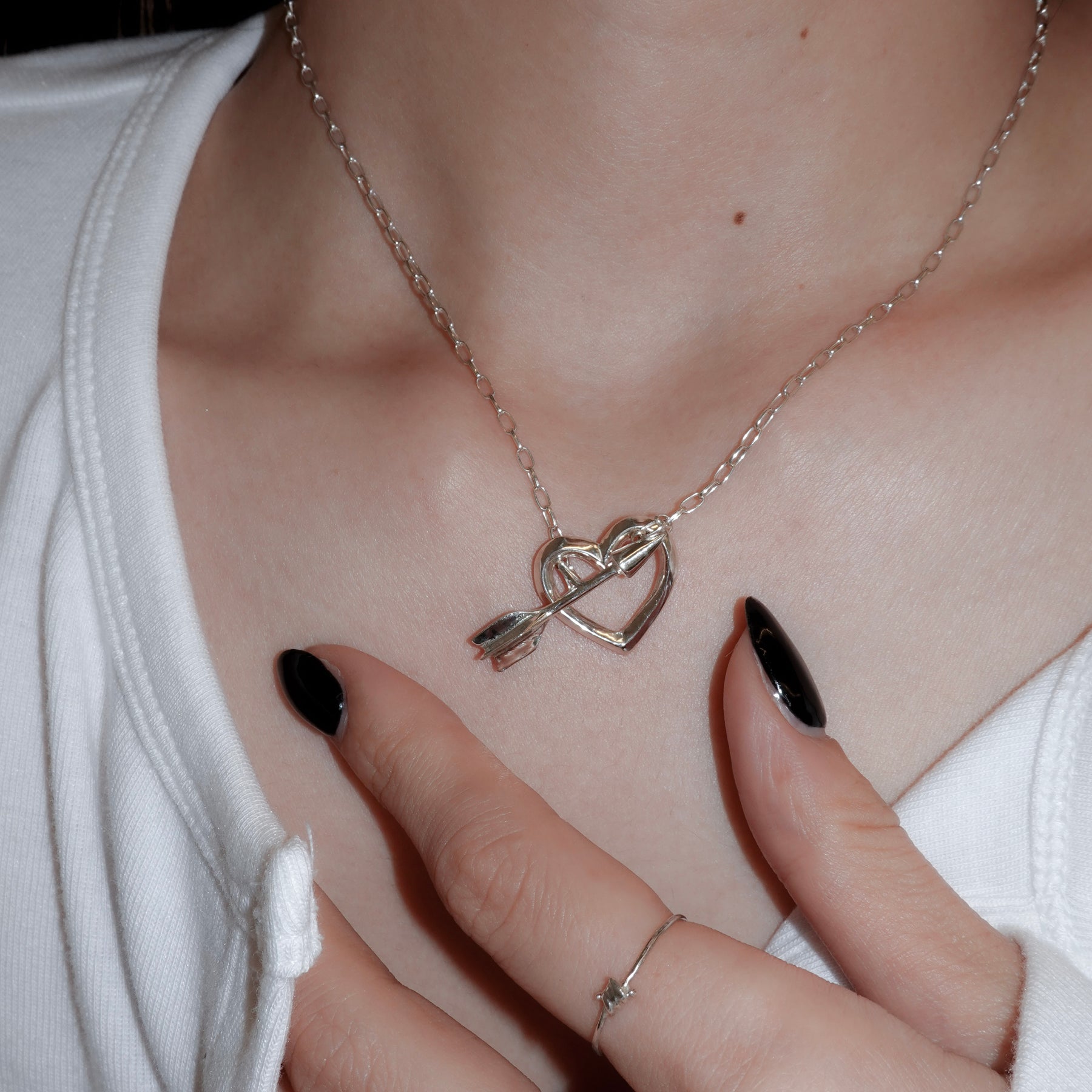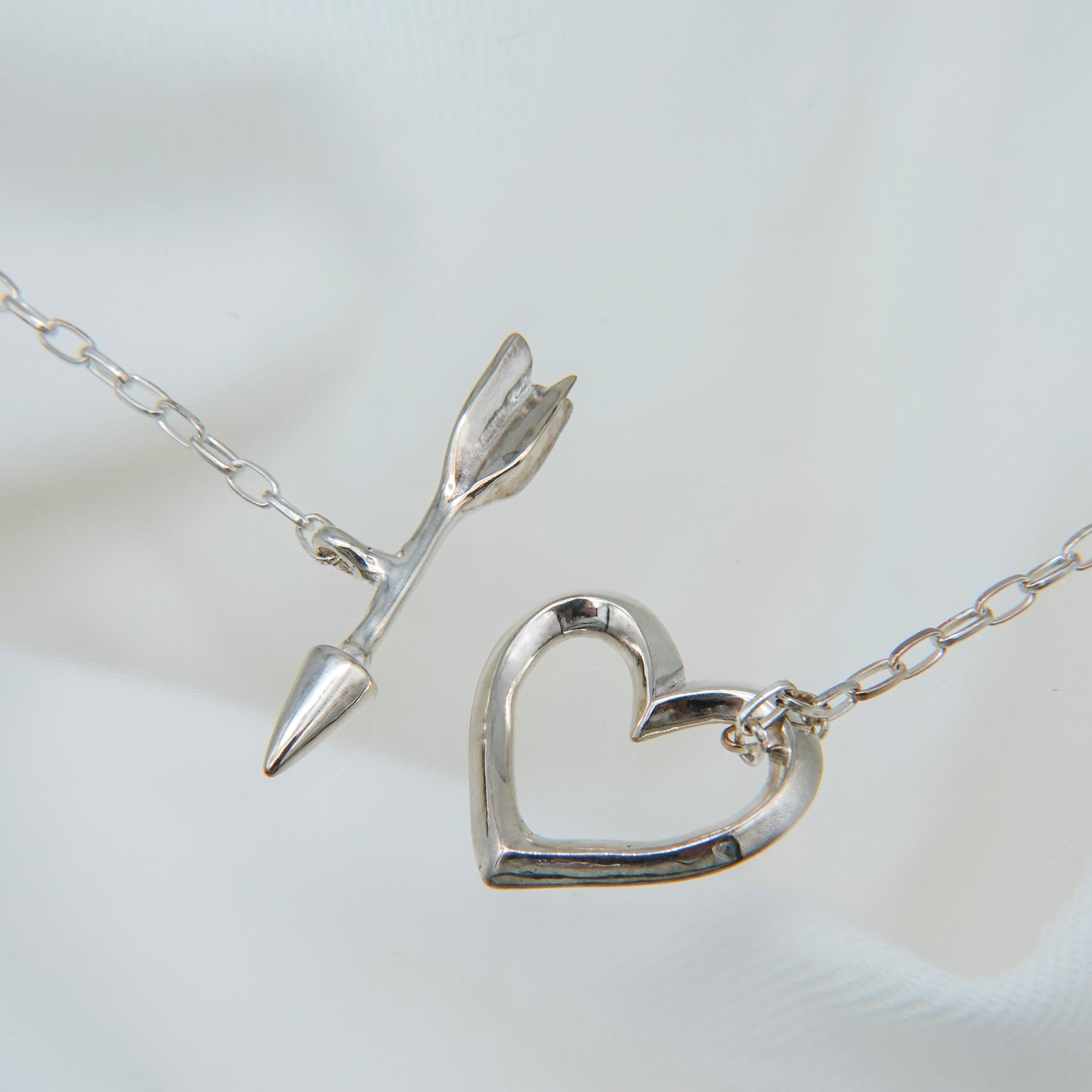 細く繊細なチェーンと、結び目のように絡み合うハートと矢が、感情の複雑さと誠実さを静かに語ります。