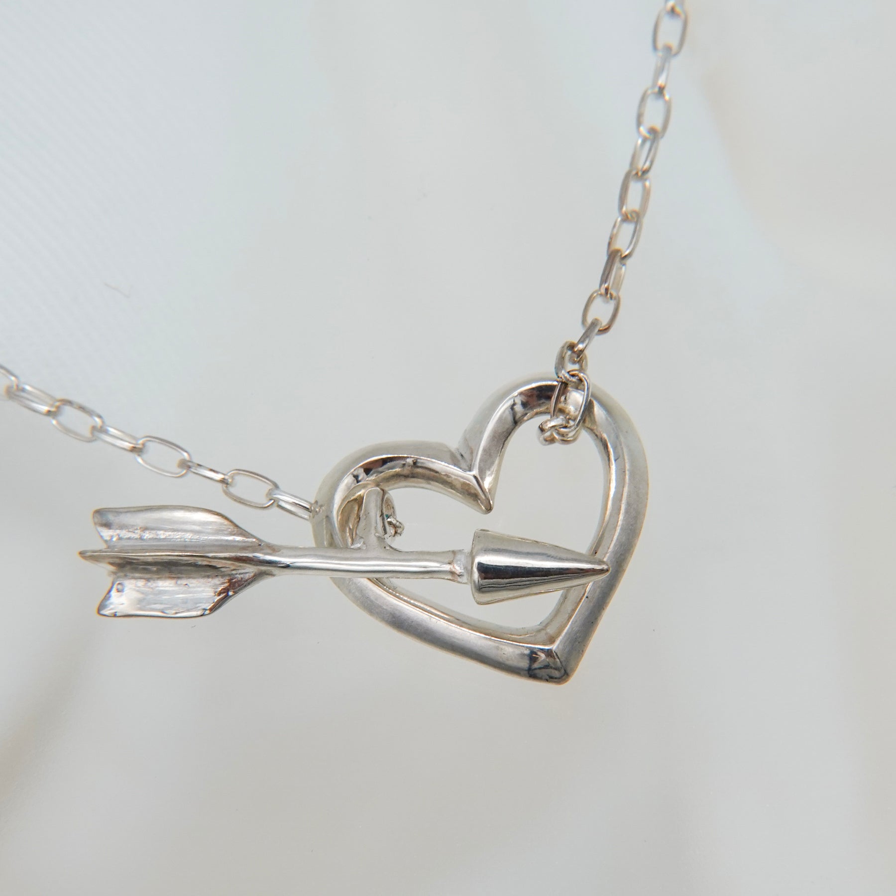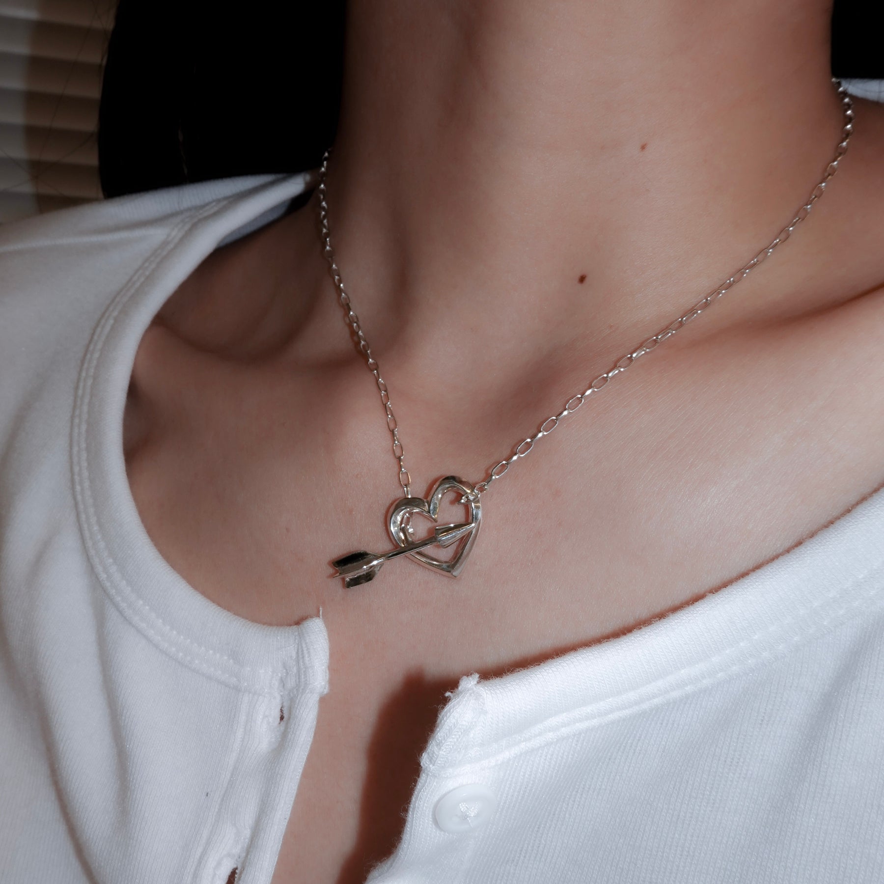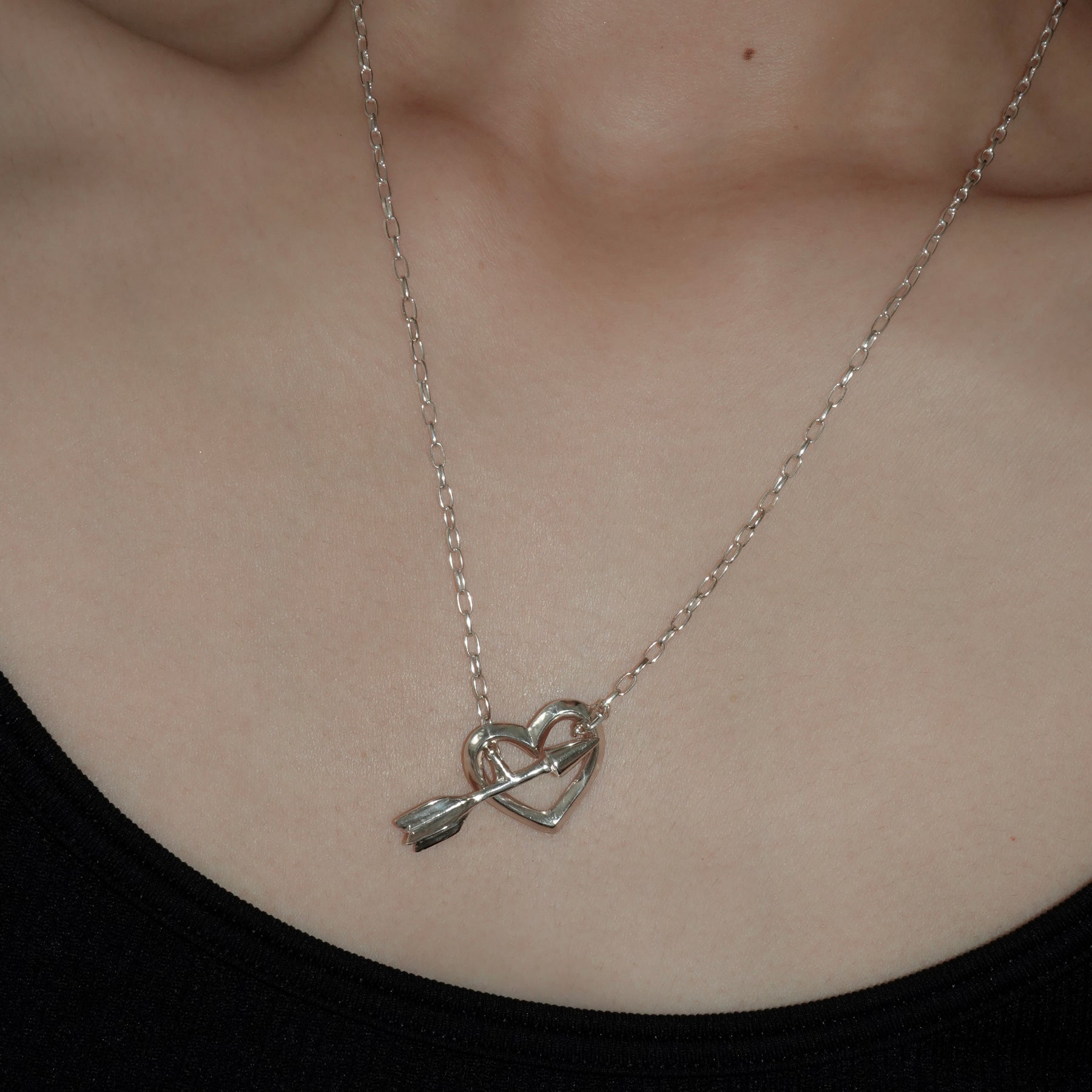 細く繊細なチェーンと、結び目のように絡み合うハートと矢が、感情の複雑さと誠実さを静かに語ります。