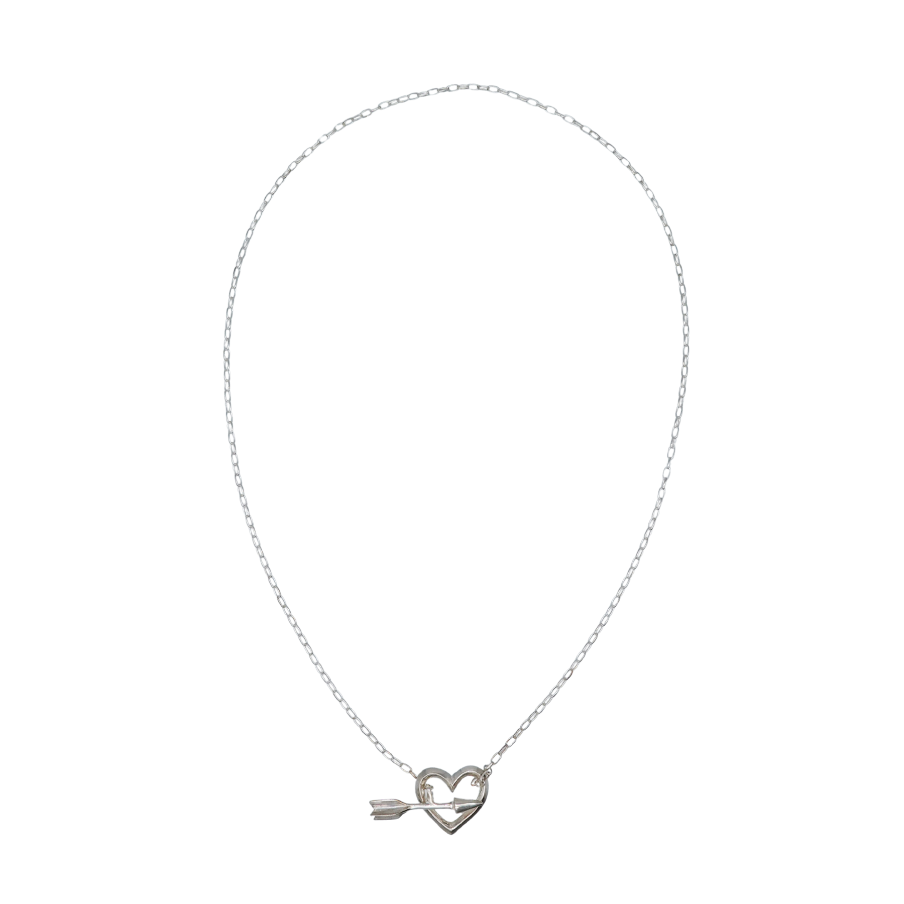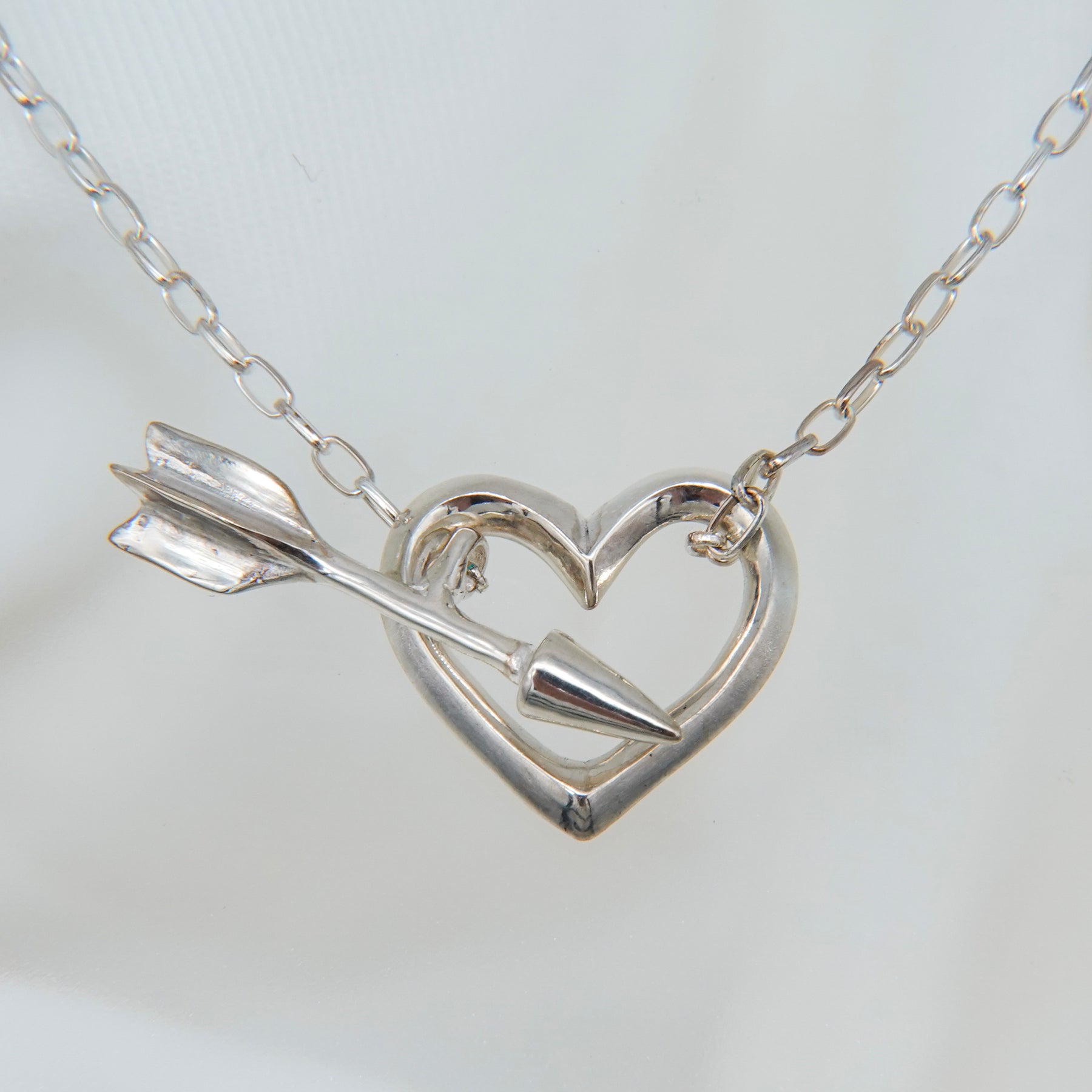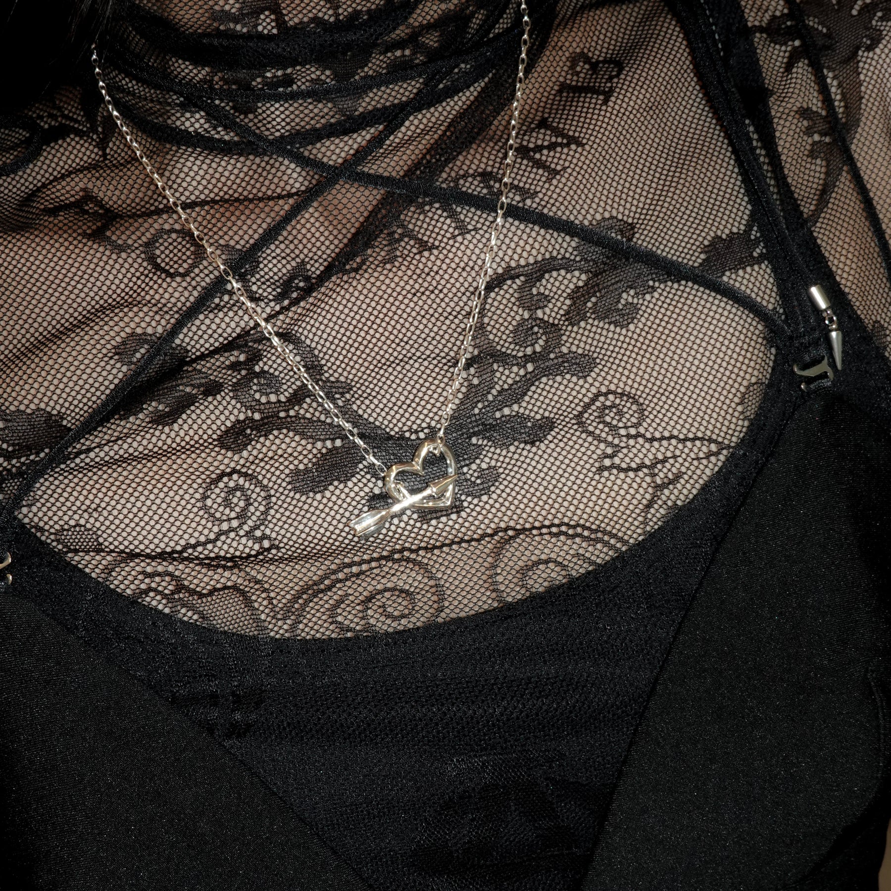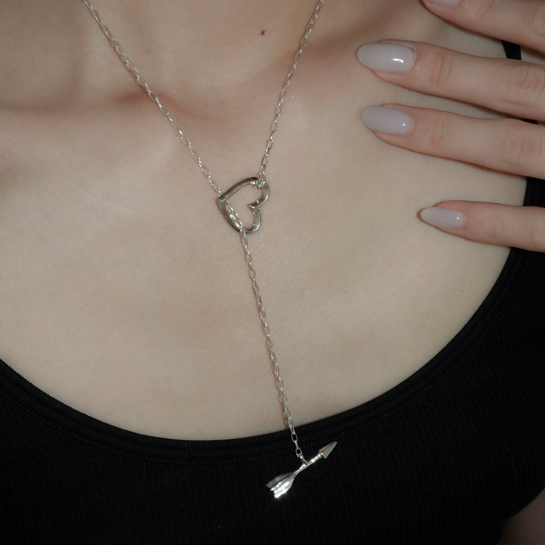細く繊細なチェーンと、結び目のように絡み合うハートと矢が、感情の複雑さと誠実さを静かに語ります。