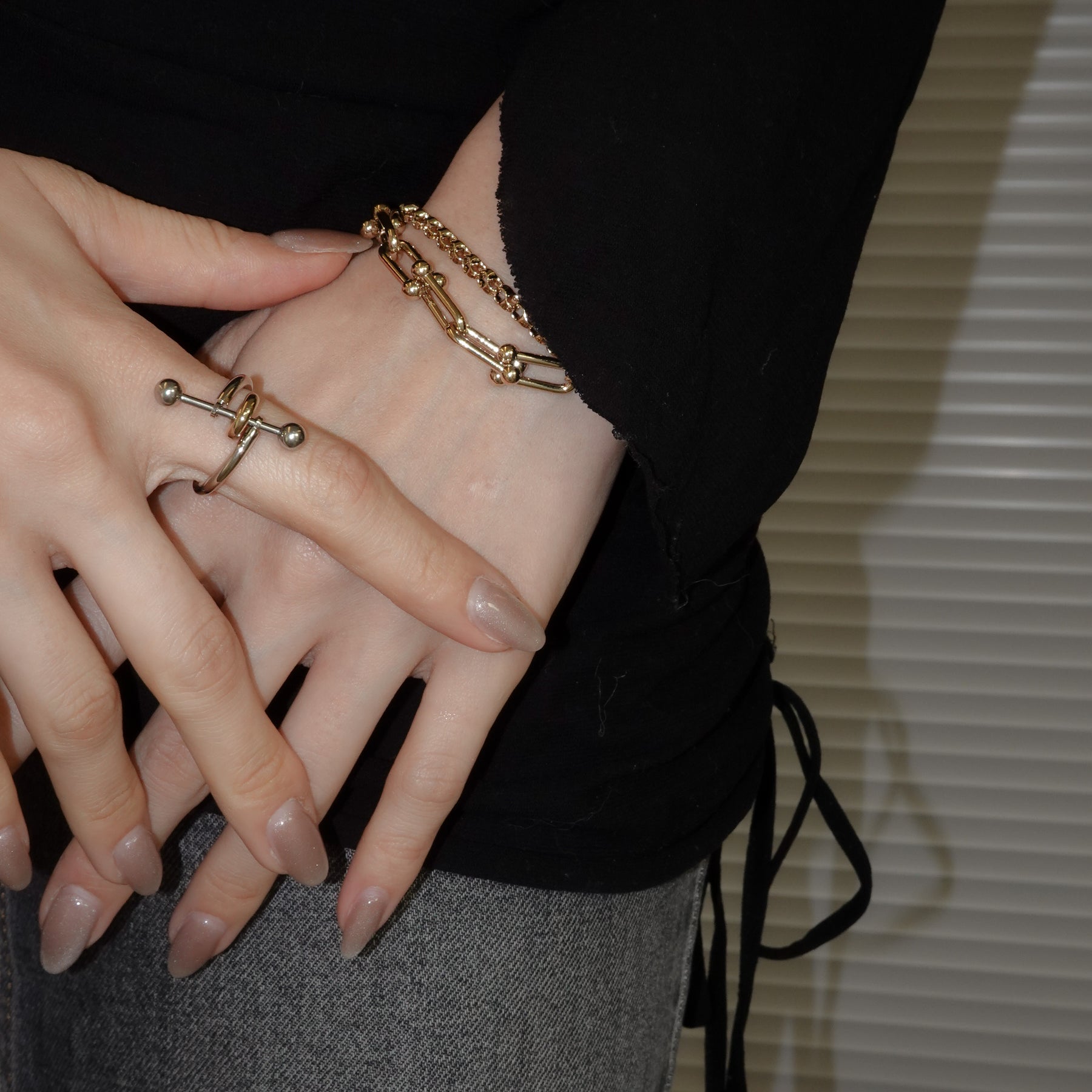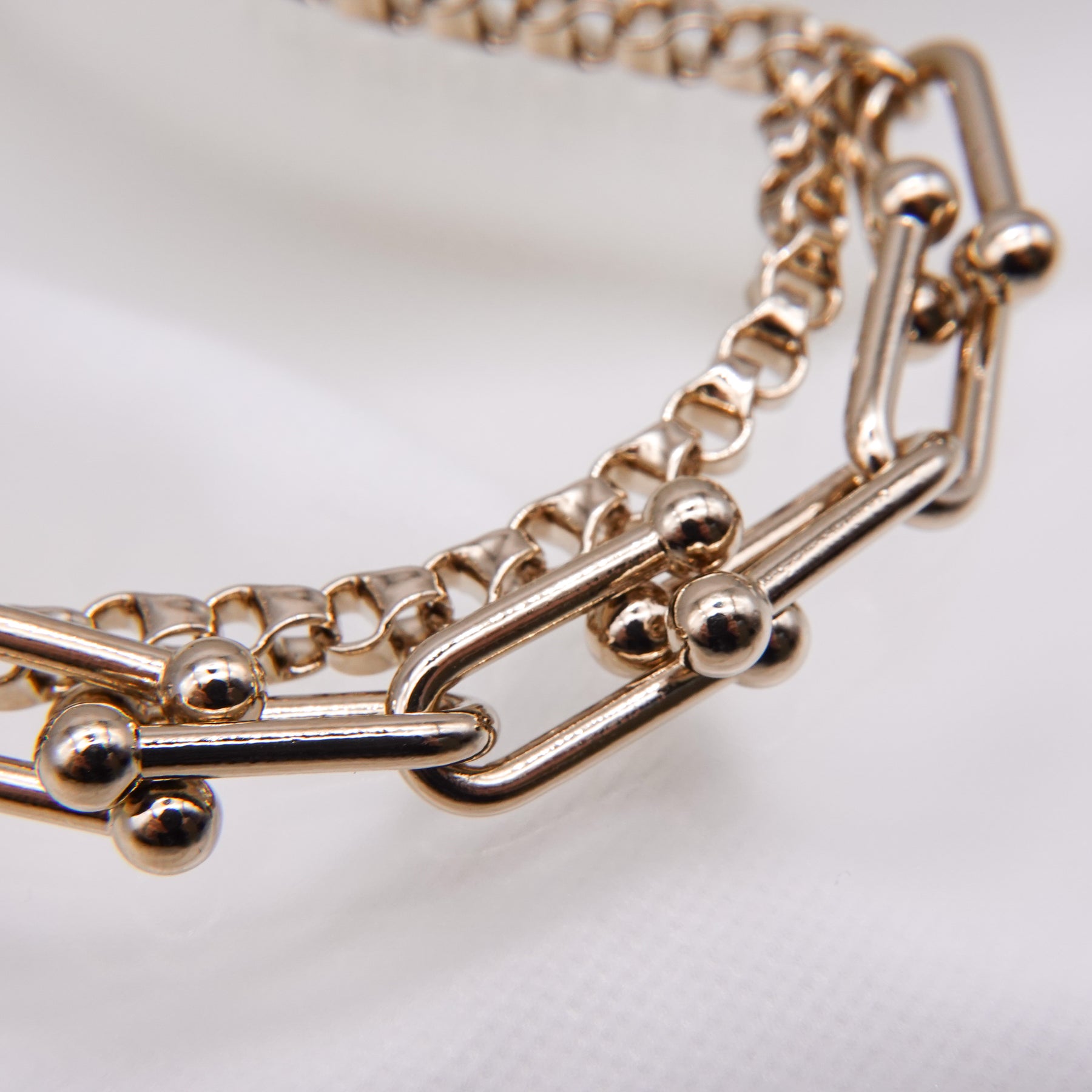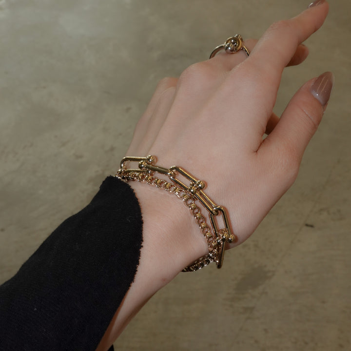 2種類のチェーンが組み合わされたシンプルながらユニークなデザインのブレスレット。