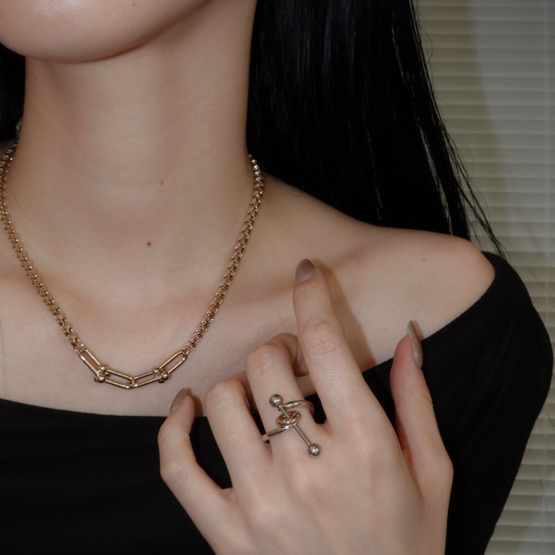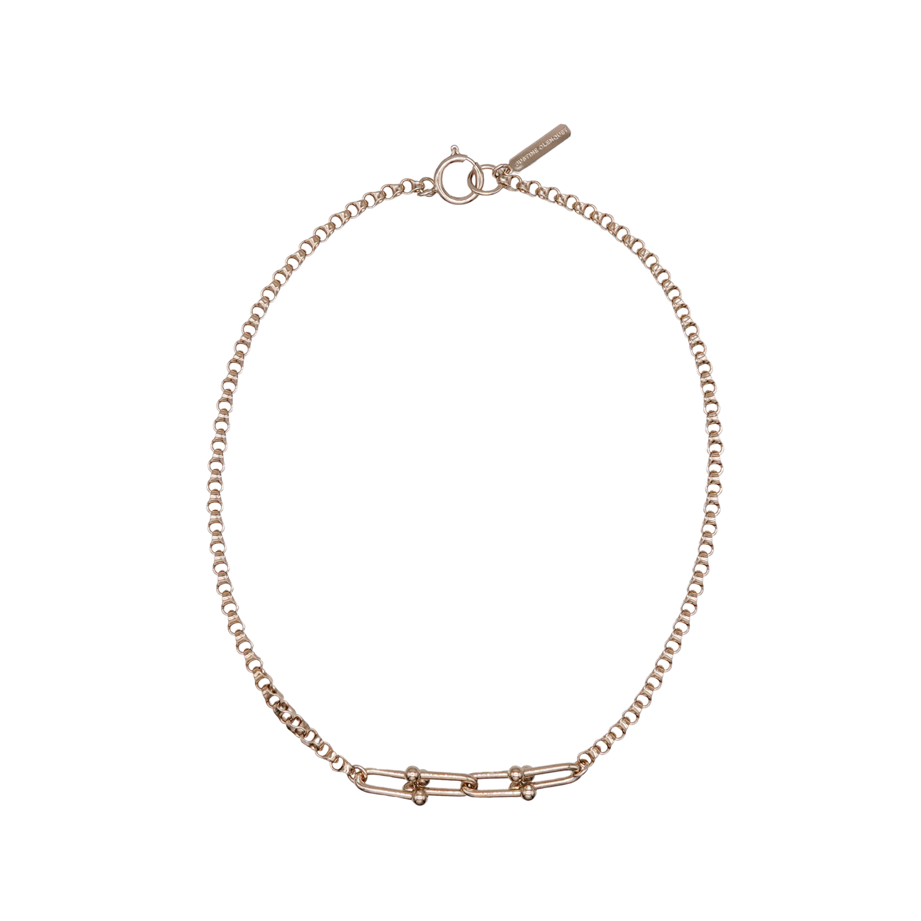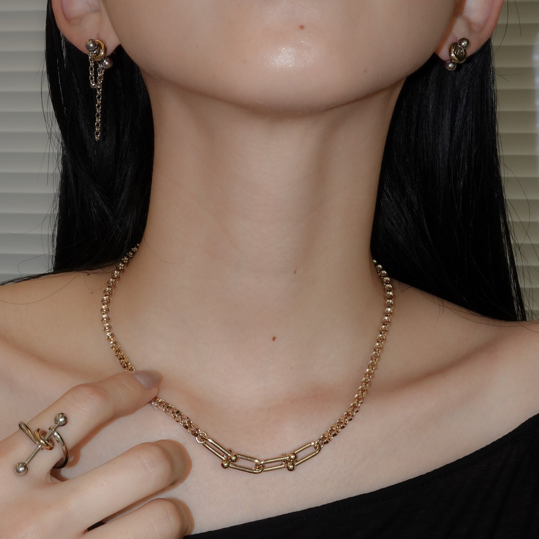 2種類のチェーンが組み合わされたシンプルながらユニークなデザインのネックレス。