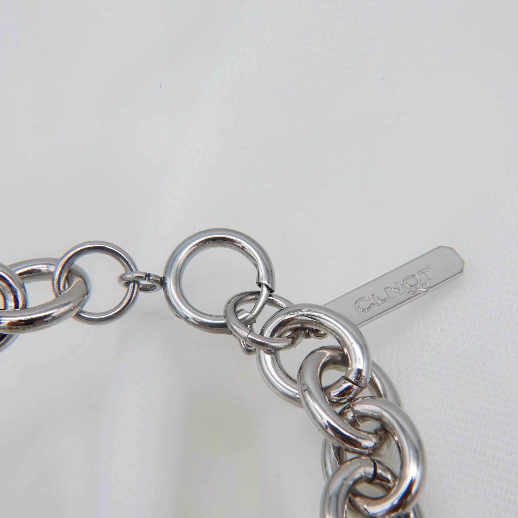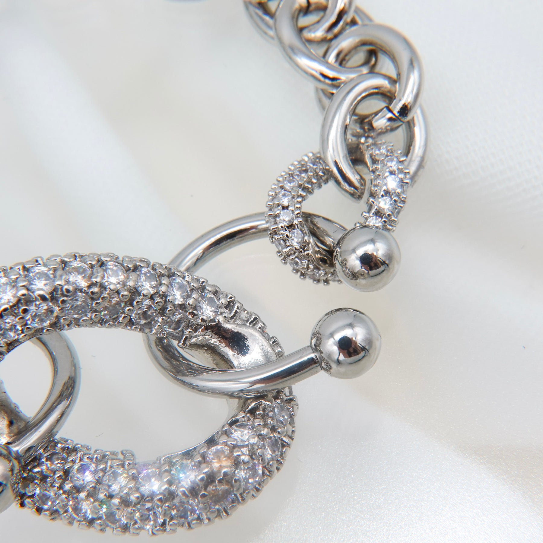 クリスタルガラスがたっぷりとセッティングされた大ぶりなチェーンのコマがコーディネートのアクセントになってくれるブレスレット。