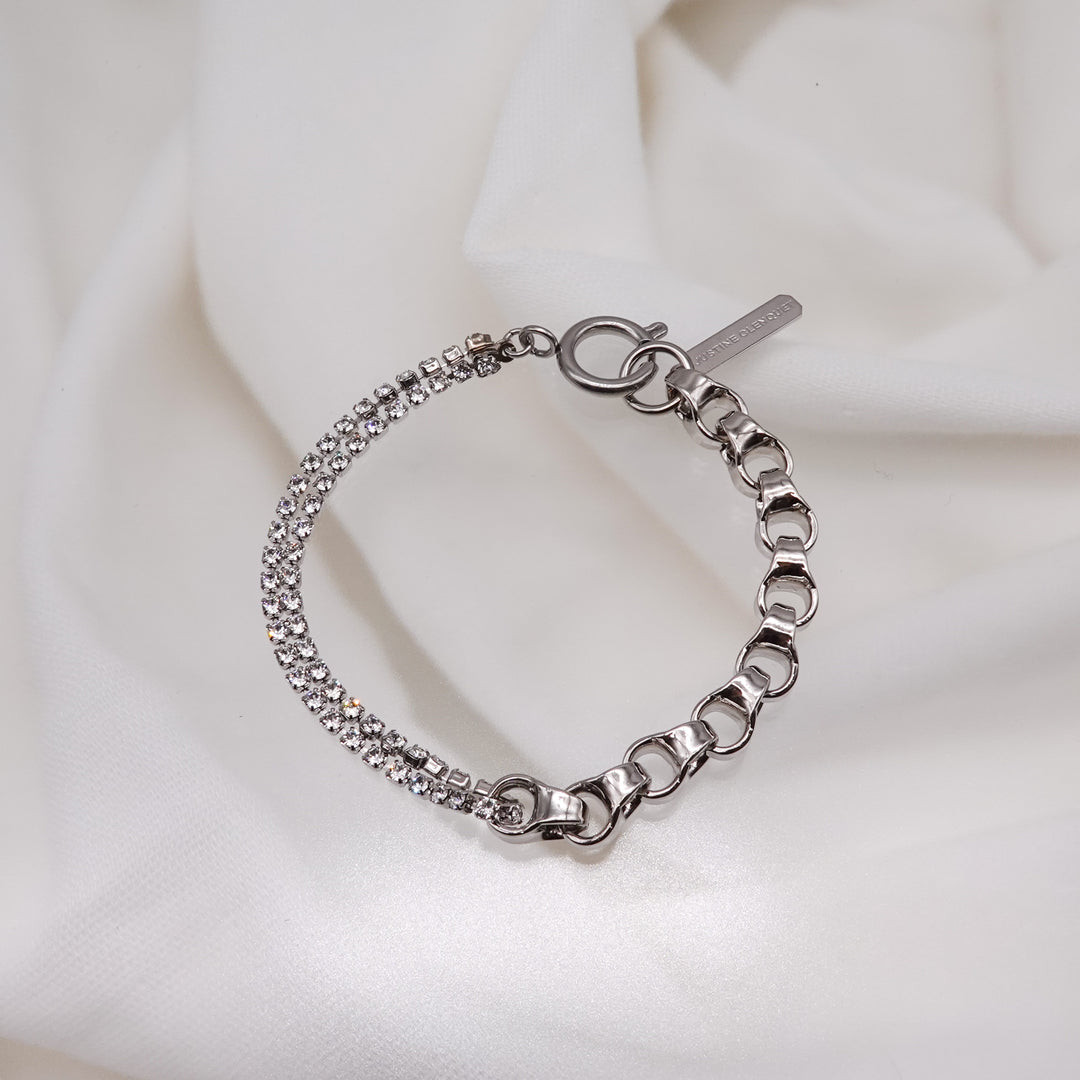 丸みのあるチェーンとクリスタルチェーンが組み合わされたブレスレット。ほどよい輝きであらゆるファッションに合わせやすいアイテムです。