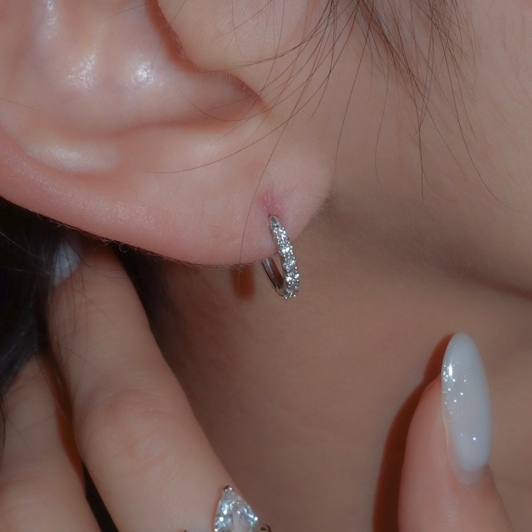 シンプルなダイヤフープピアス。表面は緩やかに丸みを持たせ、優しい印象に。