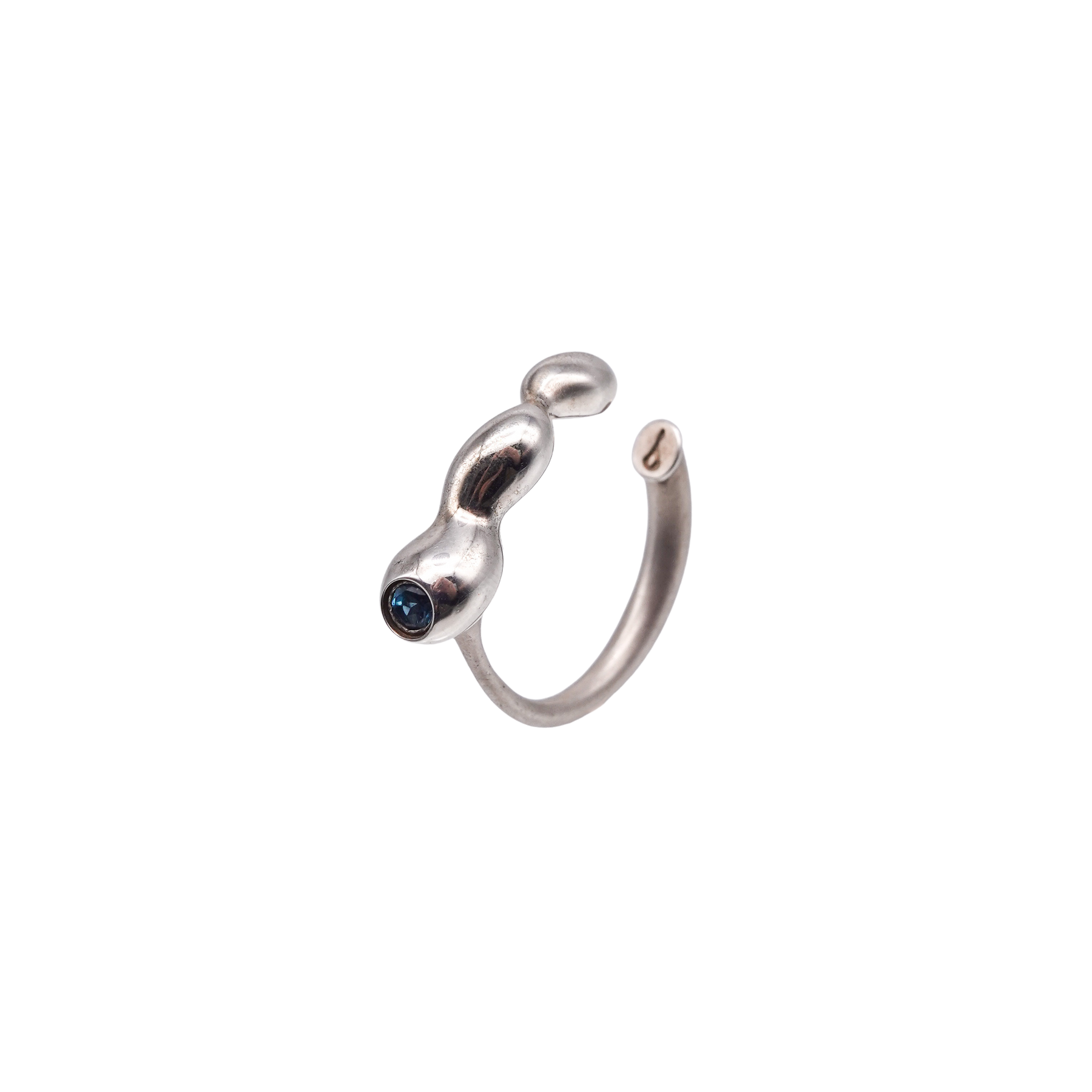 ブロブアーキテクチャ(有機的なアメーバ型の形態を持つ建築)からインスピレーションを得たオープンリング。さりげなくストーンが留められています。モチーフ部分は鏡面仕上げ、アーム部分はマット仕上げ。イヤカフとしてもお使いいただけます。