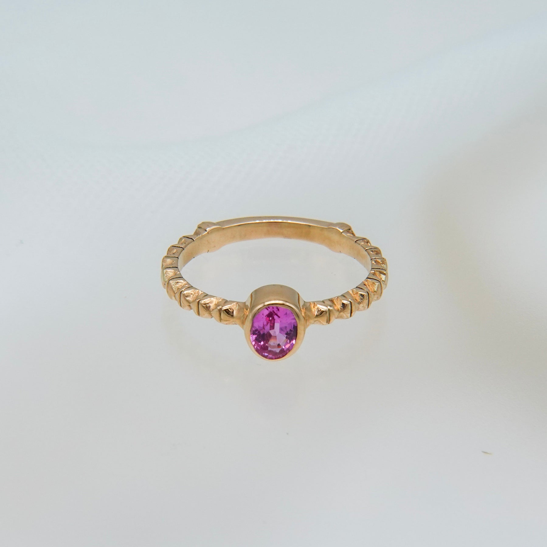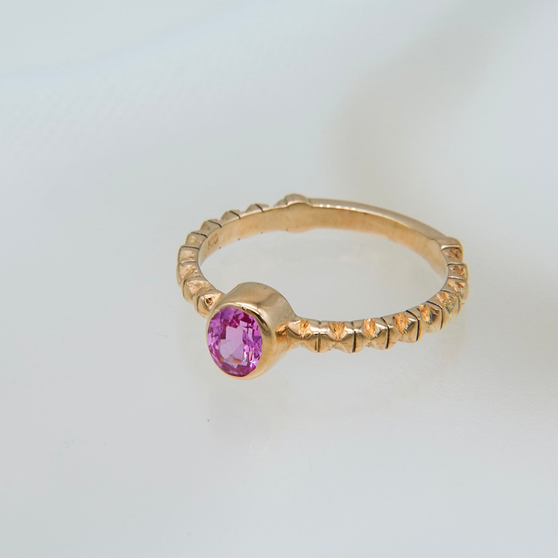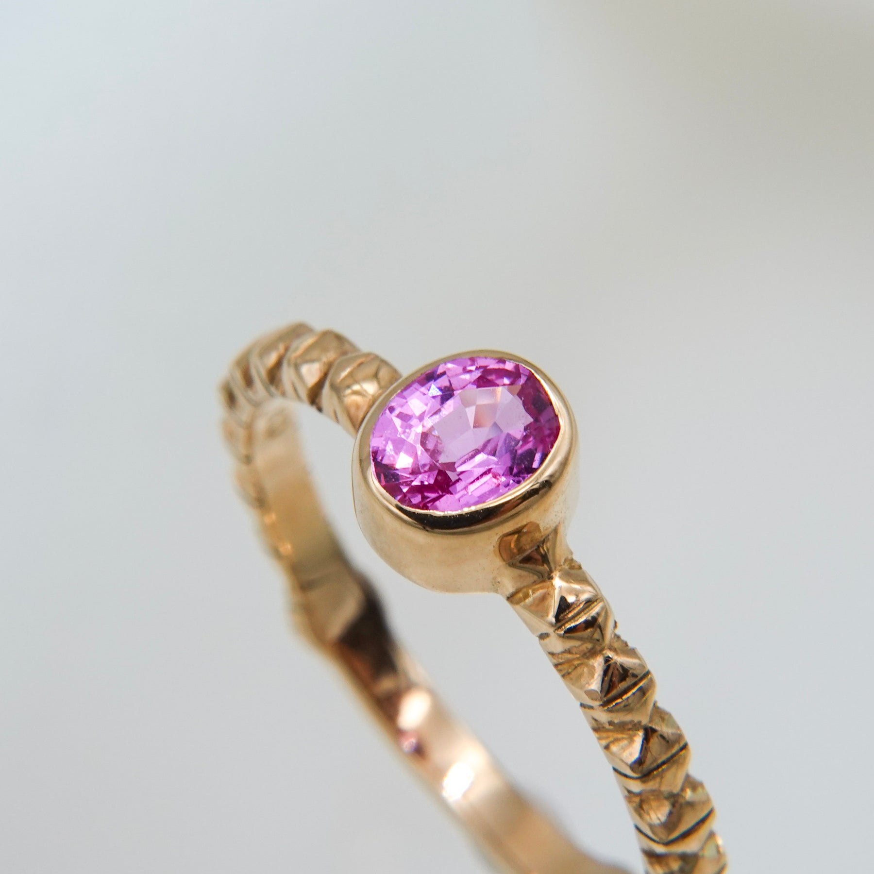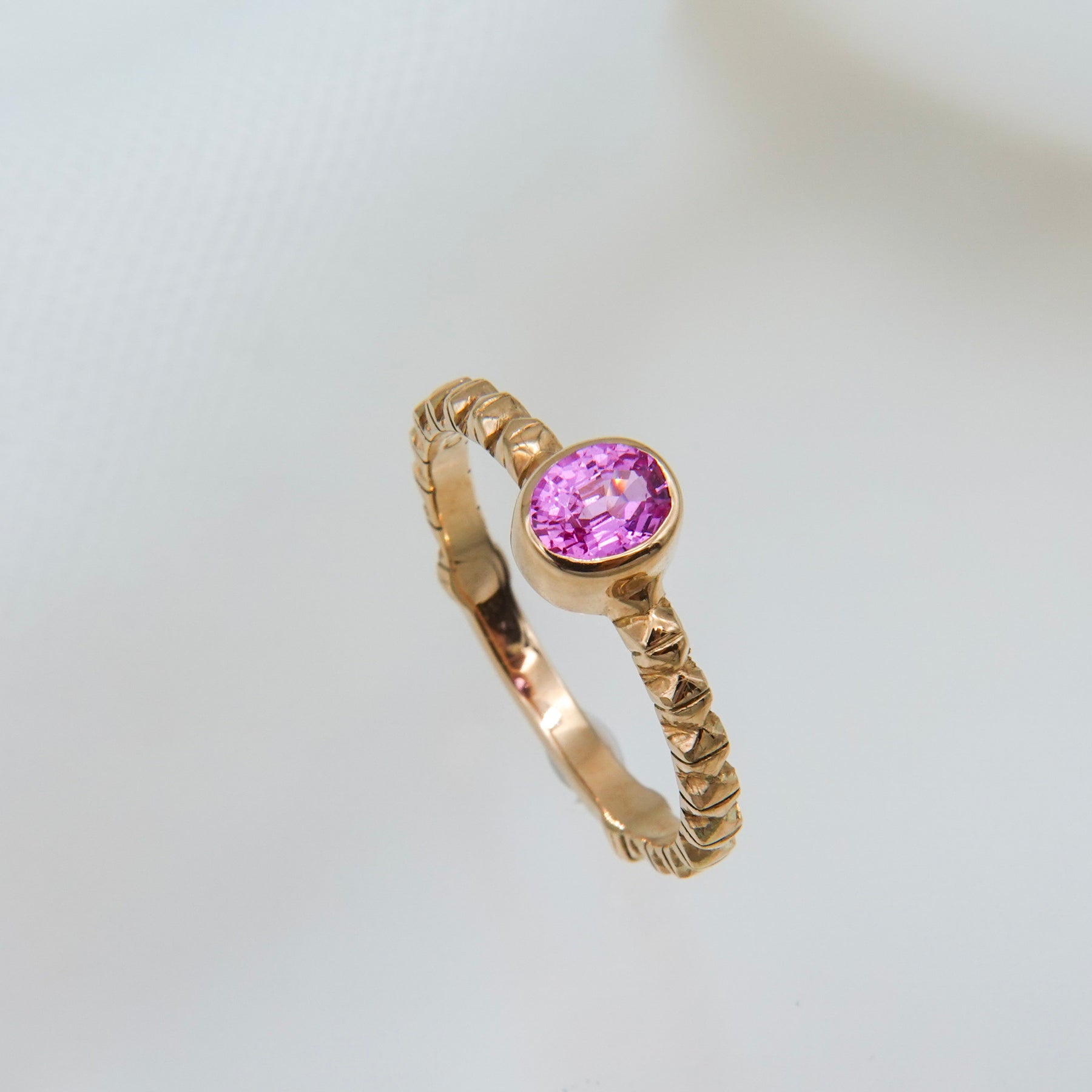 イタリア・フィレンツェの伝統技法、フィレンツェ彫りを施したサファイアのリング。 オーバルカットの鮮やかなピンクのサファイヤ。 アームには全ての仕上げ後に手彫りによる彫りが施されており、全体に石が入っている様な煌めきがあります。 8号〜16号までサイズ直しが可能です(納期約1ヶ月)。ご希望の場合はお問い合わせください。