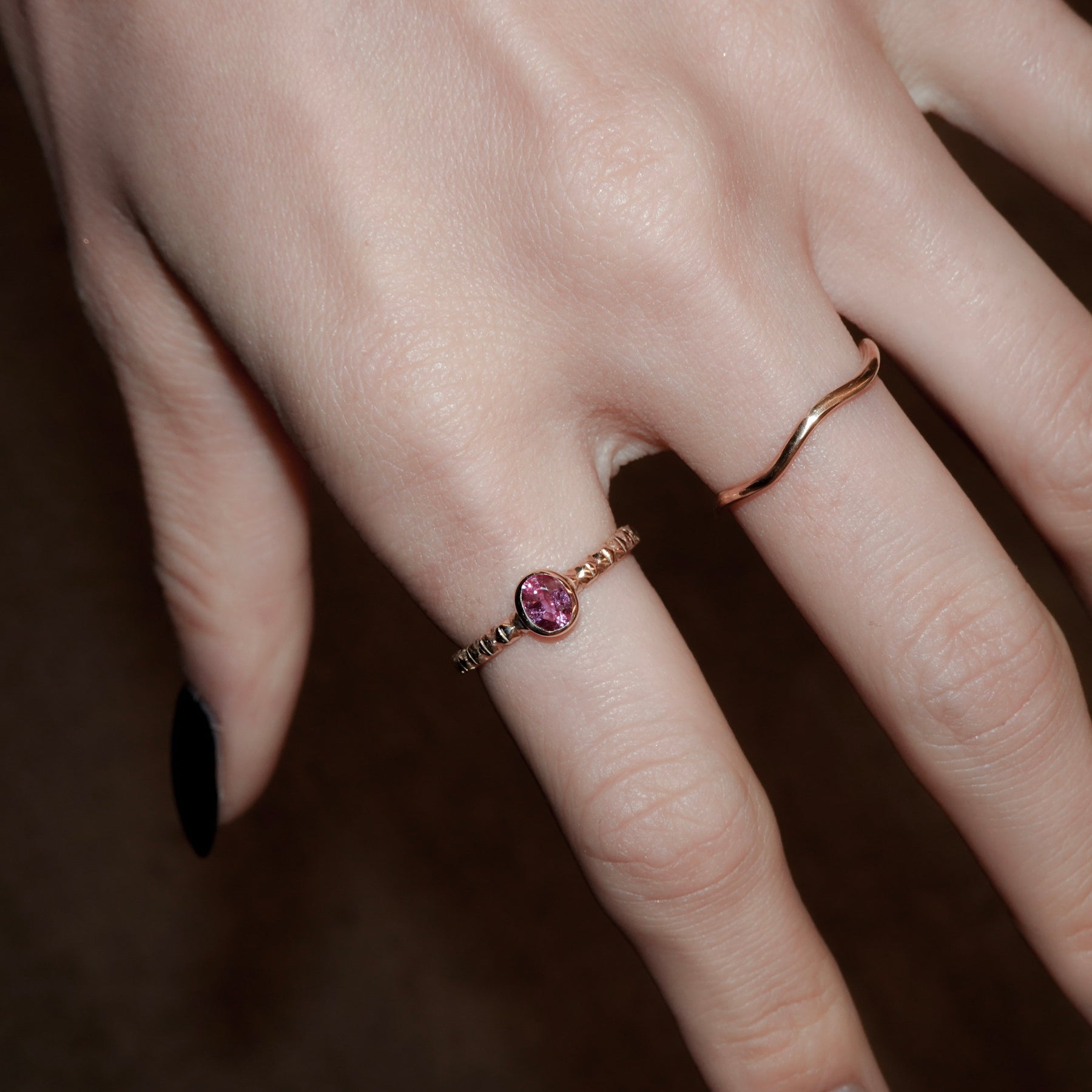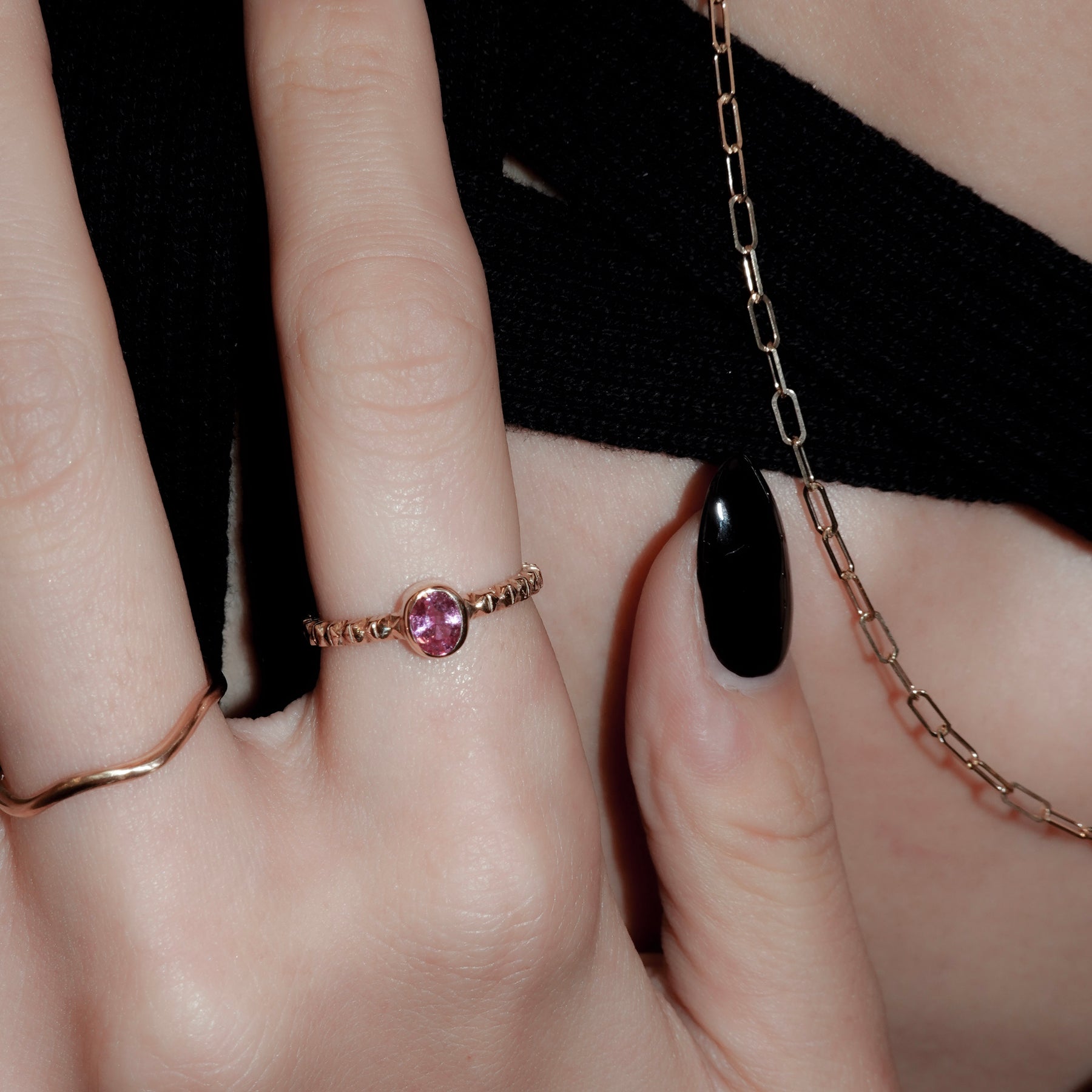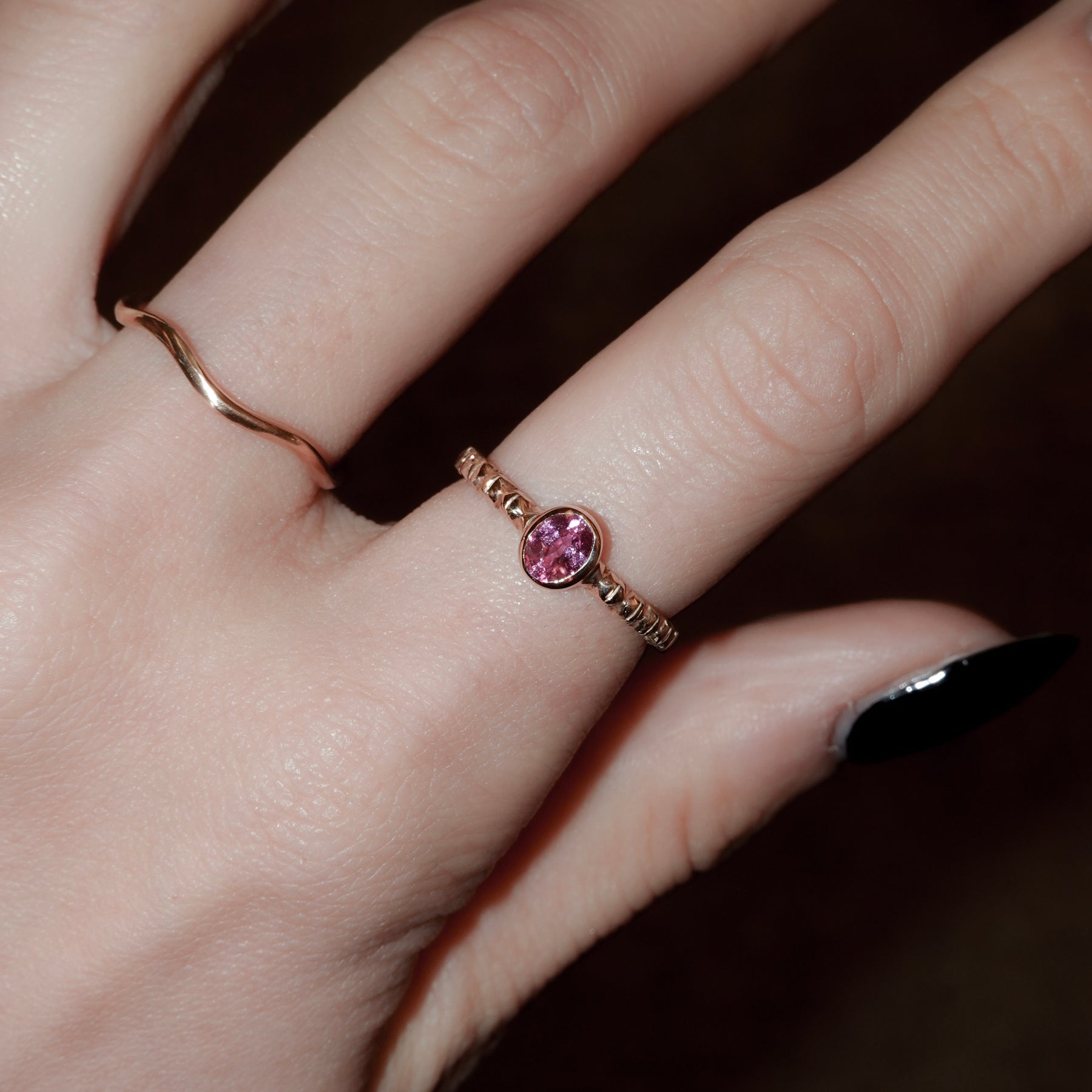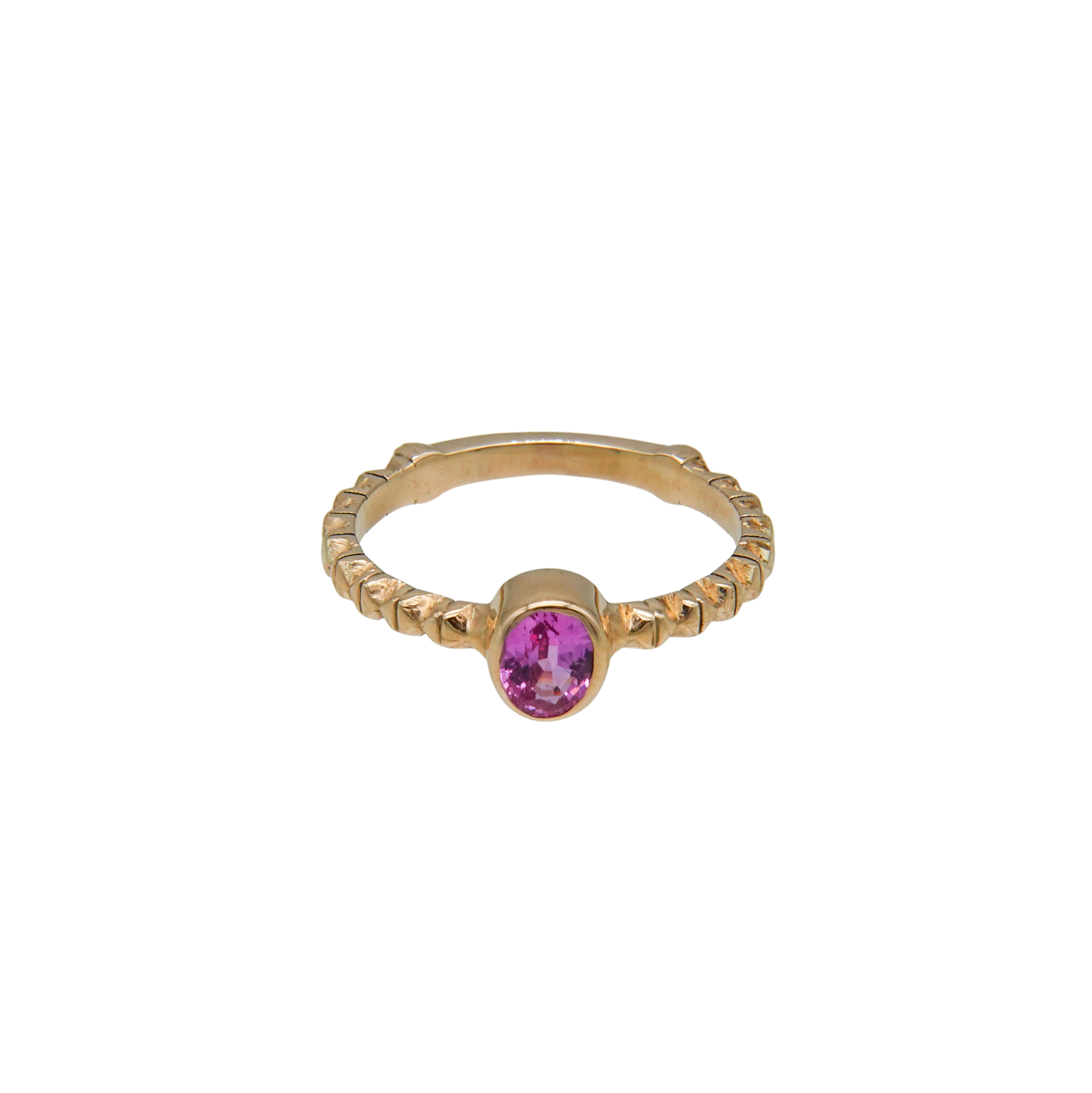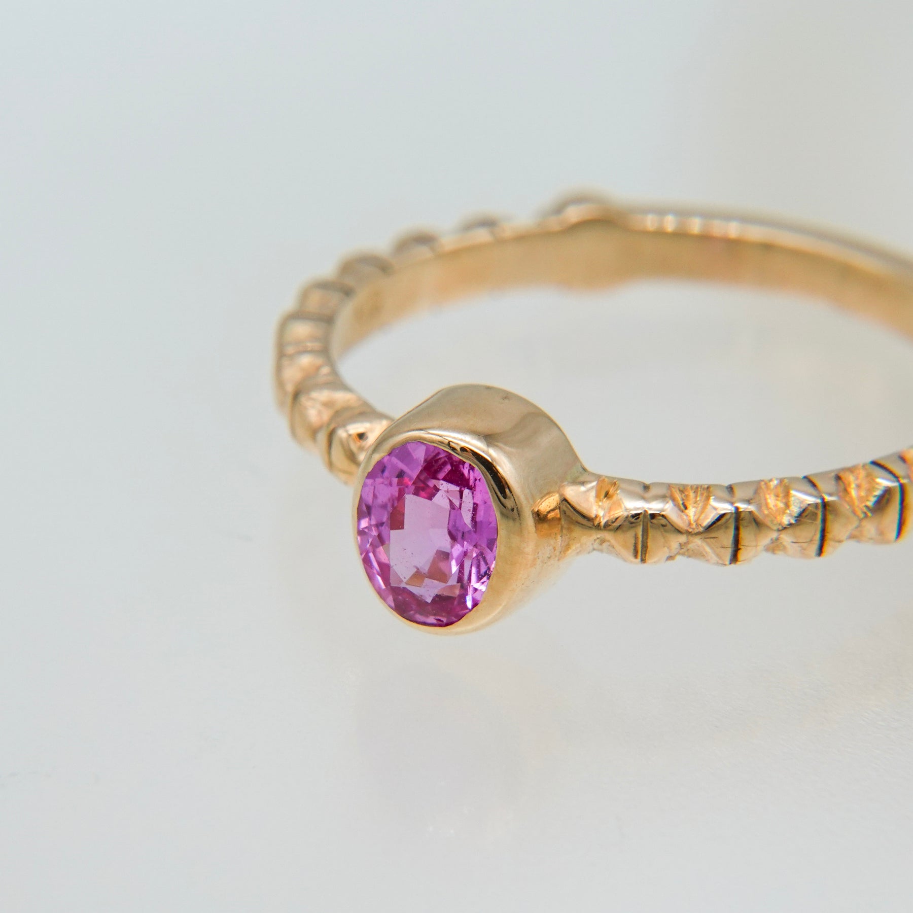 イタリア・フィレンツェの伝統技法、フィレンツェ彫りを施したサファイアのリング。 オーバルカットの鮮やかなピンクのサファイヤ。 アームには全ての仕上げ後に手彫りによる彫りが施されており、全体に石が入っている様な煌めきがあります。 8号〜16号までサイズ直しが可能です(納期約1ヶ月)。ご希望の場合はお問い合わせください。
