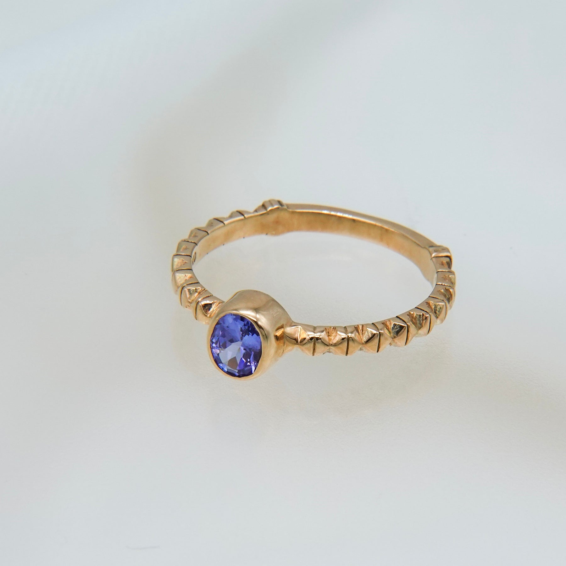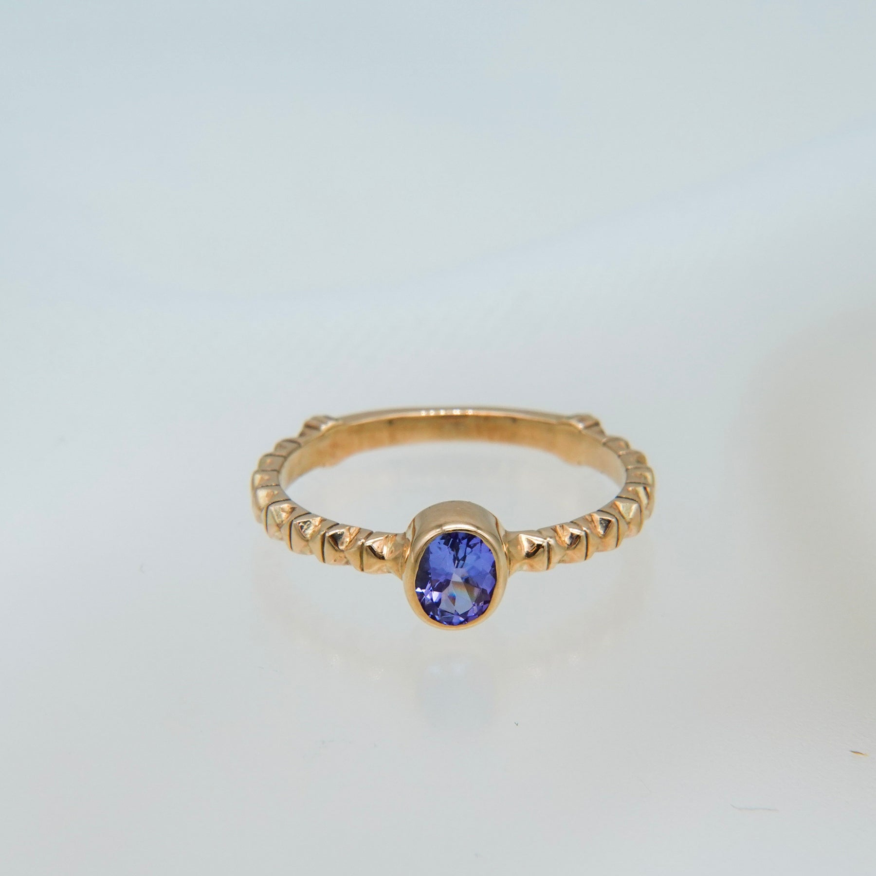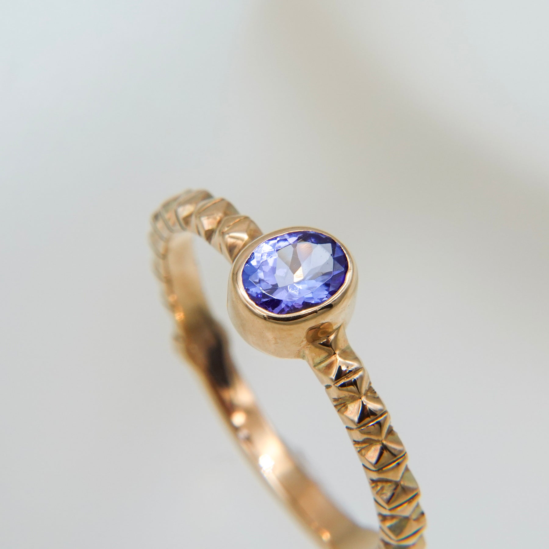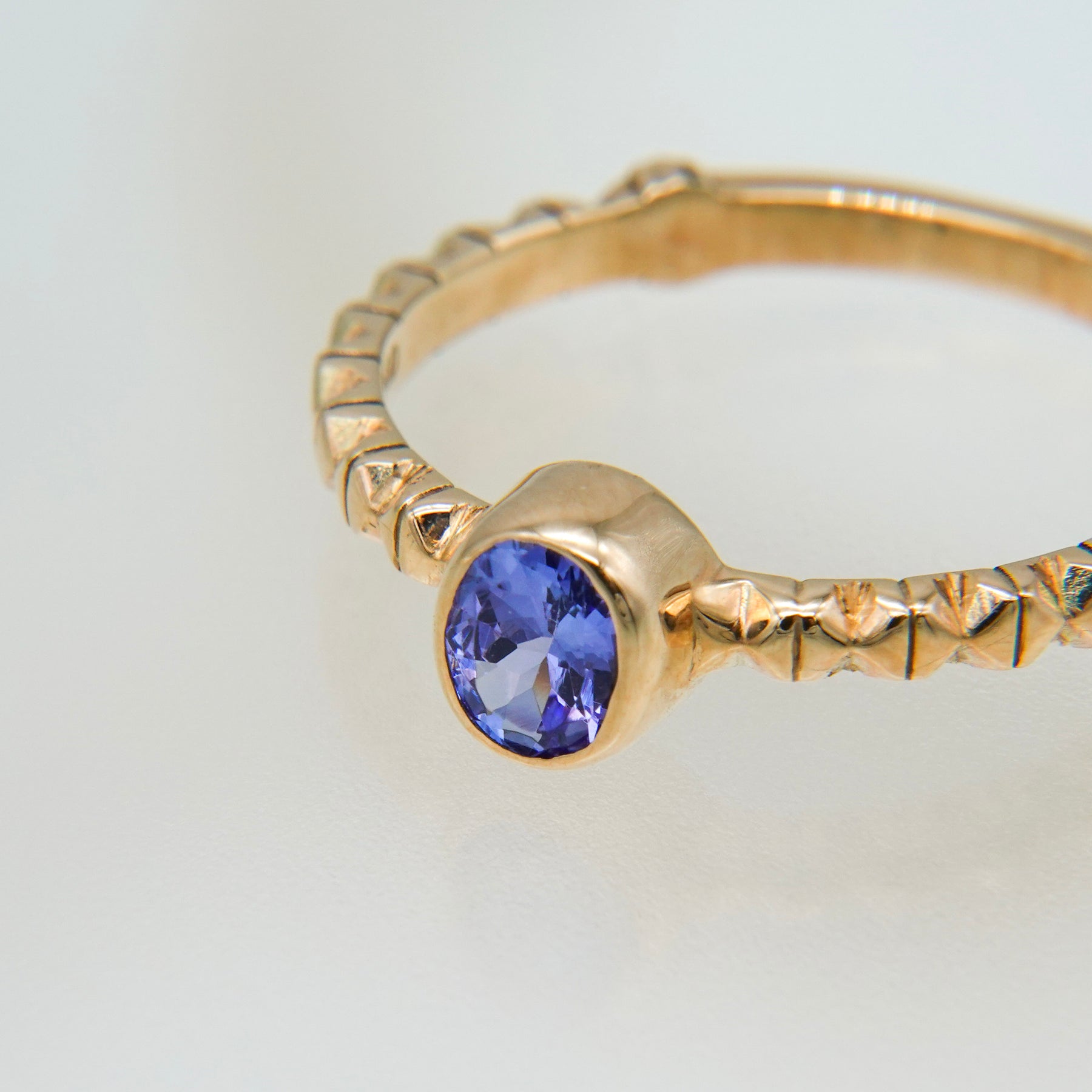 イタリア・フィレンツェの伝統技法、フィレンツェ彫りを施したタンザナイトのリング。 オーバルカットのパープルがかった深みのあるブルーのタンザナイト。 アームには全ての仕上げ後に手彫りによる彫りが施されており、全体に石が入っている様な煌めきがあります。 8号〜16号までサイズ直しが可能です(納期約1ヶ月)。ご希望の場合はお問い合わせください。