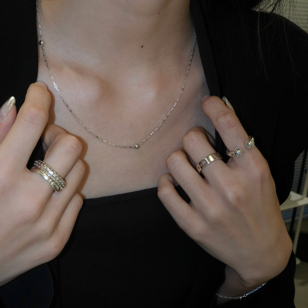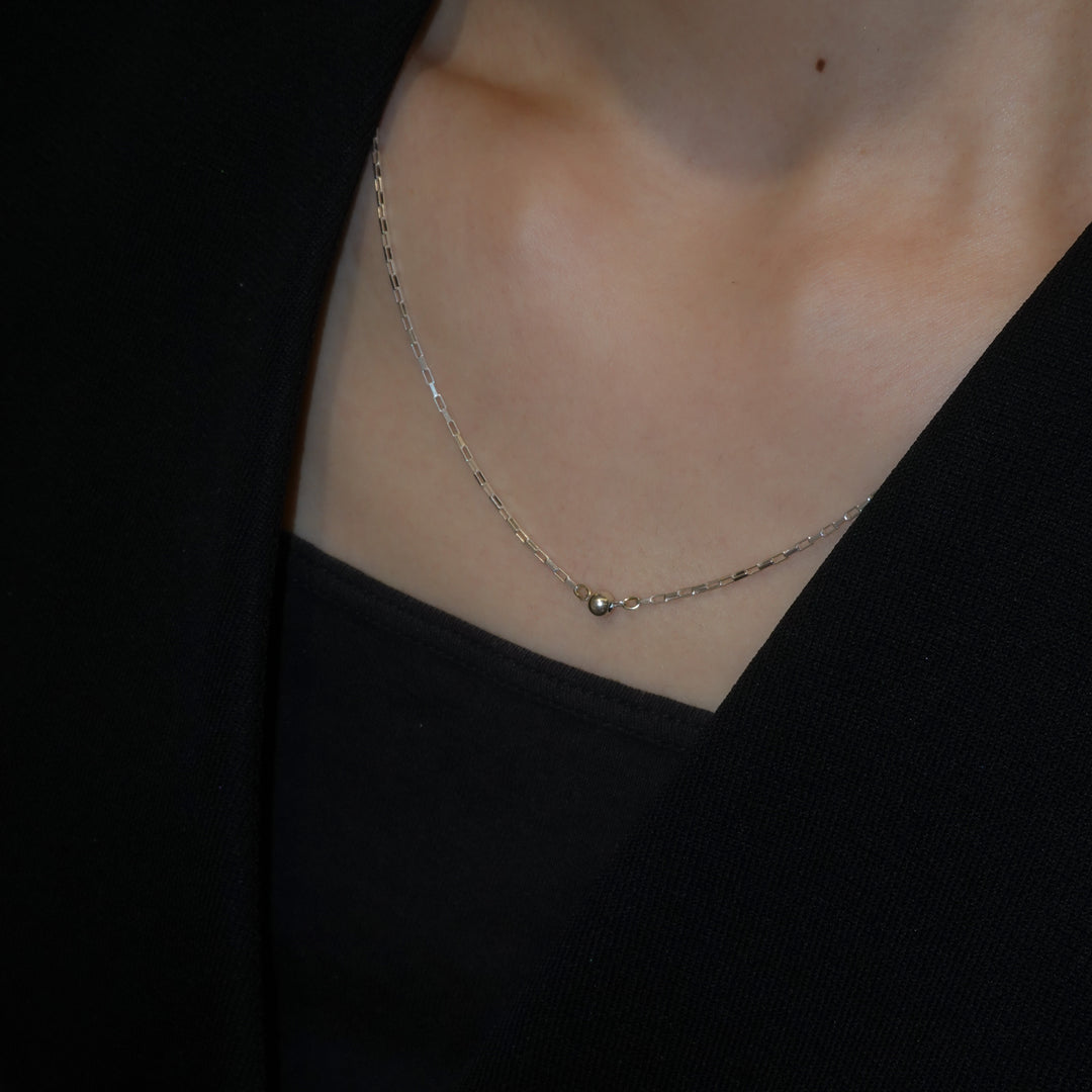 スクエアチェーンにボールディテールをあしらったネックレス。留め具の位置でサイズ調整が可能です。男女を問わずお使いいただけるユニセックスアイテム。