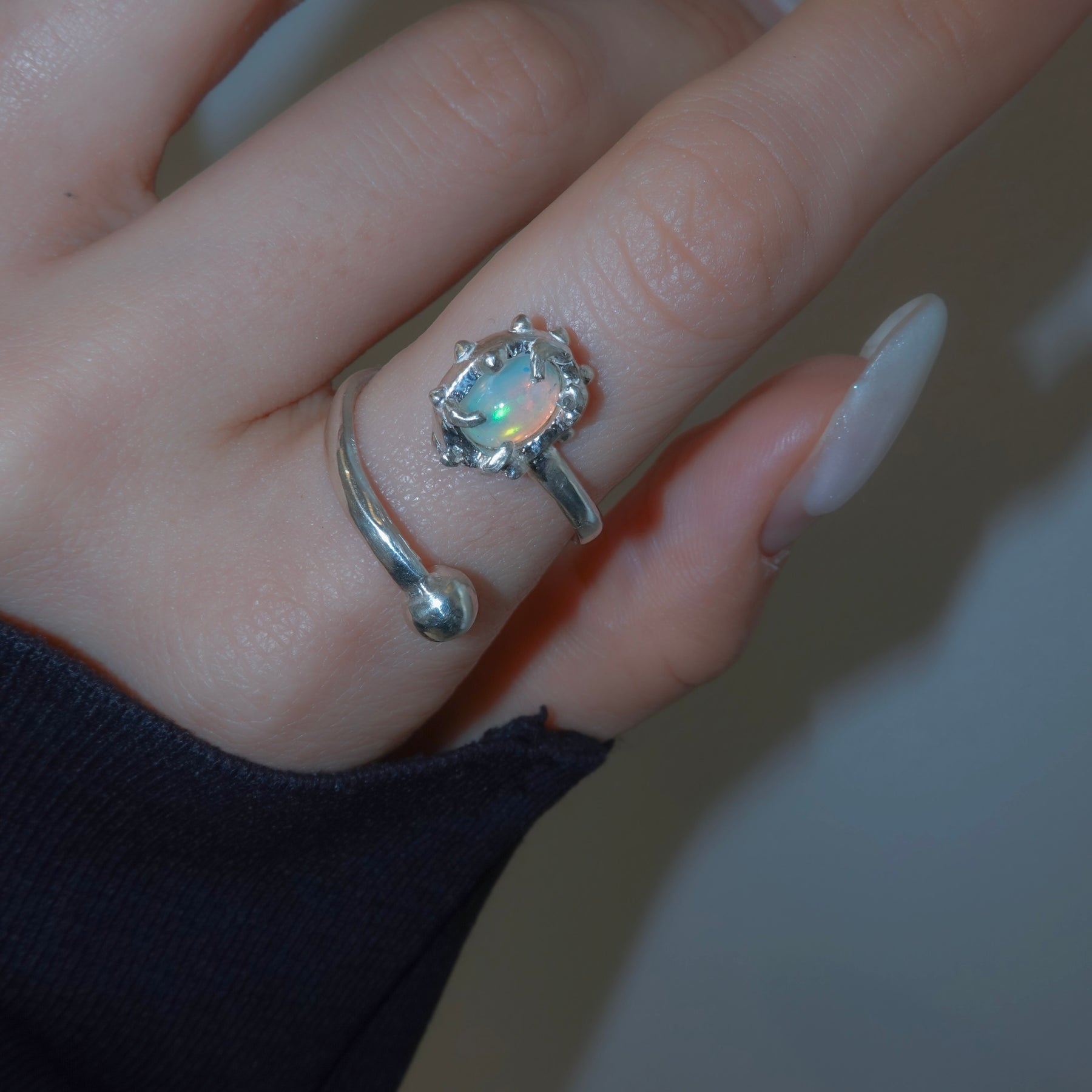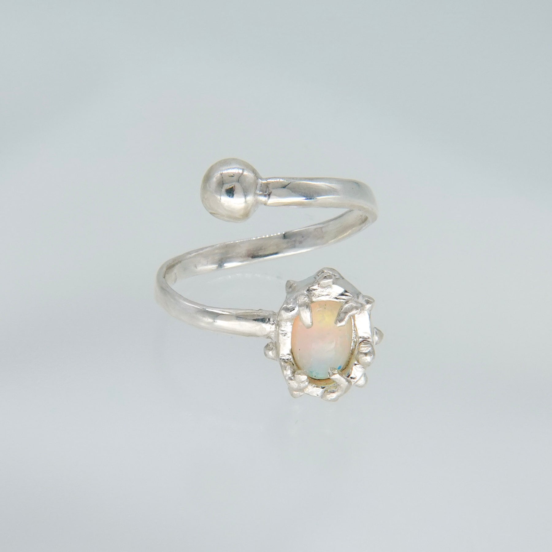 惑星をぐるりと巡る軌道のようなスパイラル状のリング。石は傾けると青く遊色が煌めくオパール。アートピースのような一点ものです。