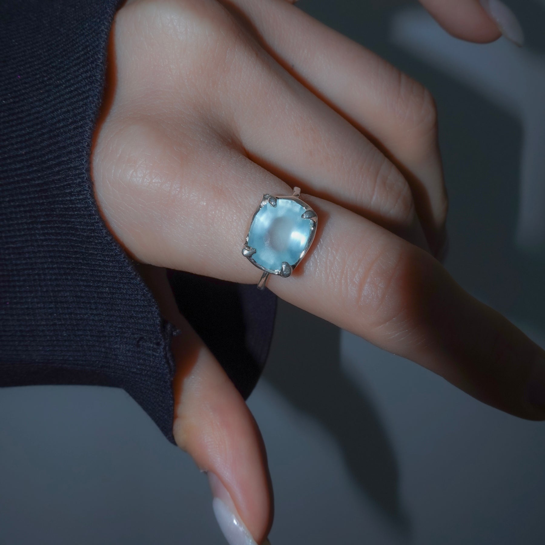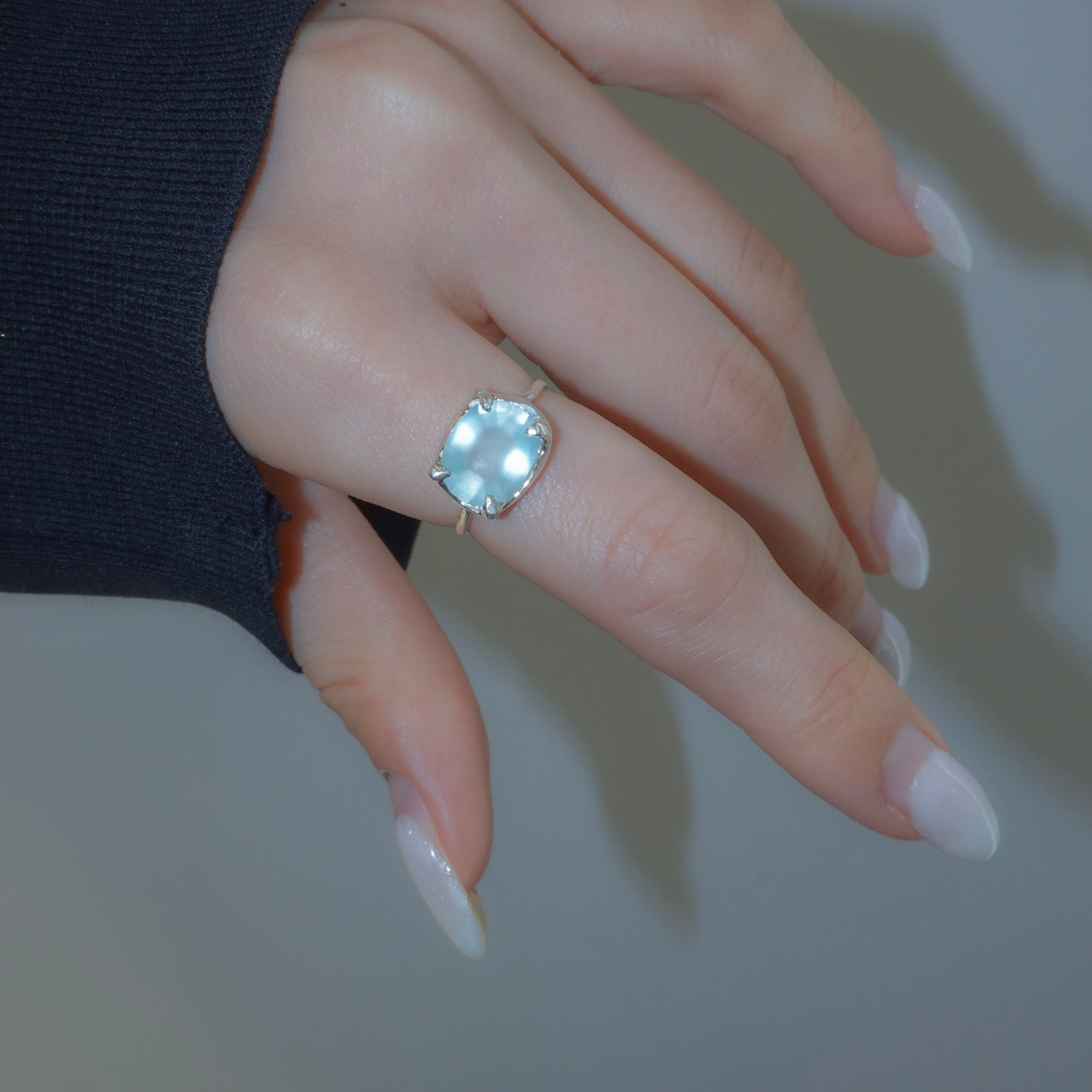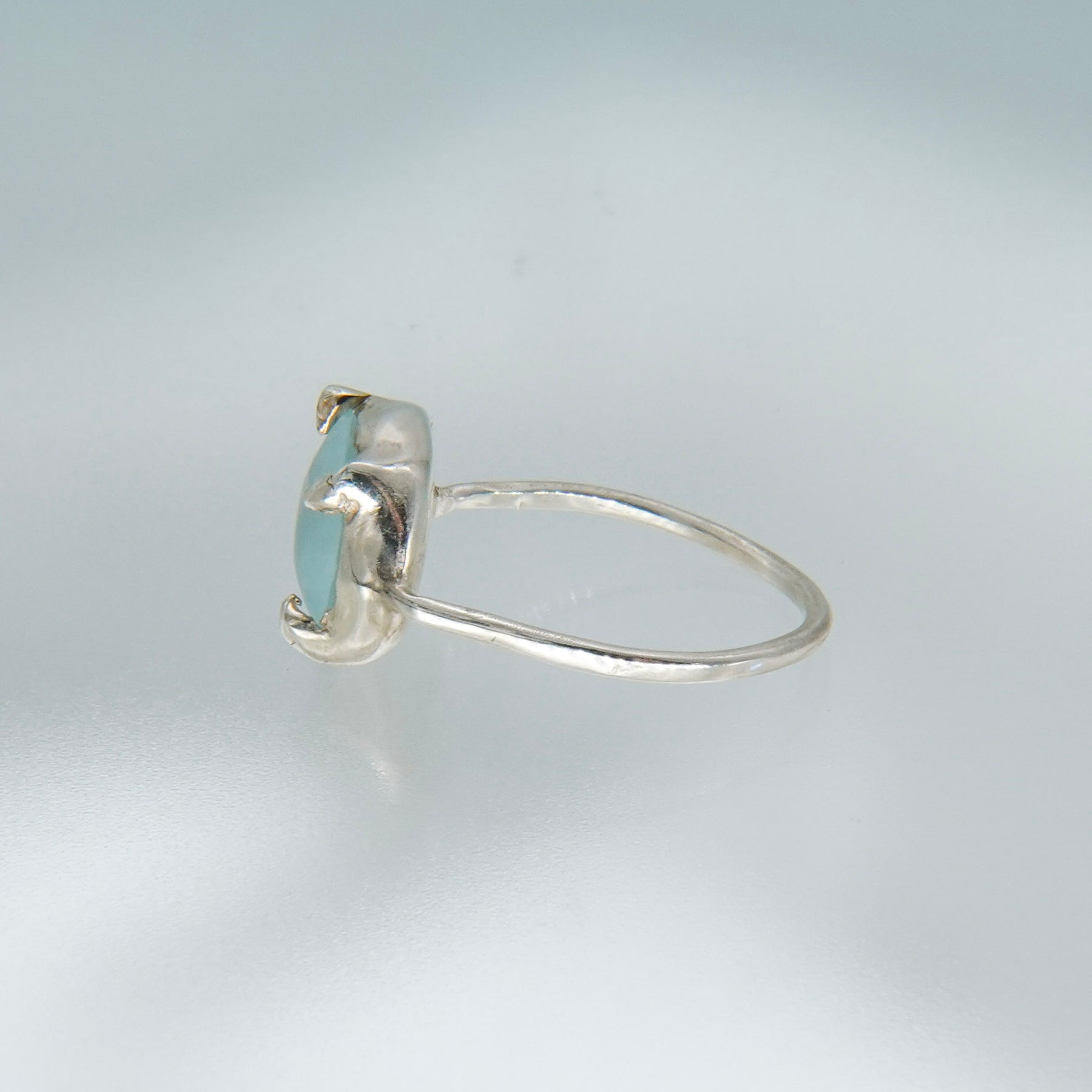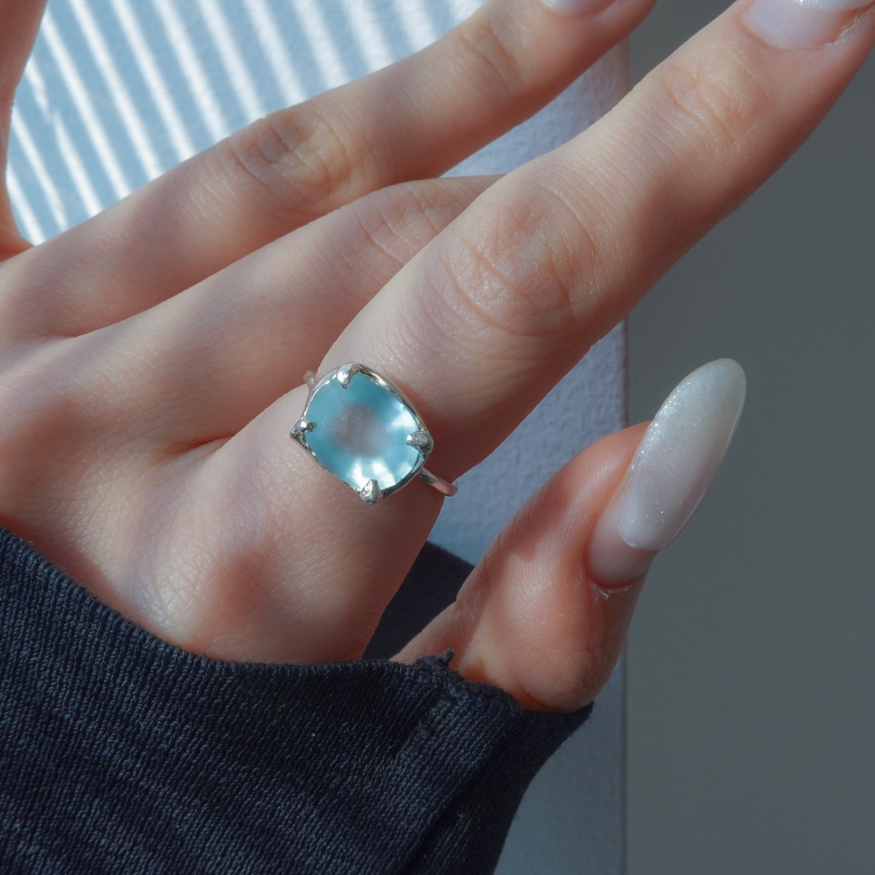 波に削られ、時をかけて丸くなったシーグラスを留めたリング。海と風が生んだひとつとして同じもののない形を指先に。静かで穏やかな時間を思い出させてくれる、海からの贈り物です。