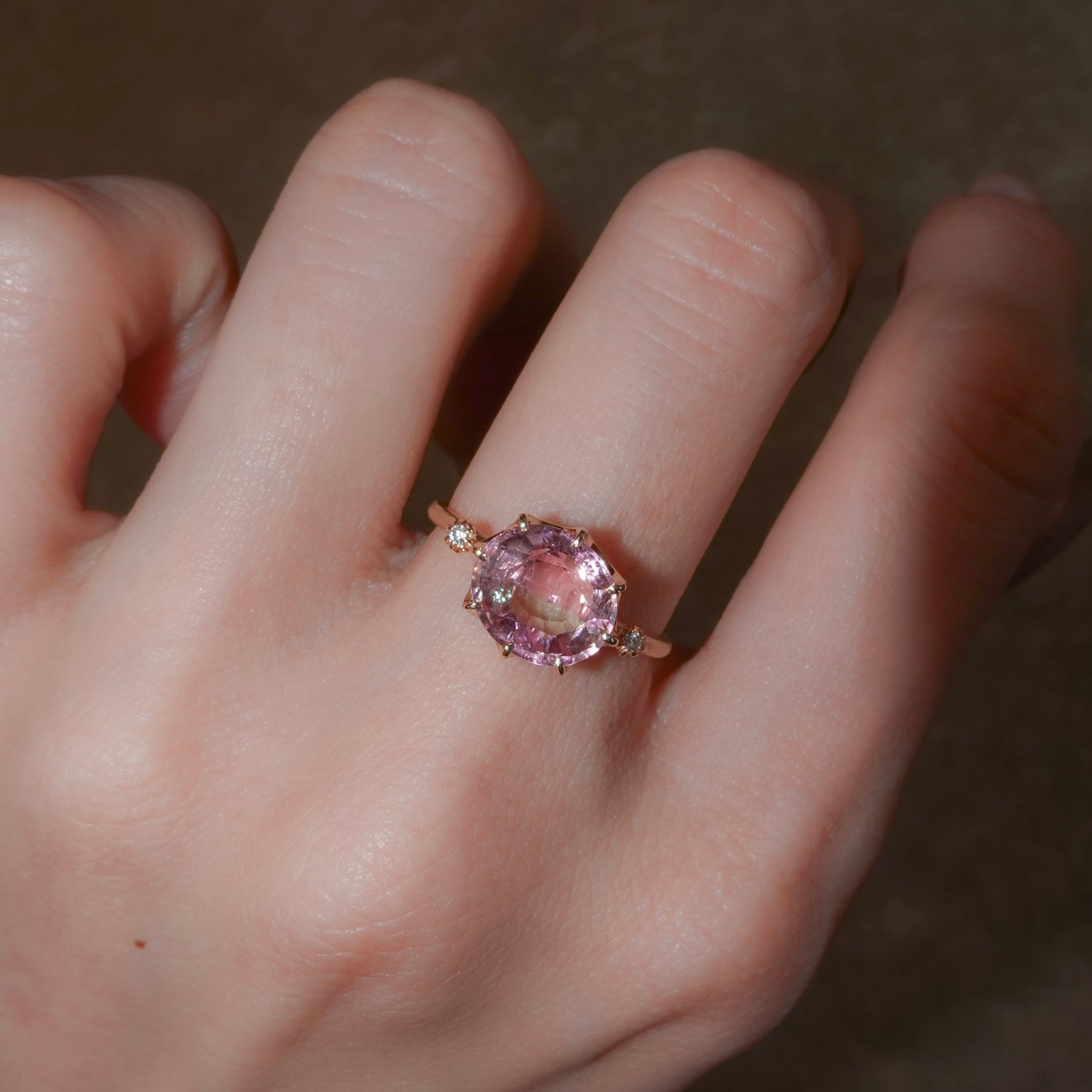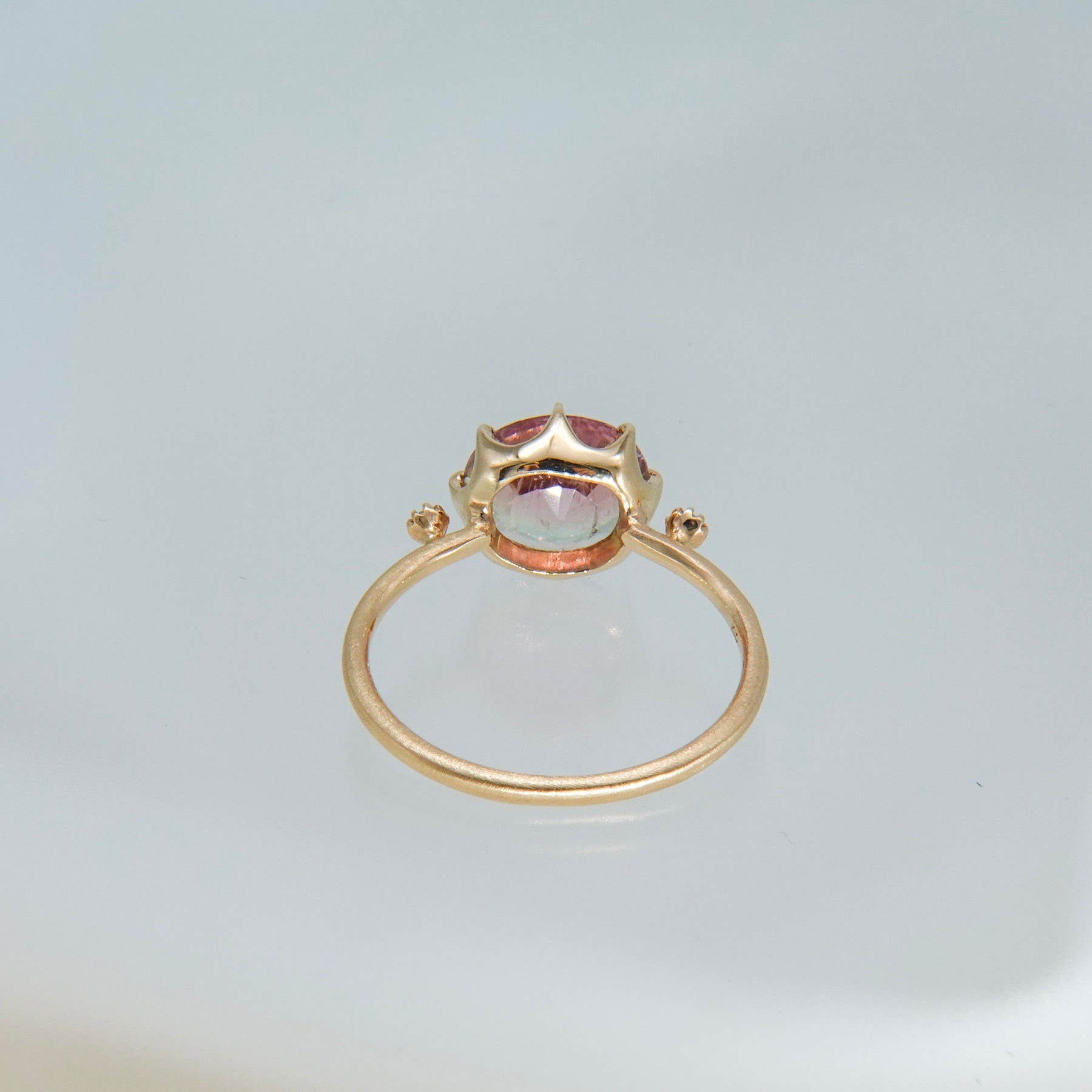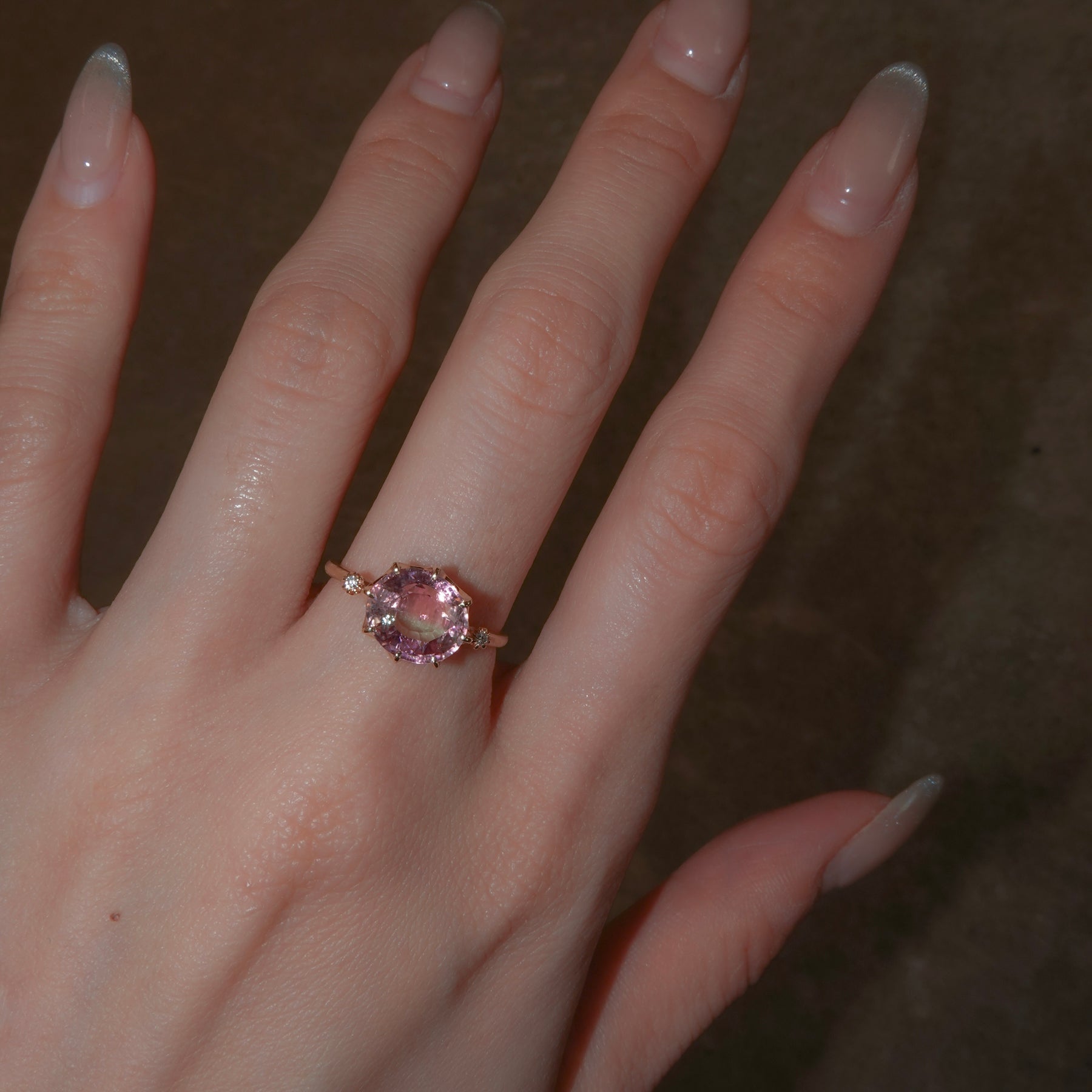 バイカラートルマリンのリング。ピンクとクリアトーンが一つの石の中に見られるバイカラートルマリンで、色の移ろいによる軽やかな表情が特徴です。メインストーンの両サイドにはメレダイヤを配し、リングアームは幅1.5mmのマットゴールド仕上げ。