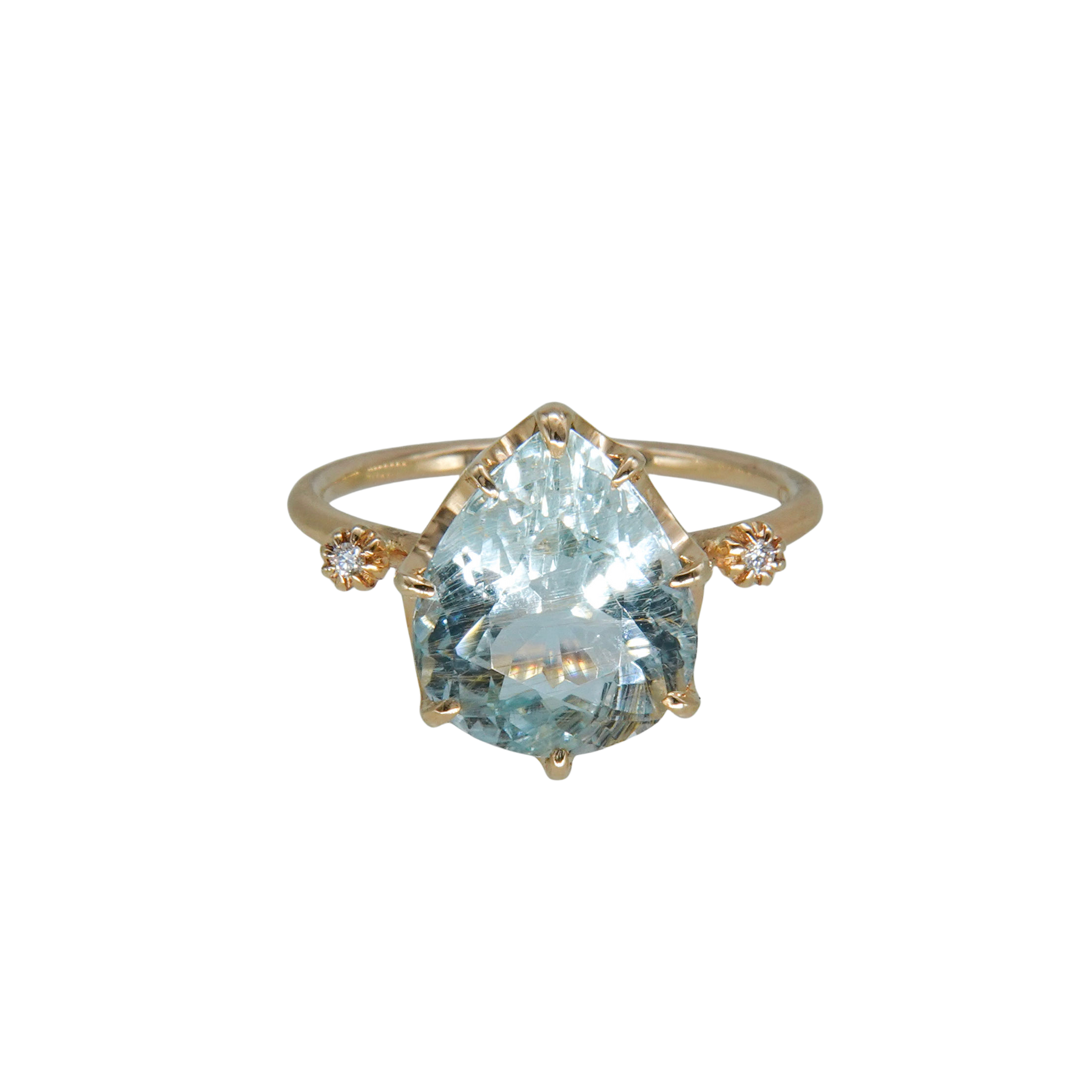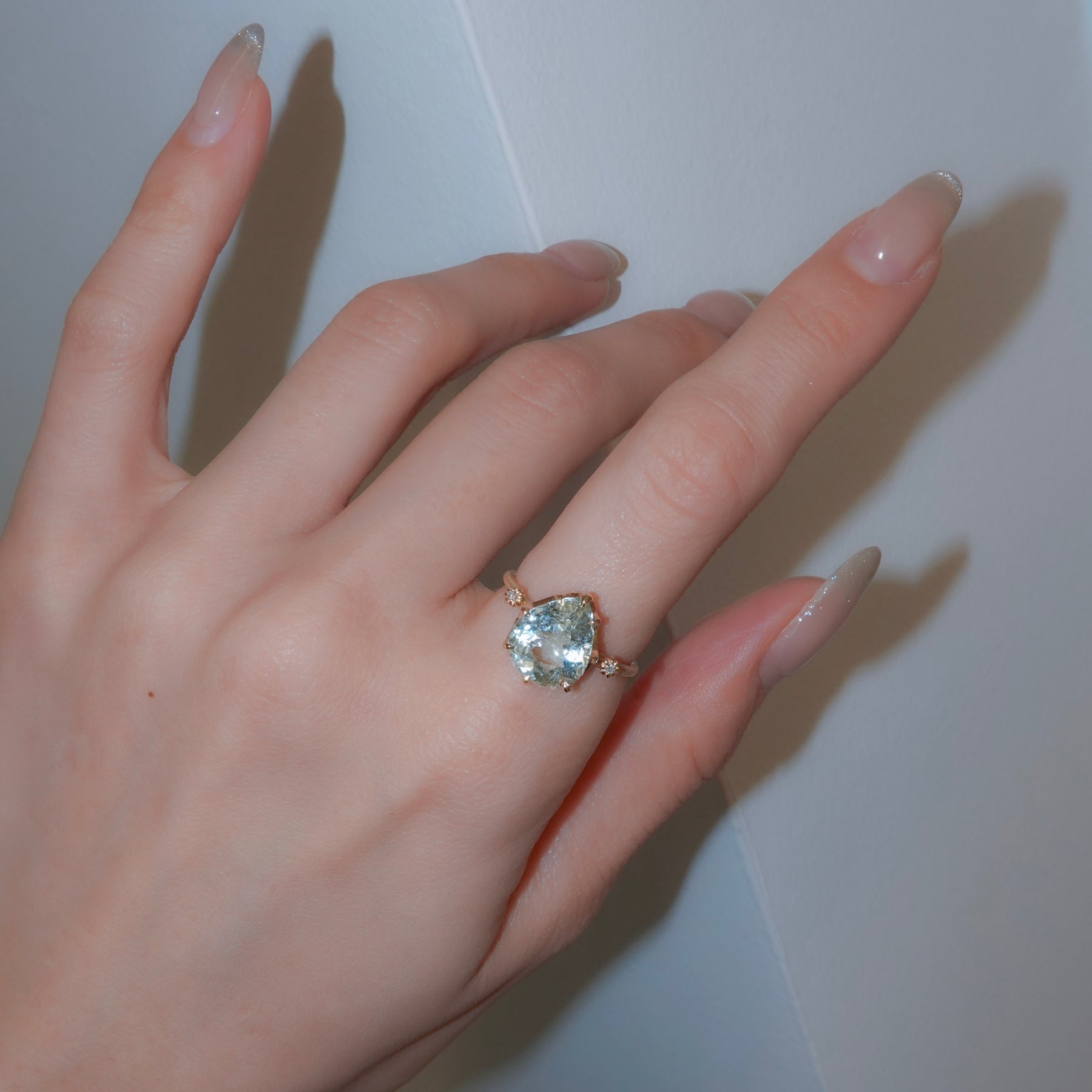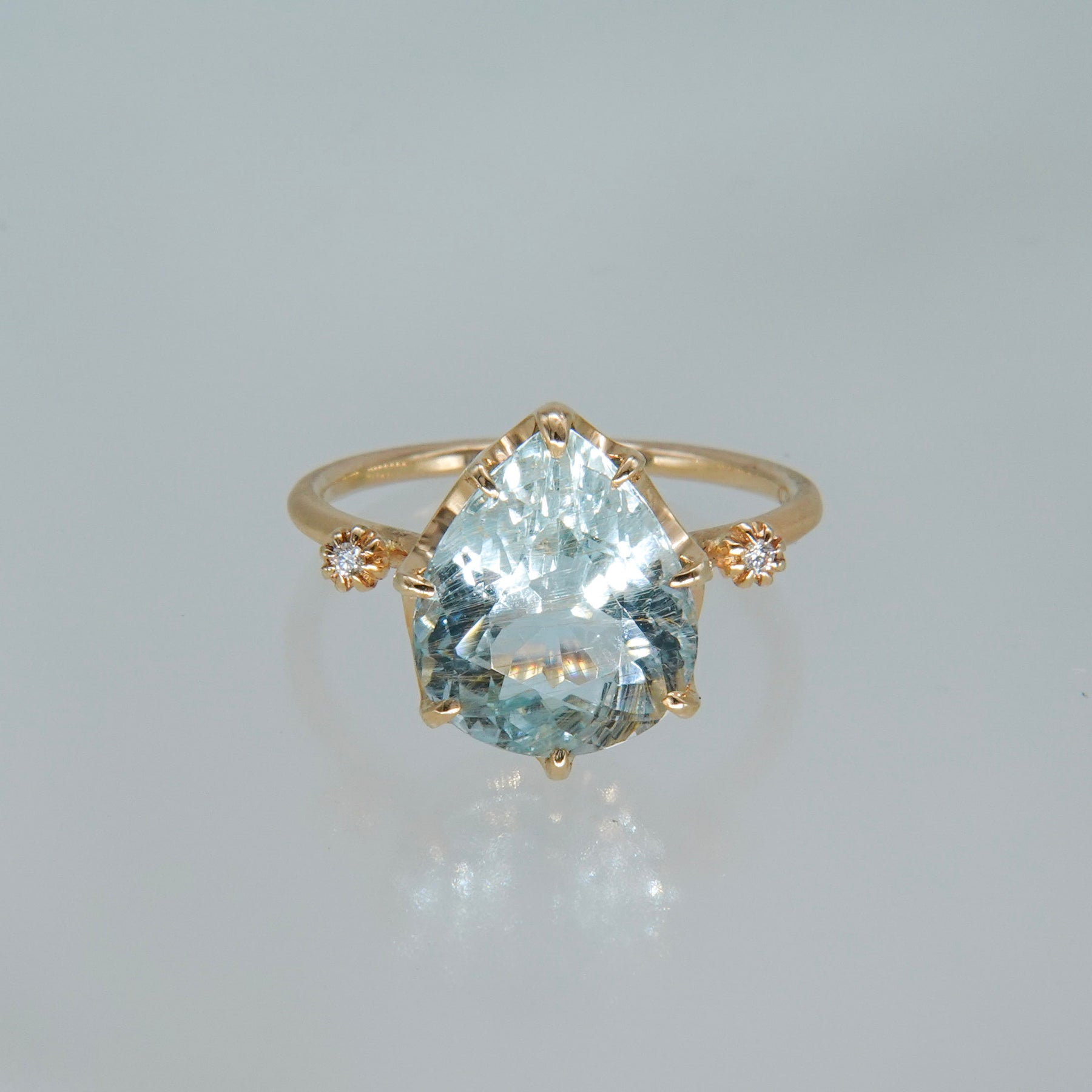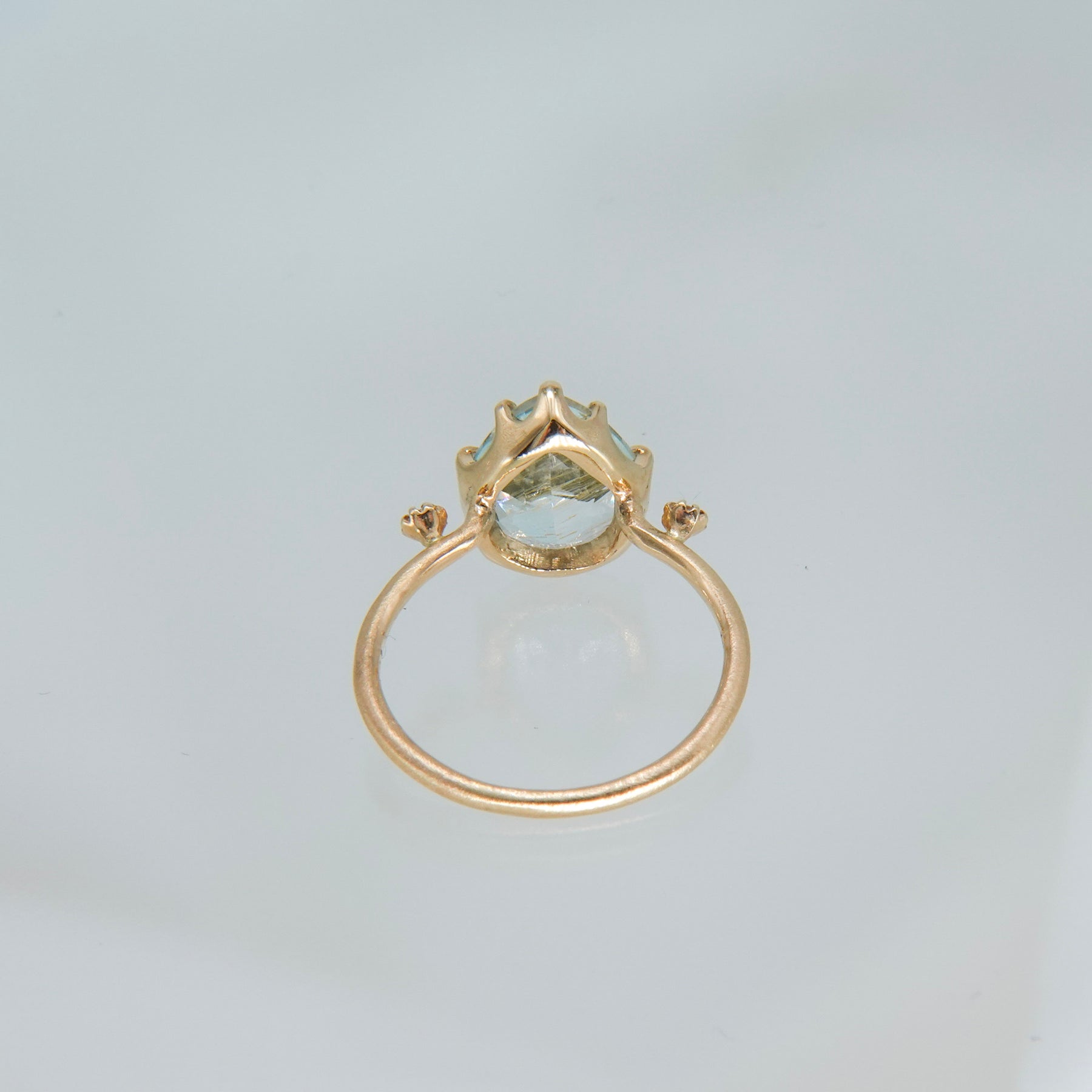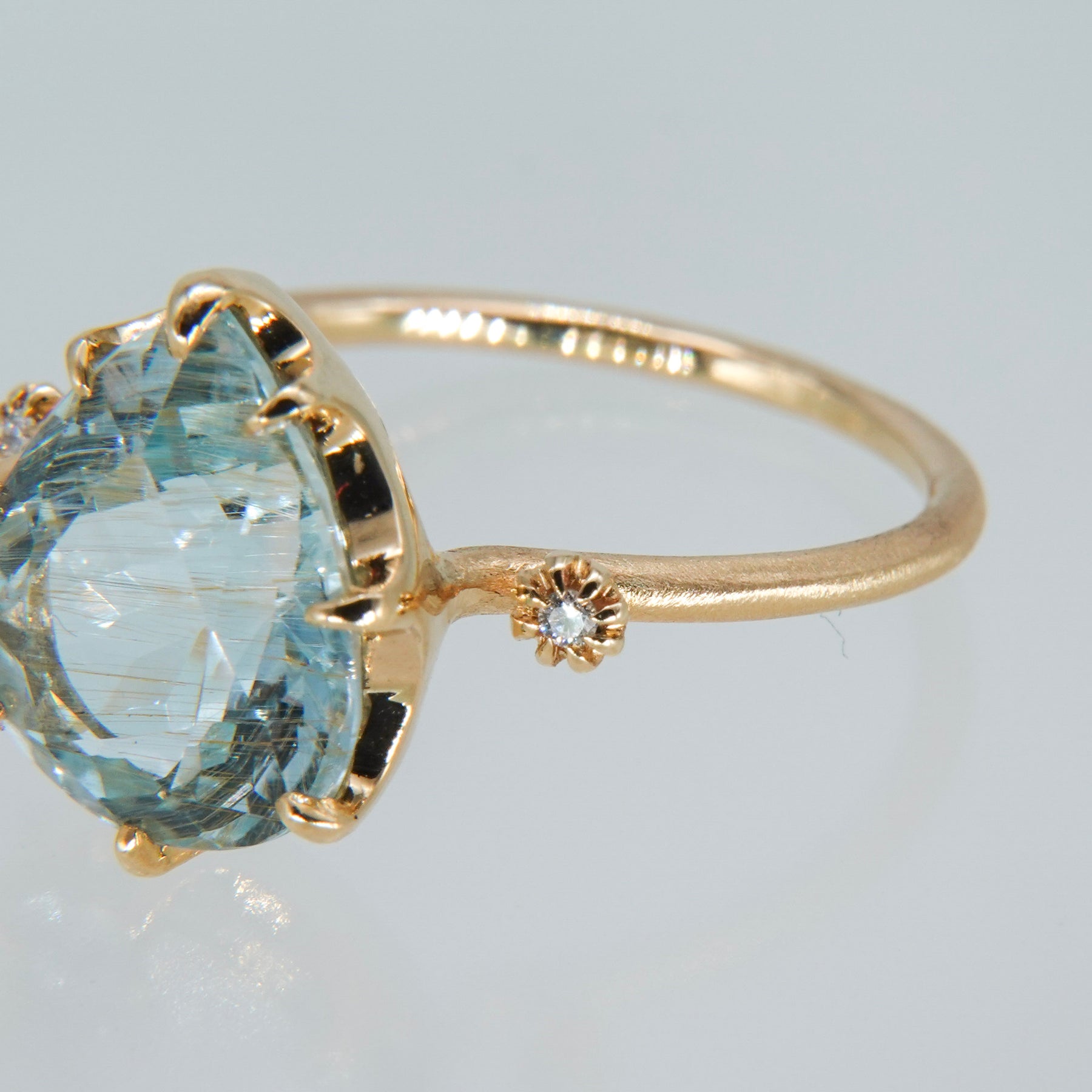 澄んだ水色のトパーズの中にライモナイトを内包した石で、透明感のある発色と穏やかな表情が特徴です。メインストーンの両サイドにはメレダイヤを配し、リングアームは幅1.5mmのマットゴールド仕上げ。