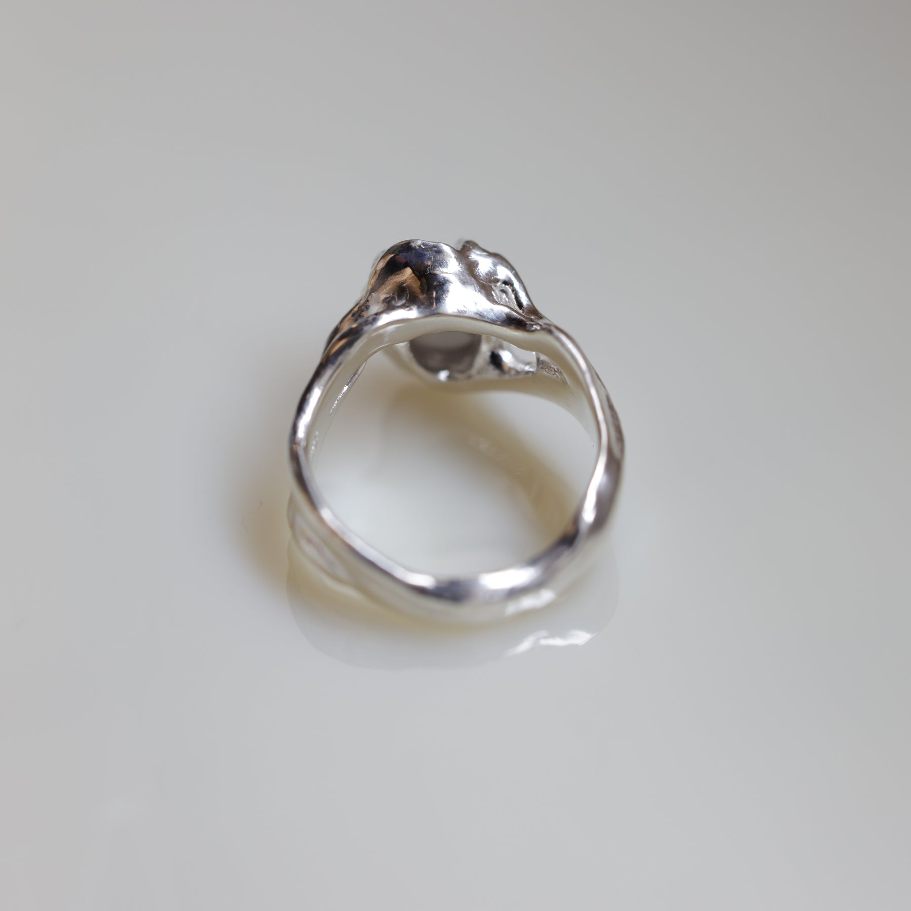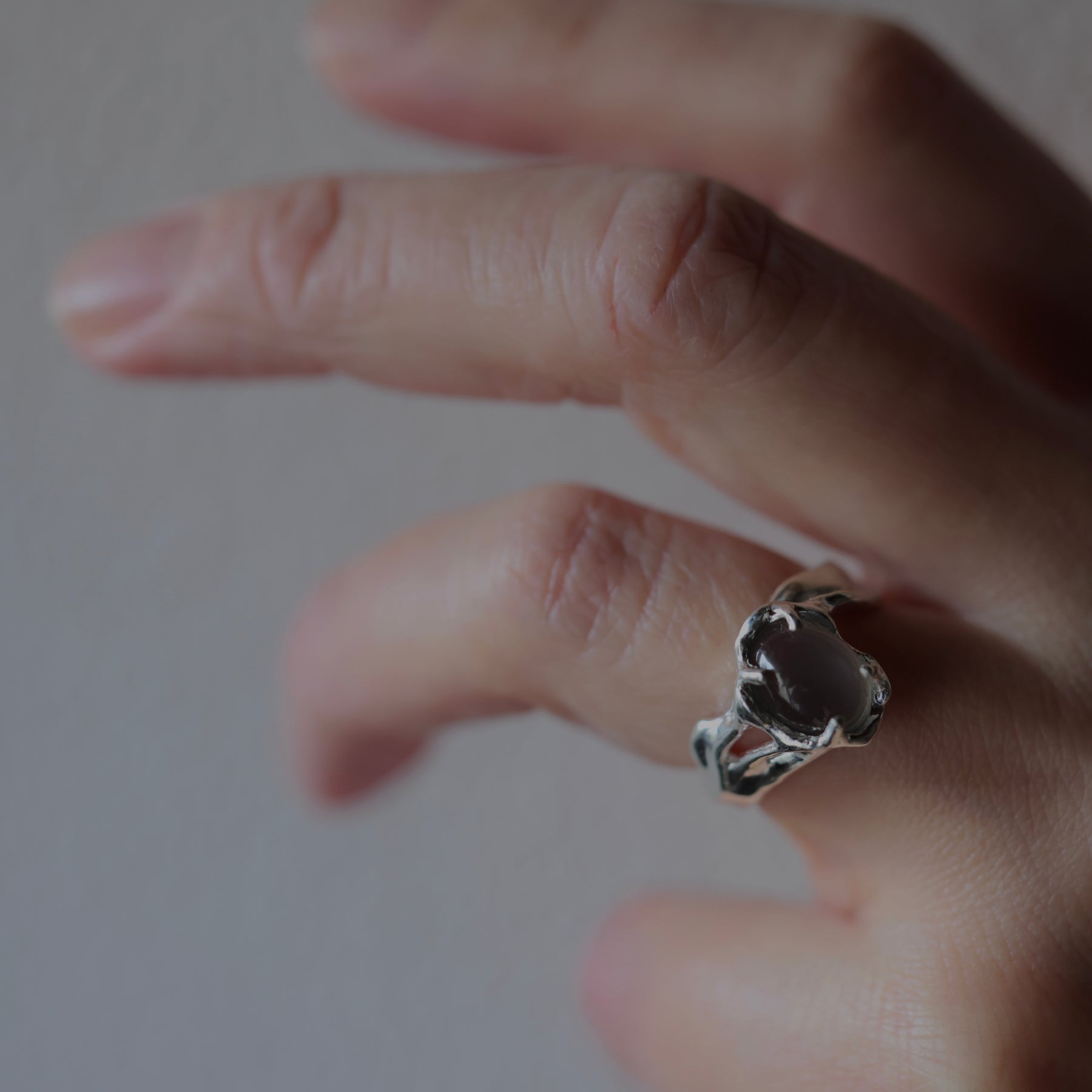 一点もののSAI OOAK Series(OOAKはOne Of A Kindの略)の一品。 リング腕から爪まで立体感と動きにこだわり一点一点石に合わせて制作しているシリーズです。ニュアンスを 持たせナチュラルに仕上げたリングアーム、ぷっくりとした石座に4本の爪でちょっぴり上品に石留め、くすみカラーで肌馴染みのよいグレイムーンストーン。個性的でありながら控えめな輝き、さりげない存在感でコーディネートに溶け込みます。