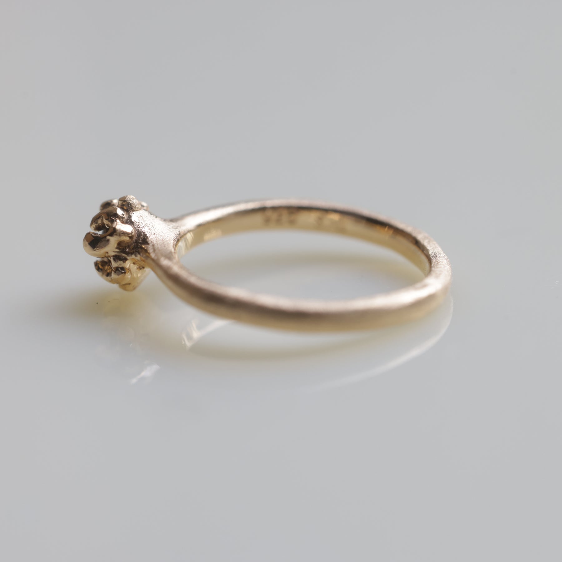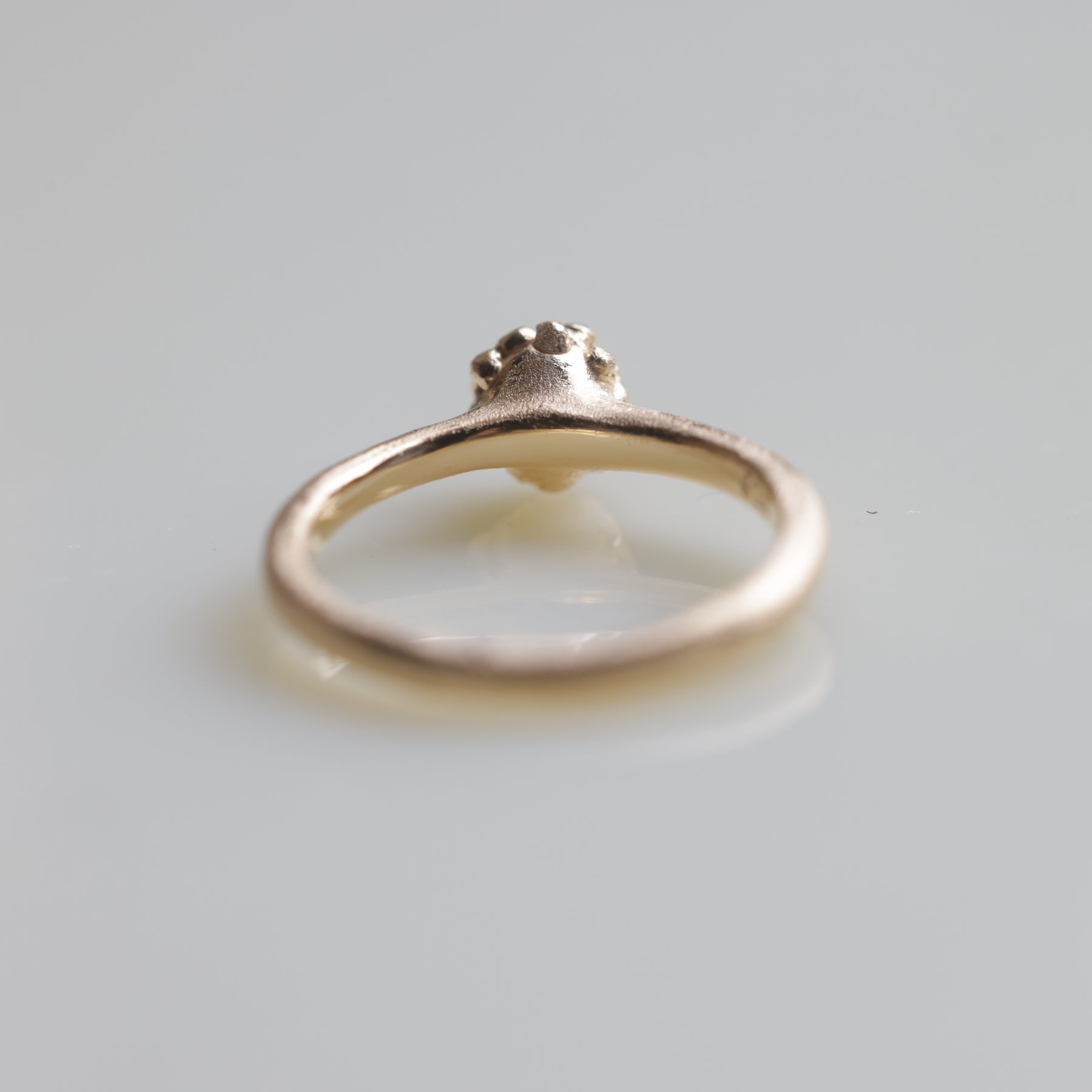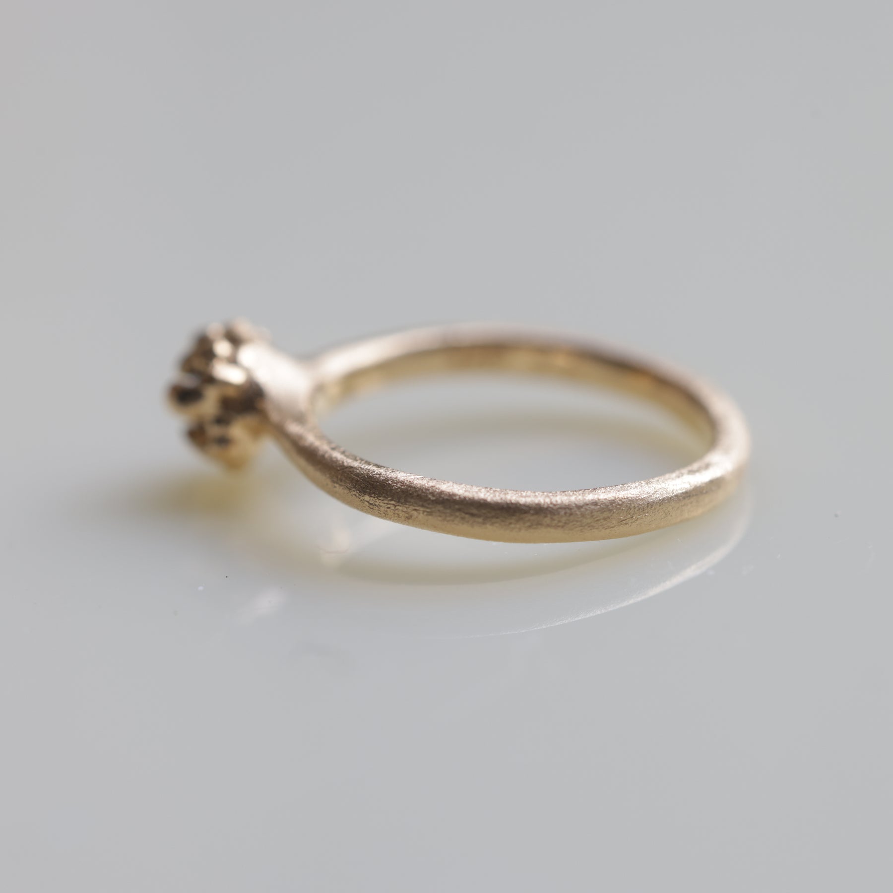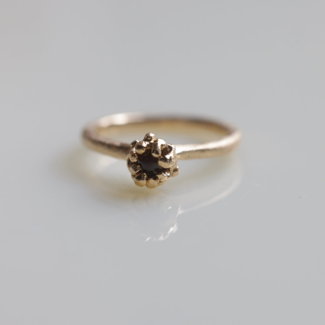 こちらはガーネットをたくさんの爪で石留めしたマットな質感のリング。お花のようなイソギンチャクのような形。ユニークだけど小ぶりでさりげない存在感。ニッケルフリー、K18YGを2重コーティングしておりますので金属アレルギー・経年劣化が出にくいです。