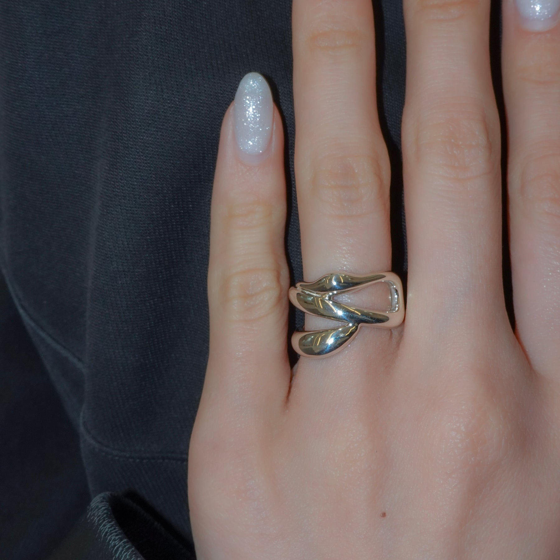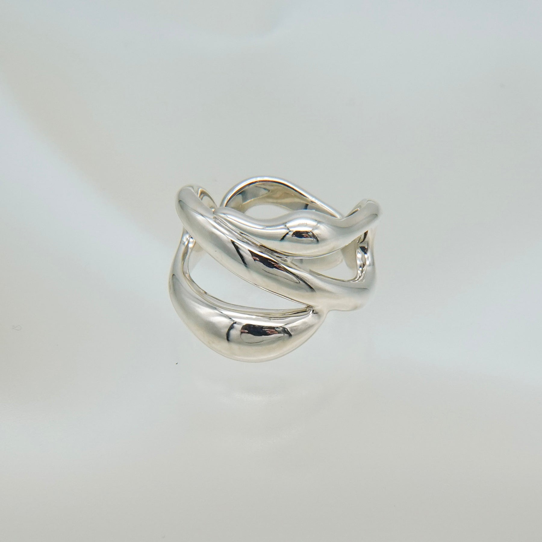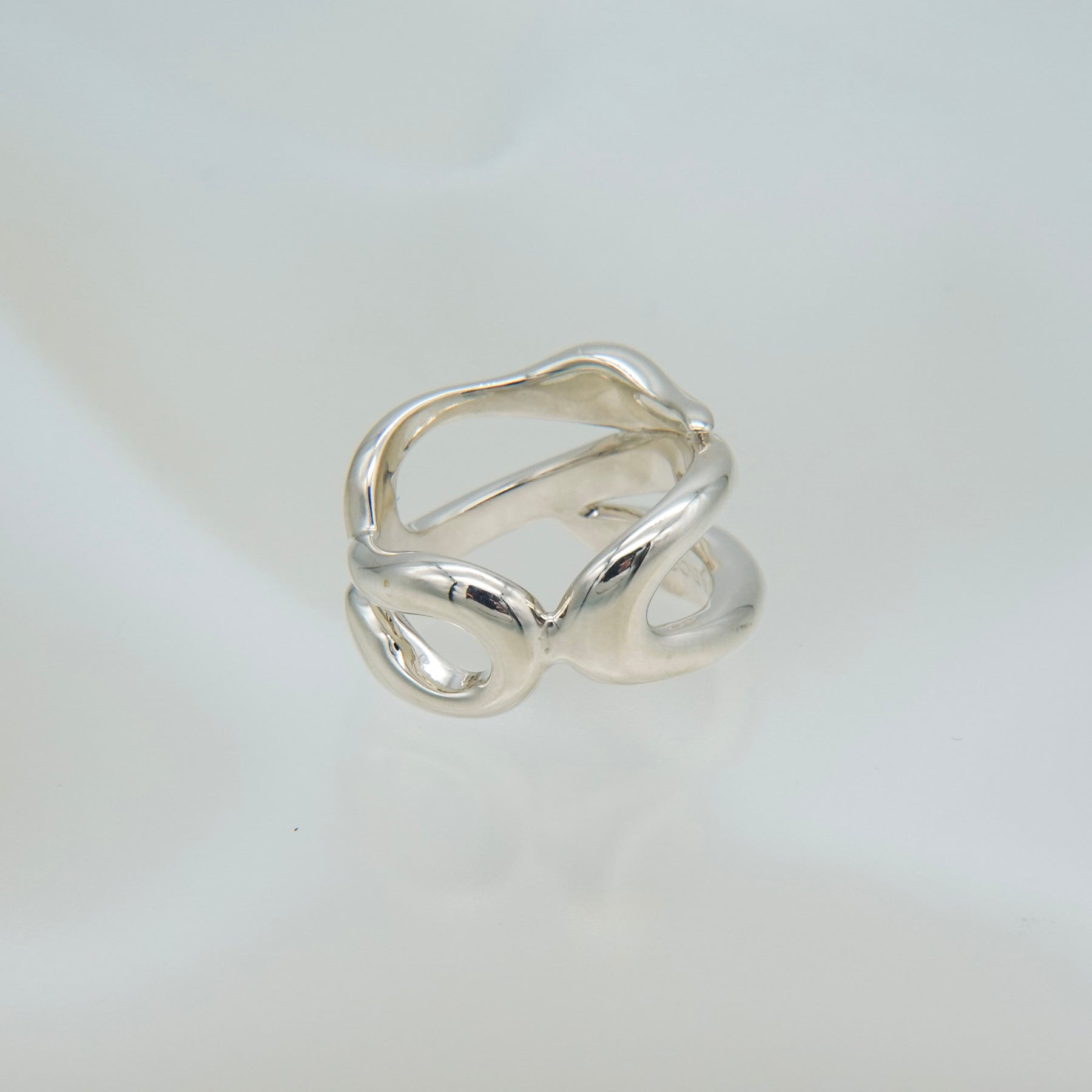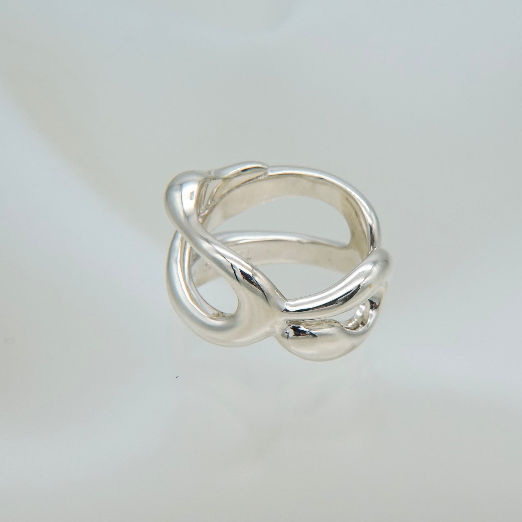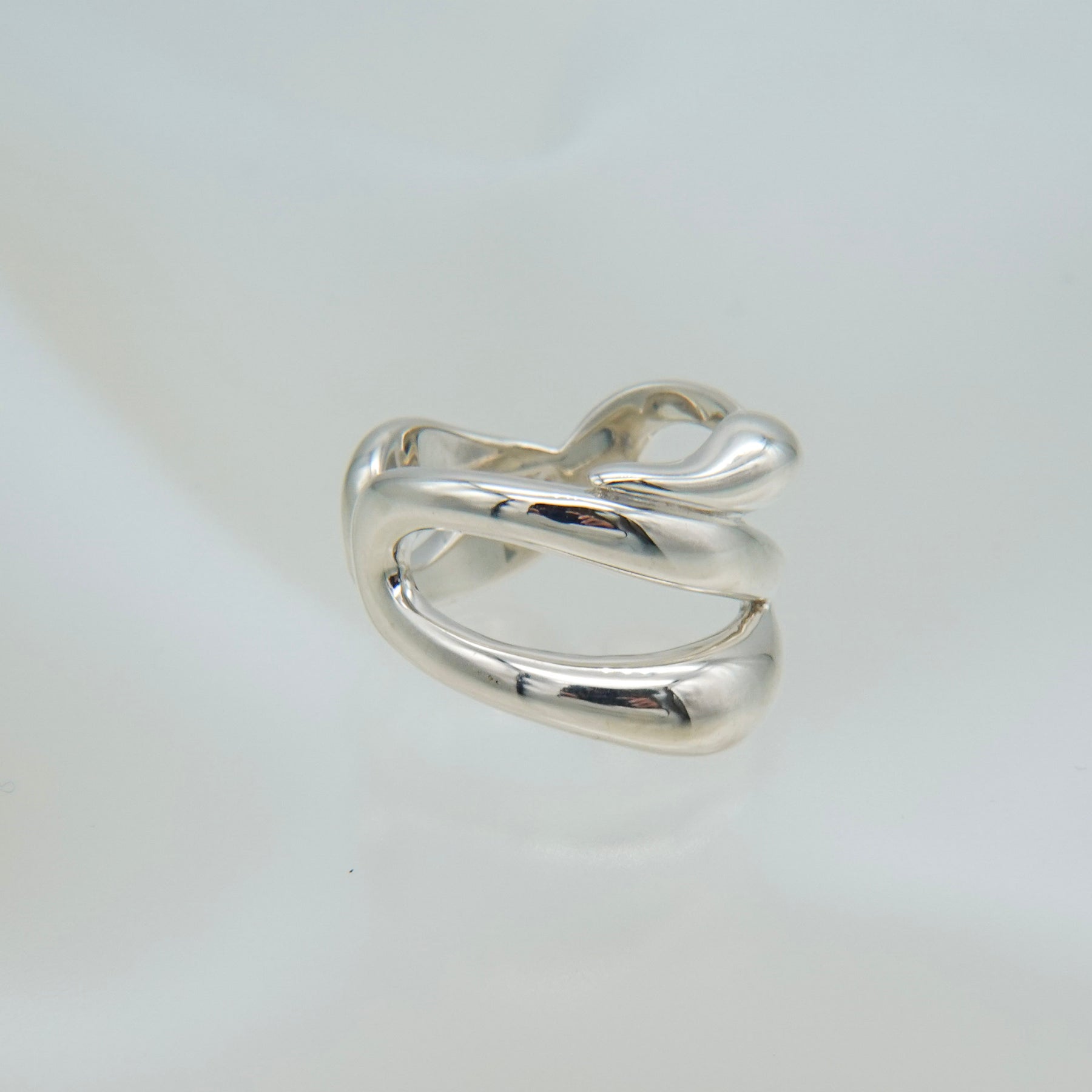 複数のラインが交差しながら内側へ折り重なる、ボリュームのあるリングです。