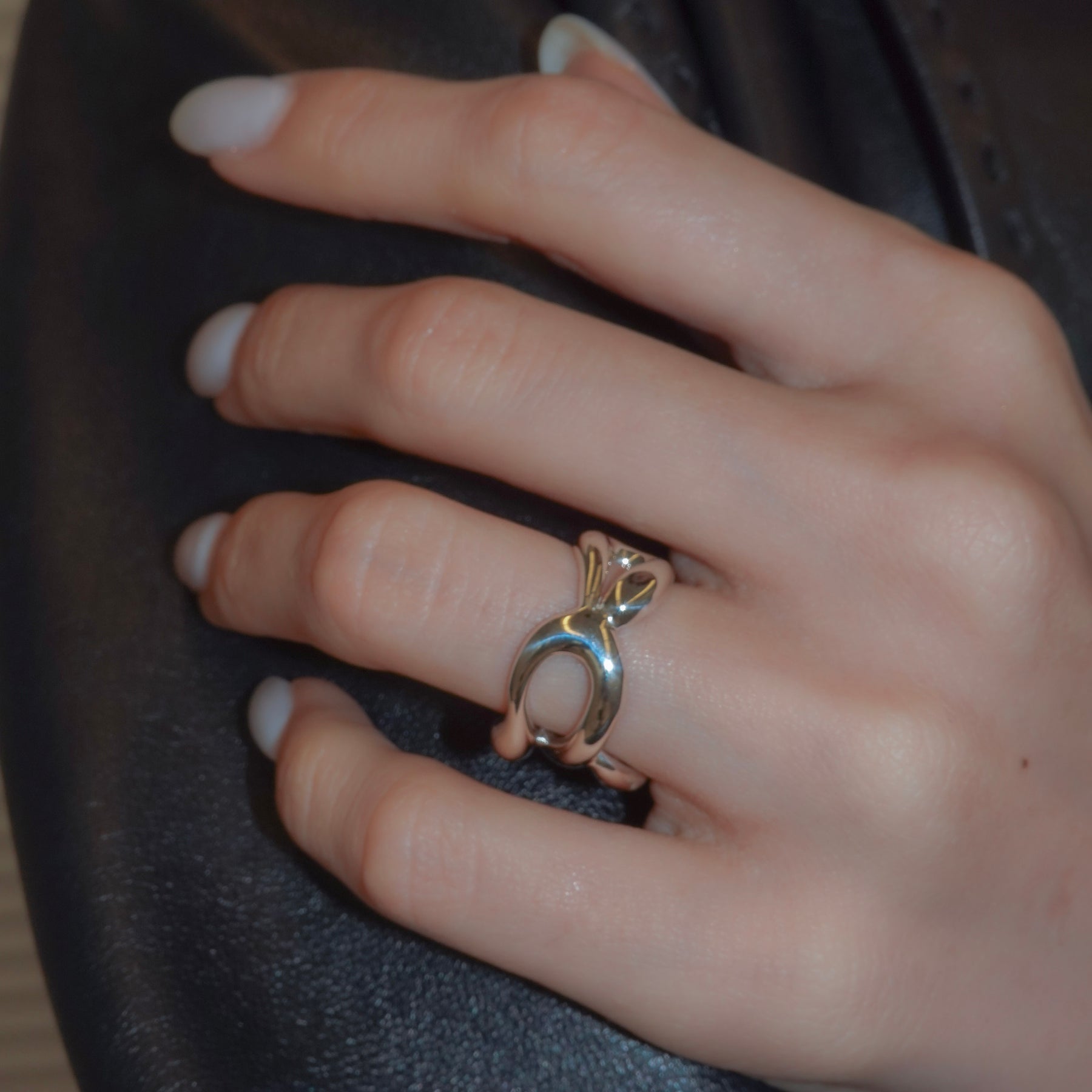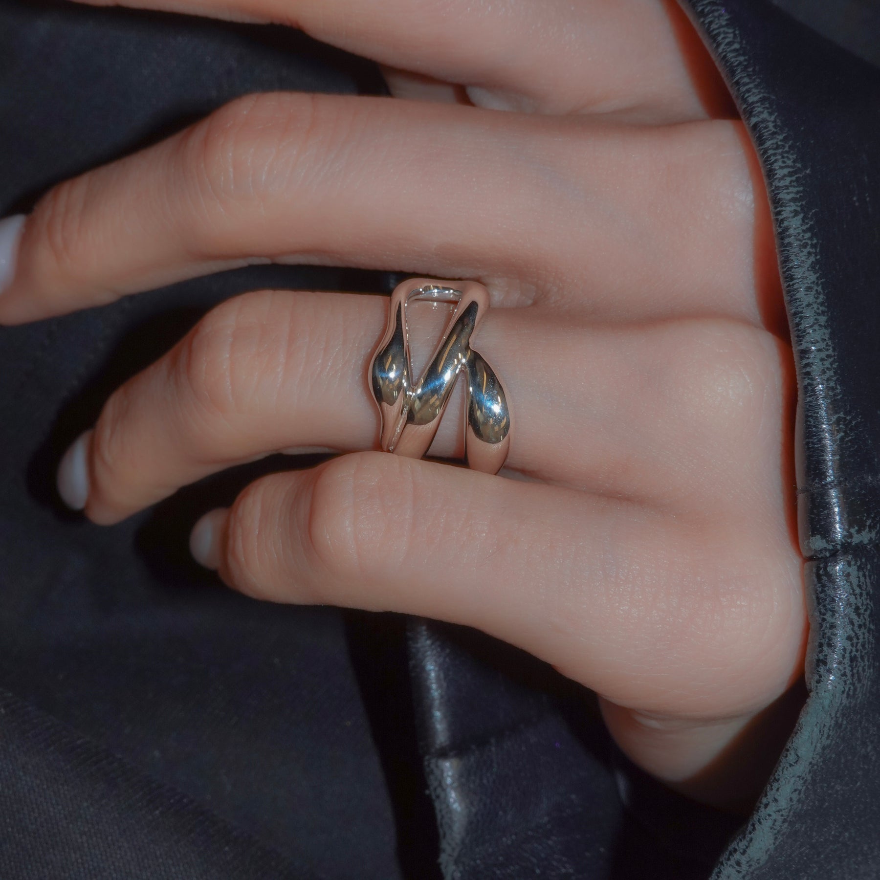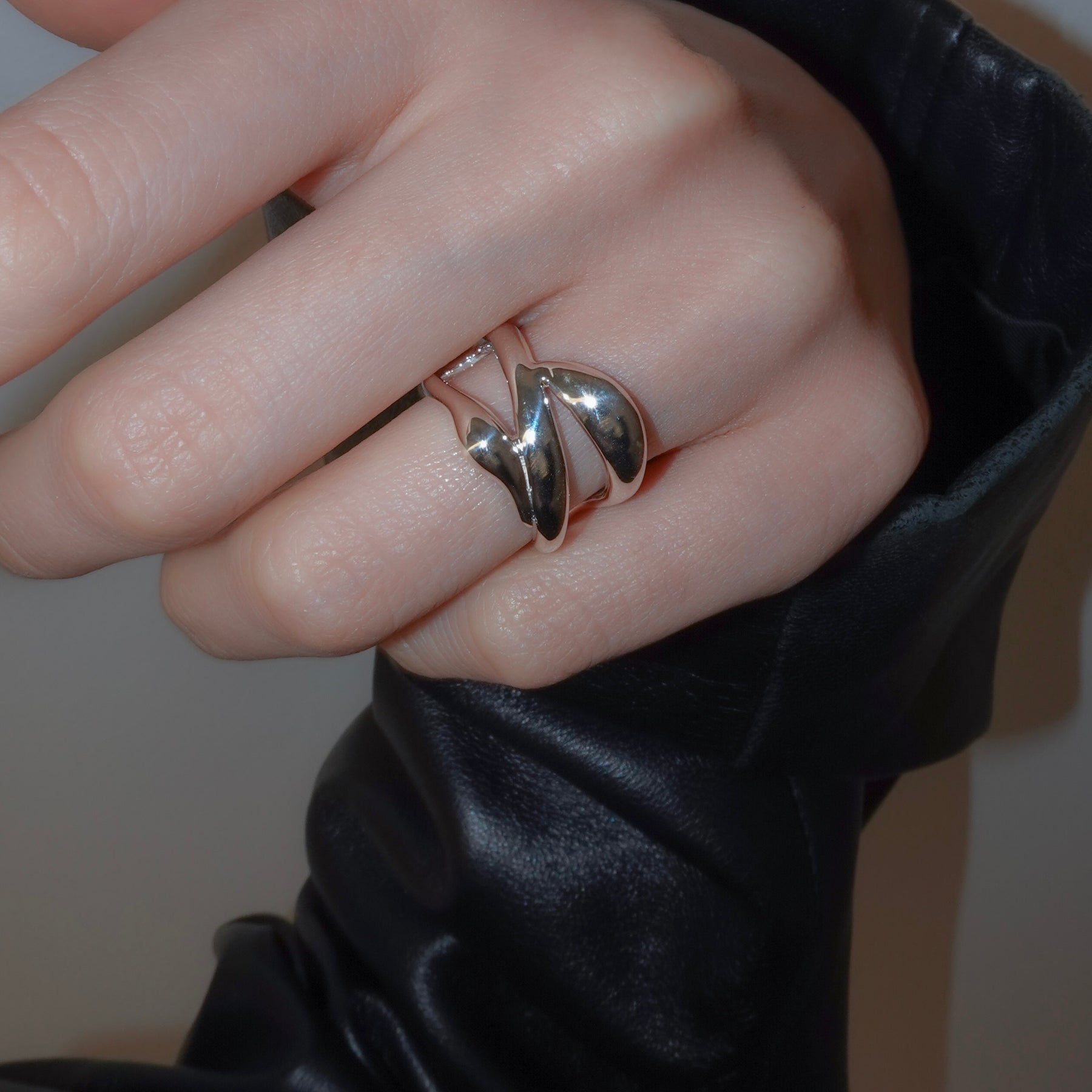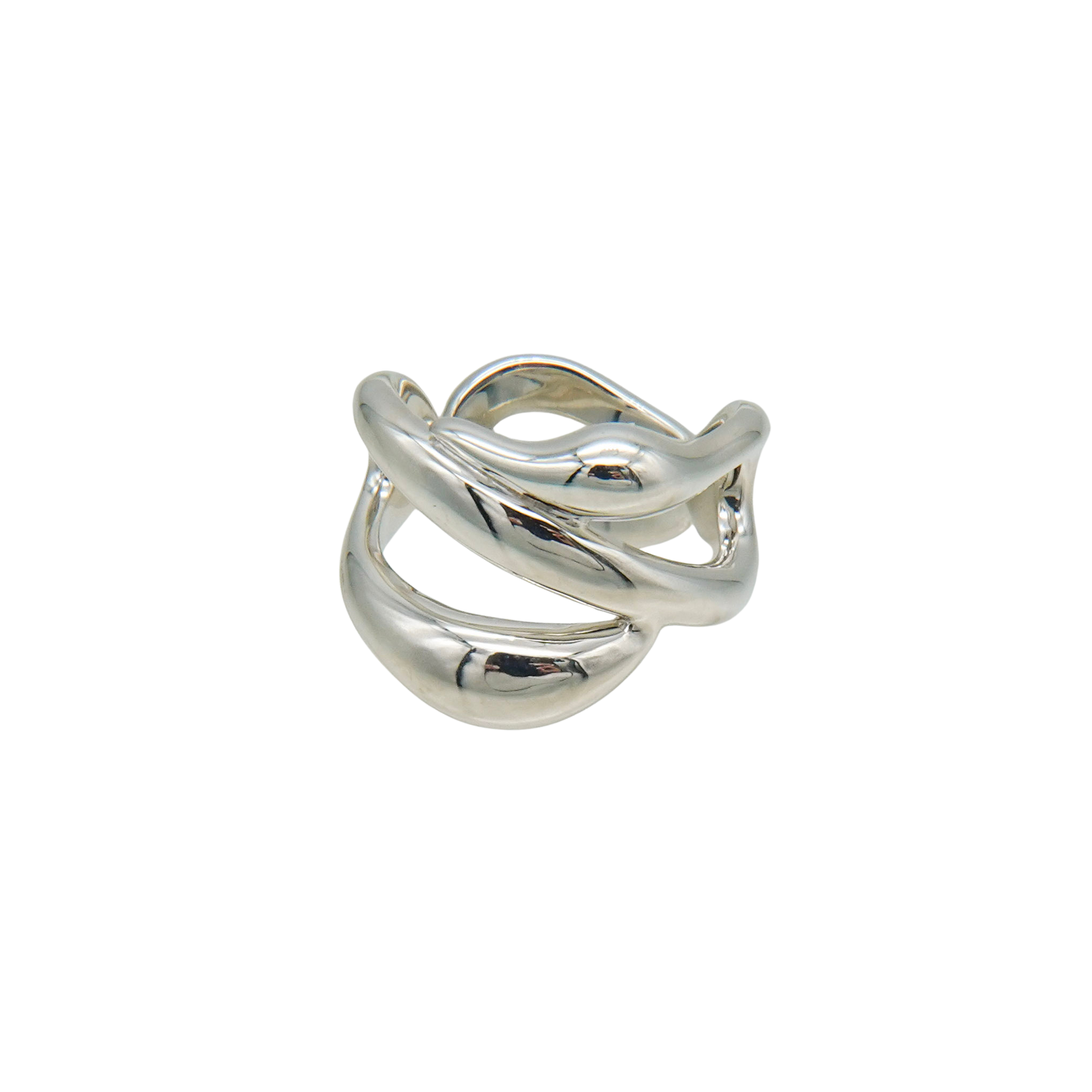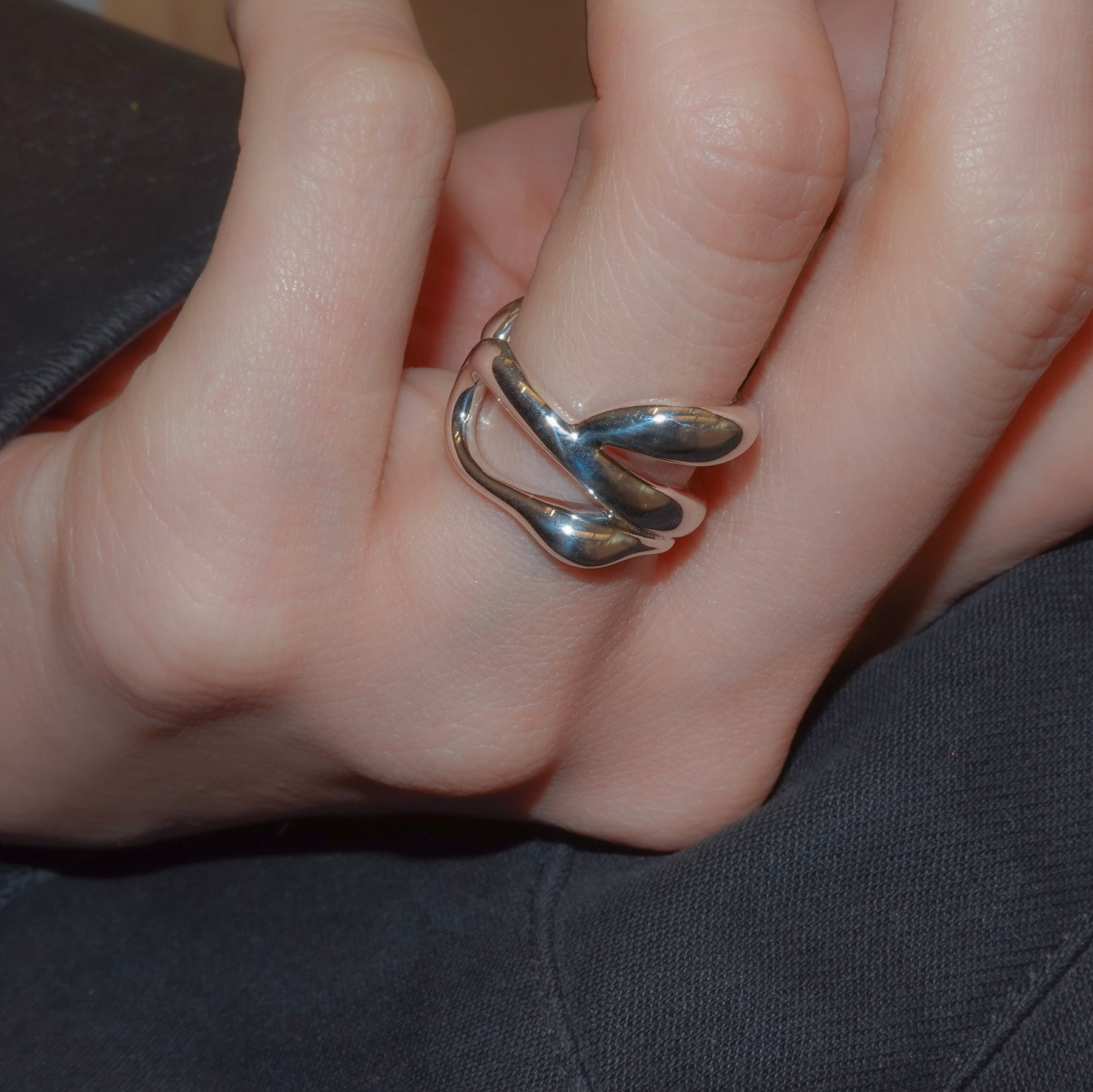 複数のラインが交差しながら内側へ折り重なる、ボリュームのあるリングです。