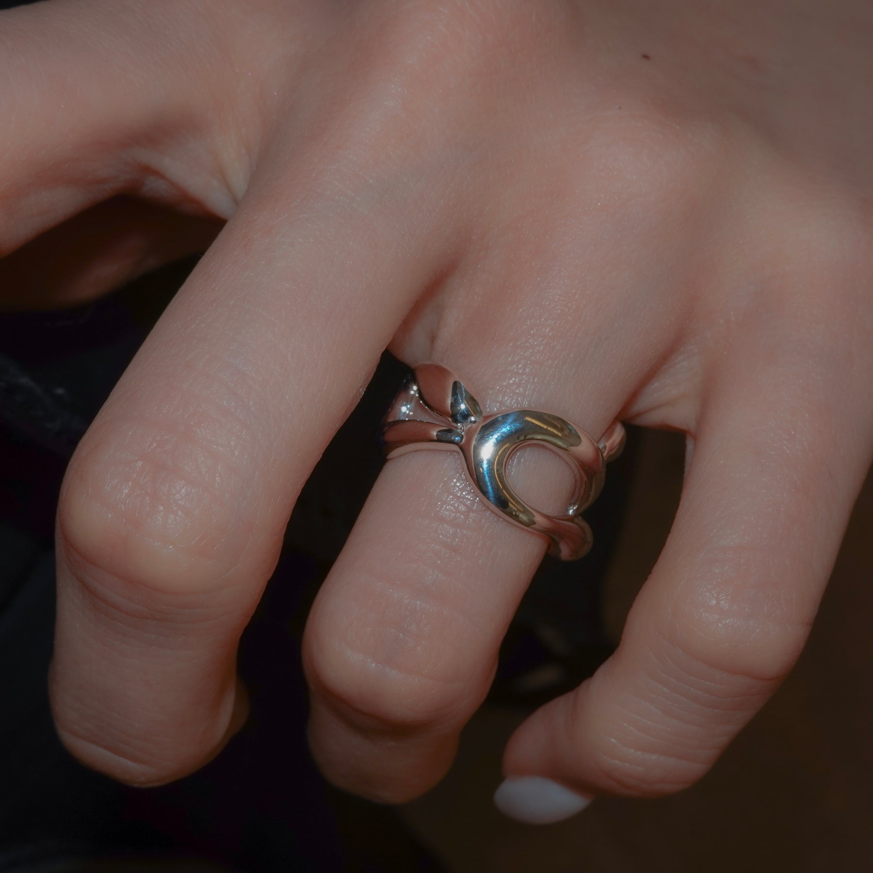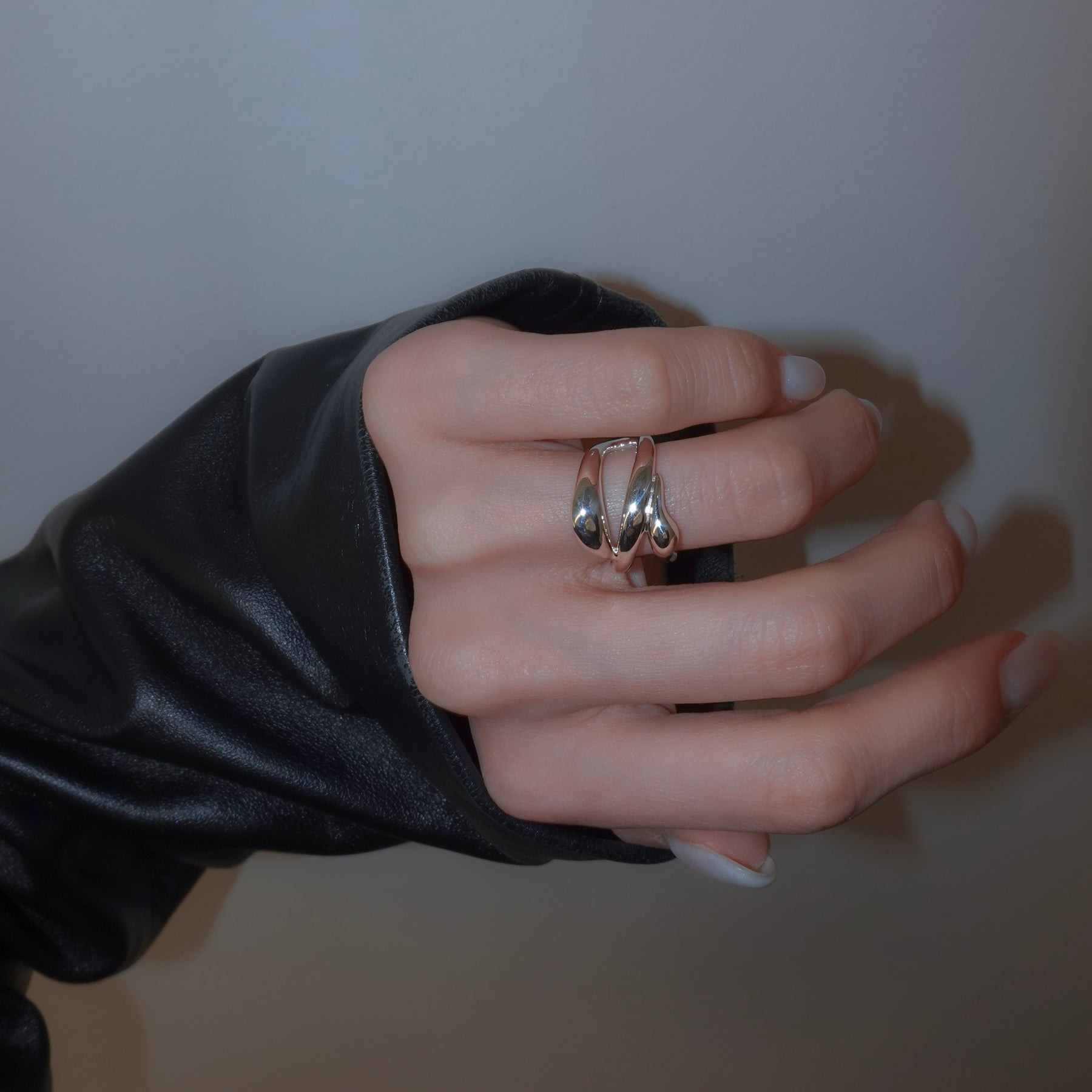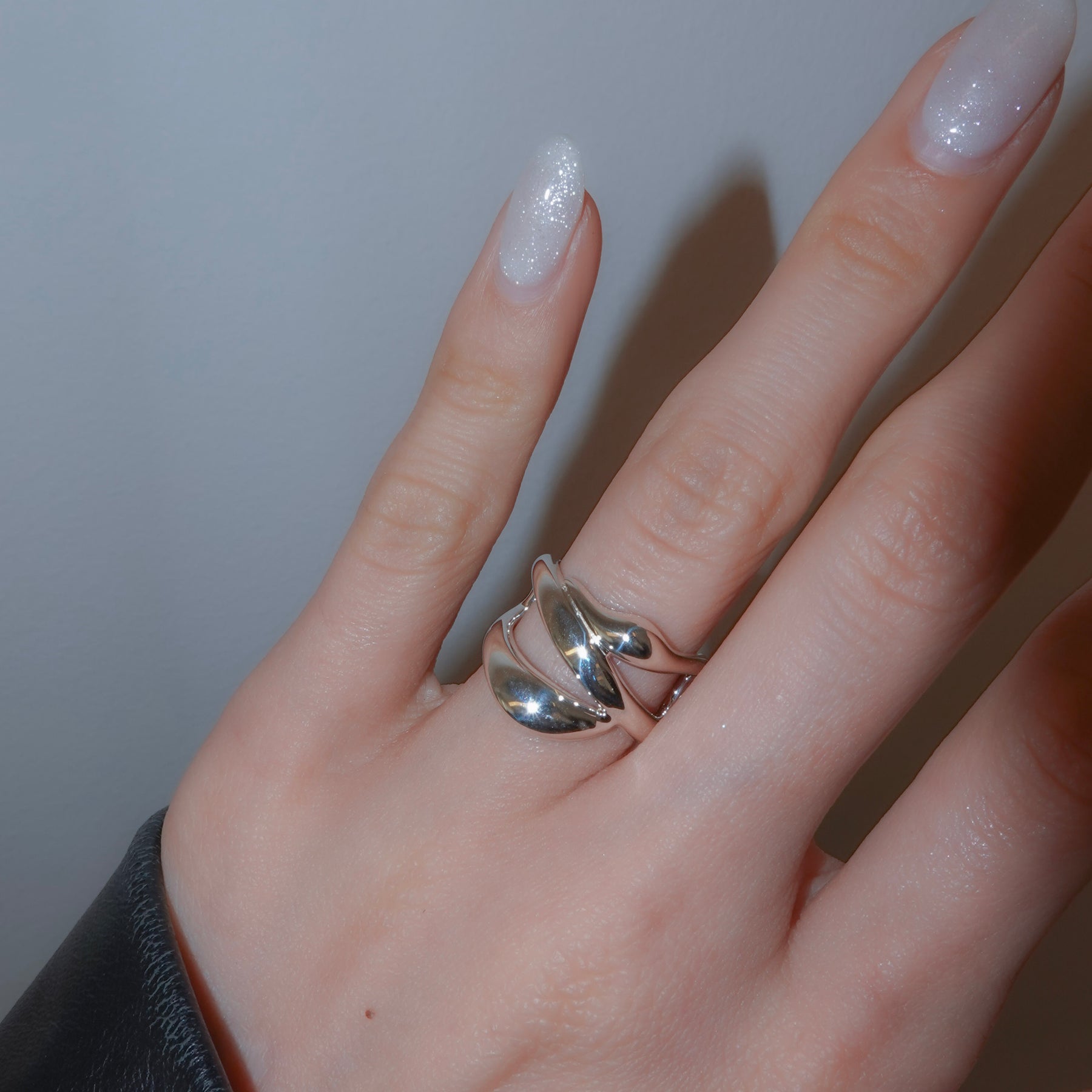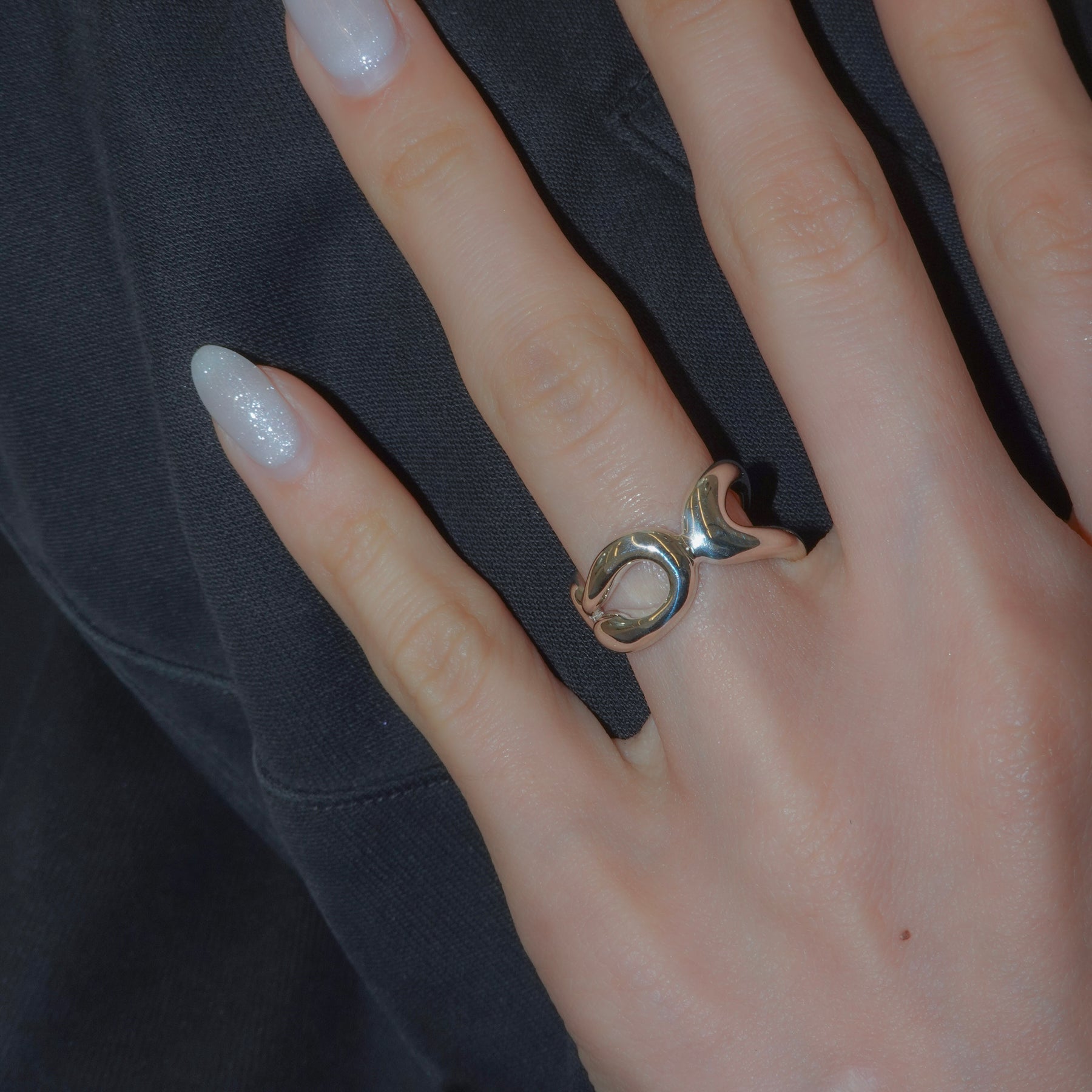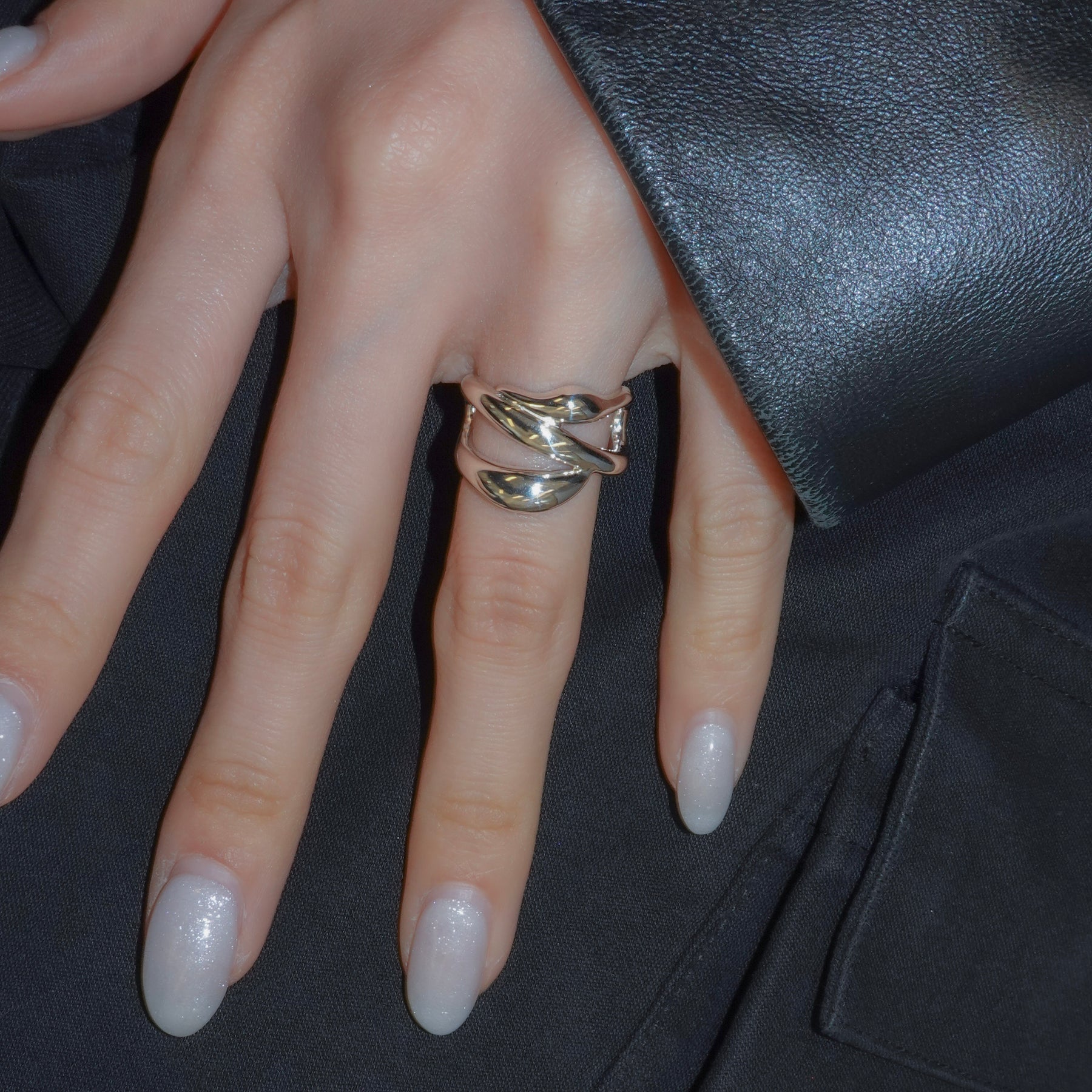 複数のラインが交差しながら内側へ折り重なる、ボリュームのあるリングです。