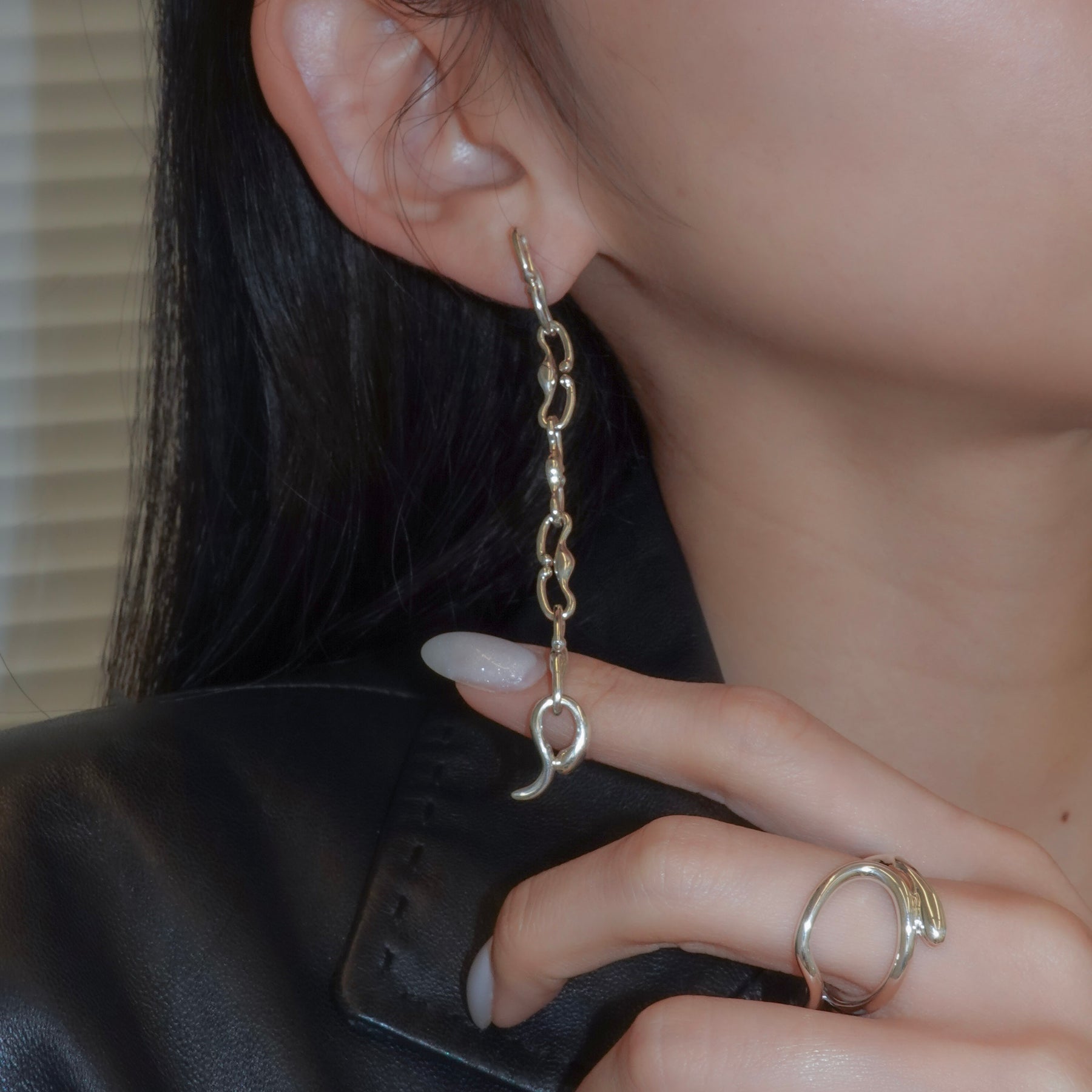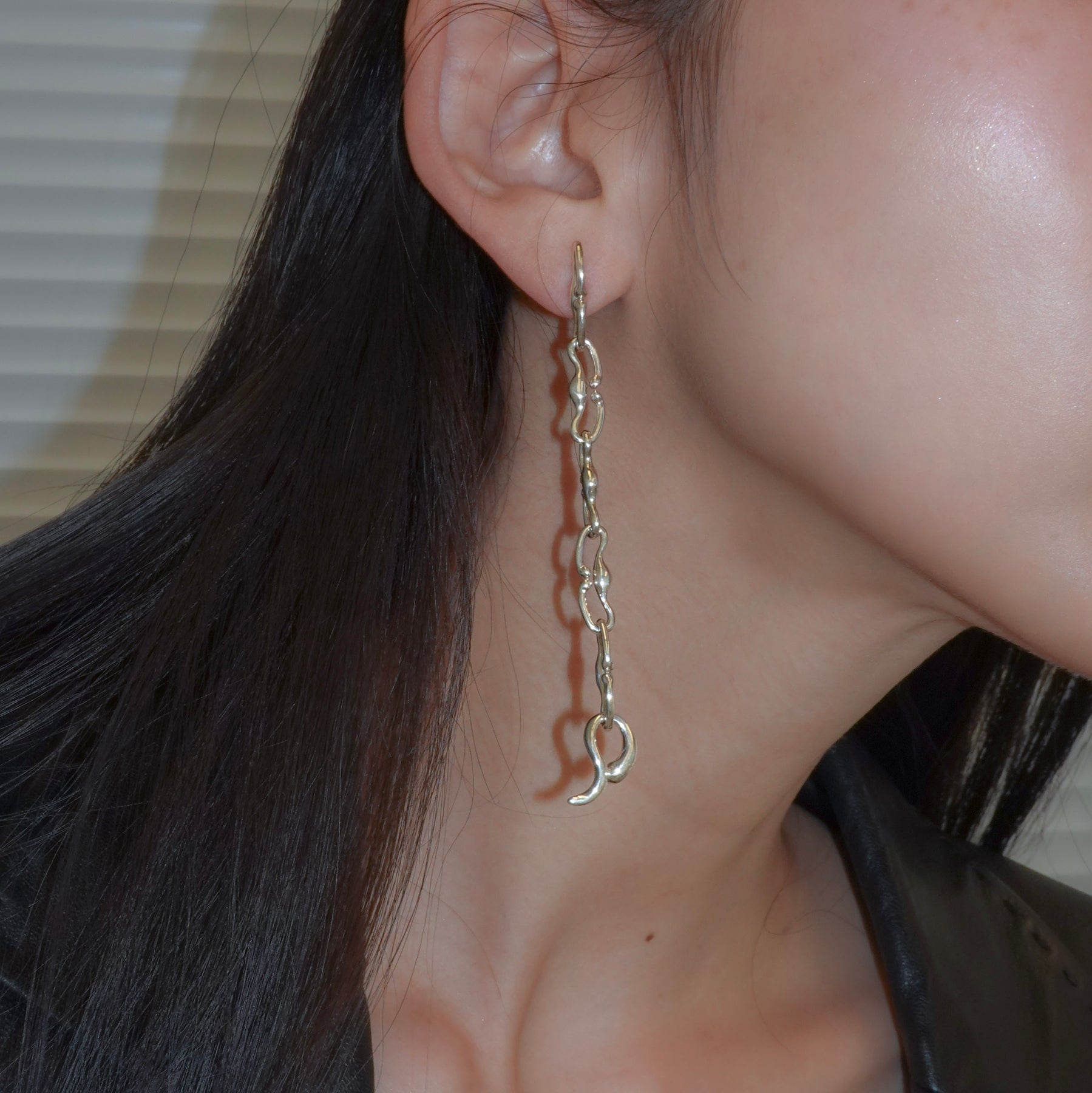チェーン状の可動パーツを組み合わせた仕様で、長さのバランスが際立つシルエットに仕上げています。