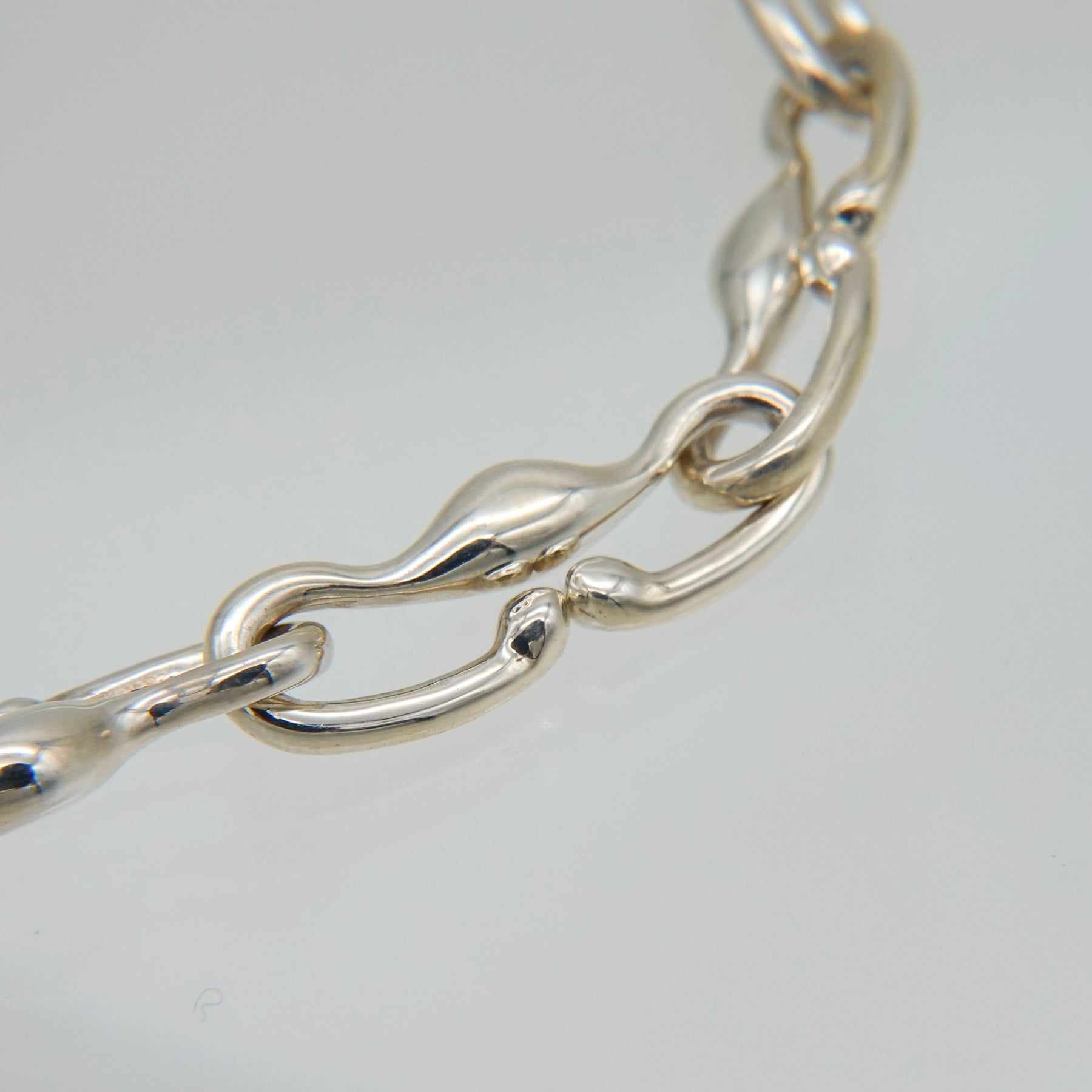 湾曲を重ねた構造が下方への動きを生み、揺れに合わせて表面を伝う光が陰影を描きます。