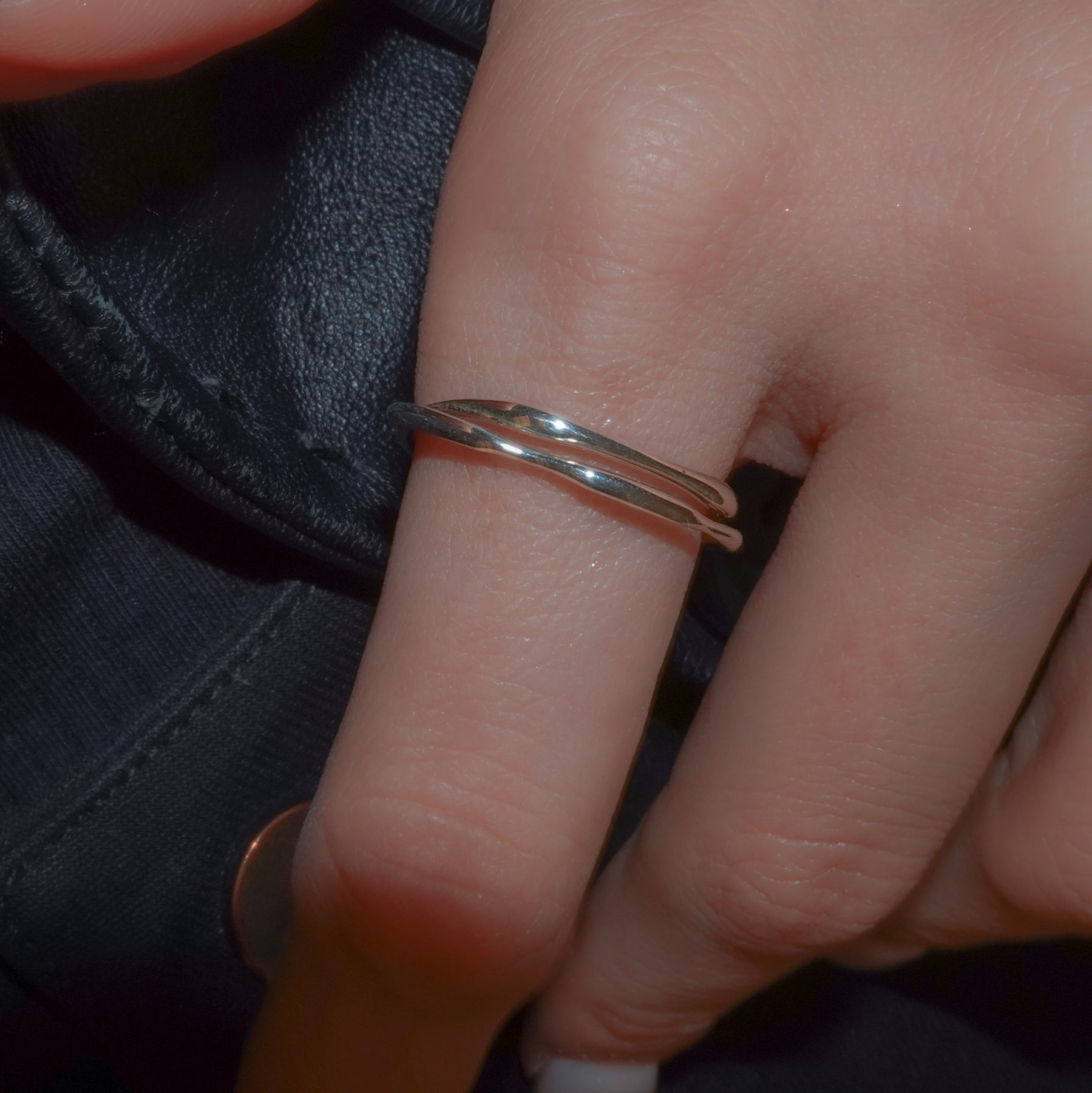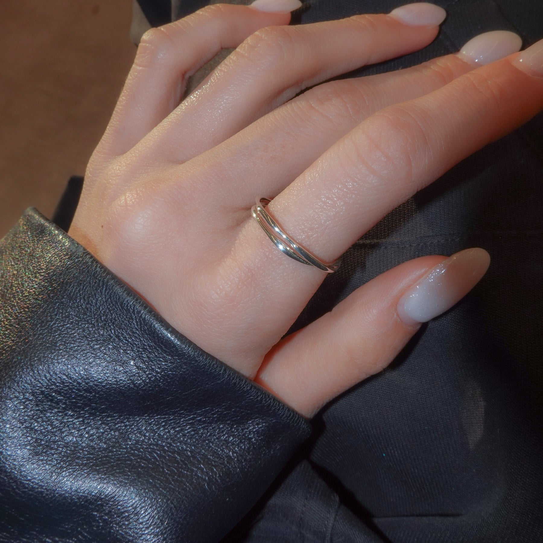 細身のラインがわずかに重なり合う、コンパクトなボリュームのリングです。