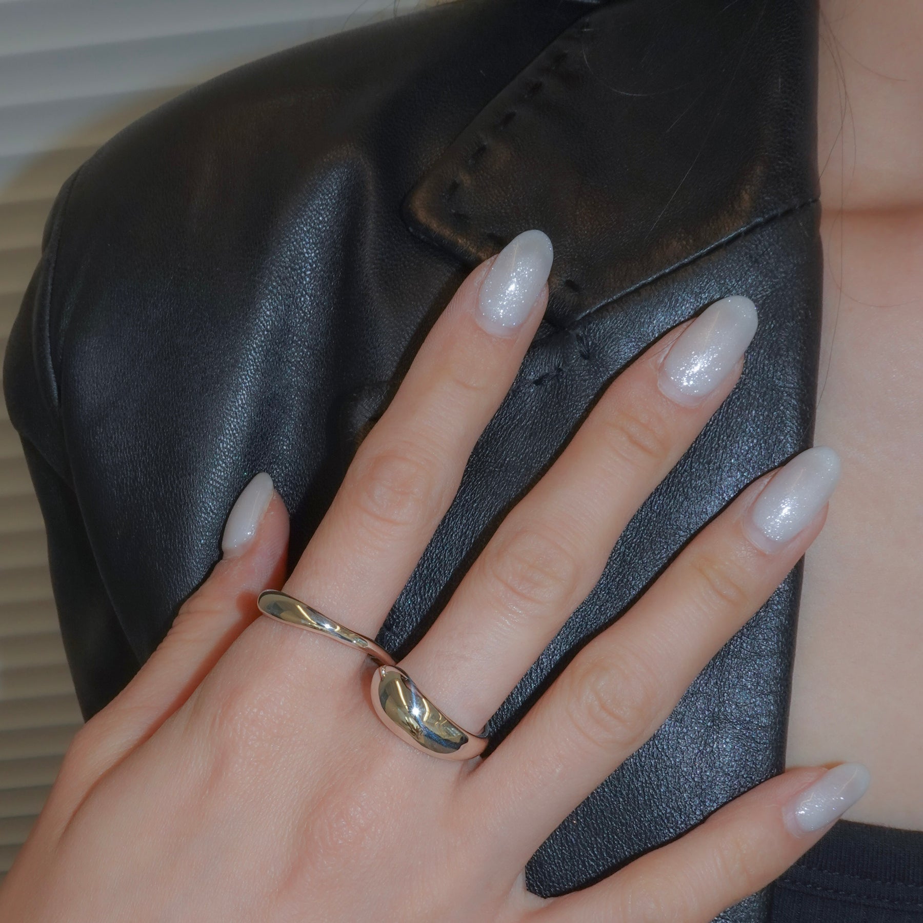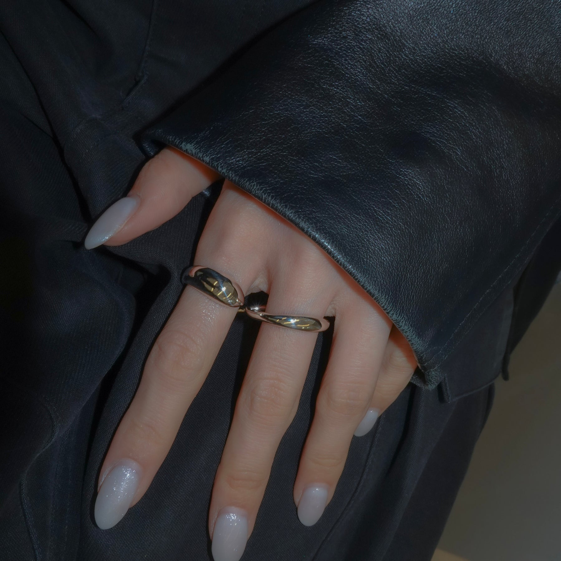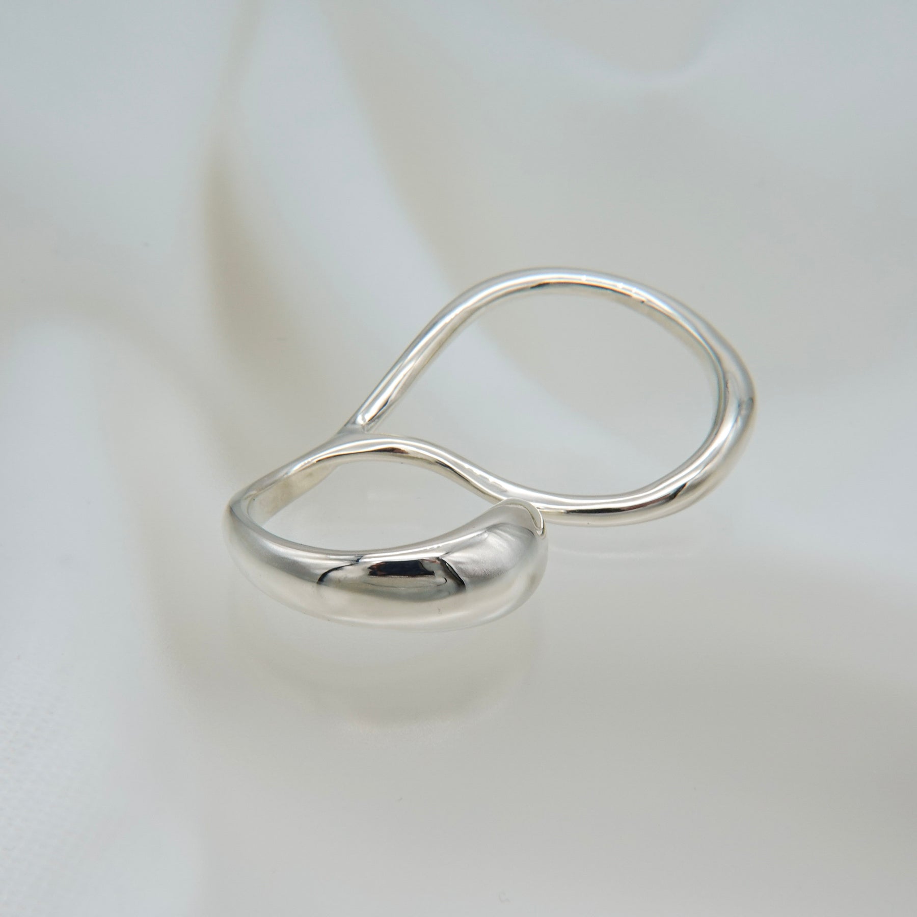 一本のラインがうねりを描きながら二本の指をまたぐ、立体的なダブルフィンガーリングです。