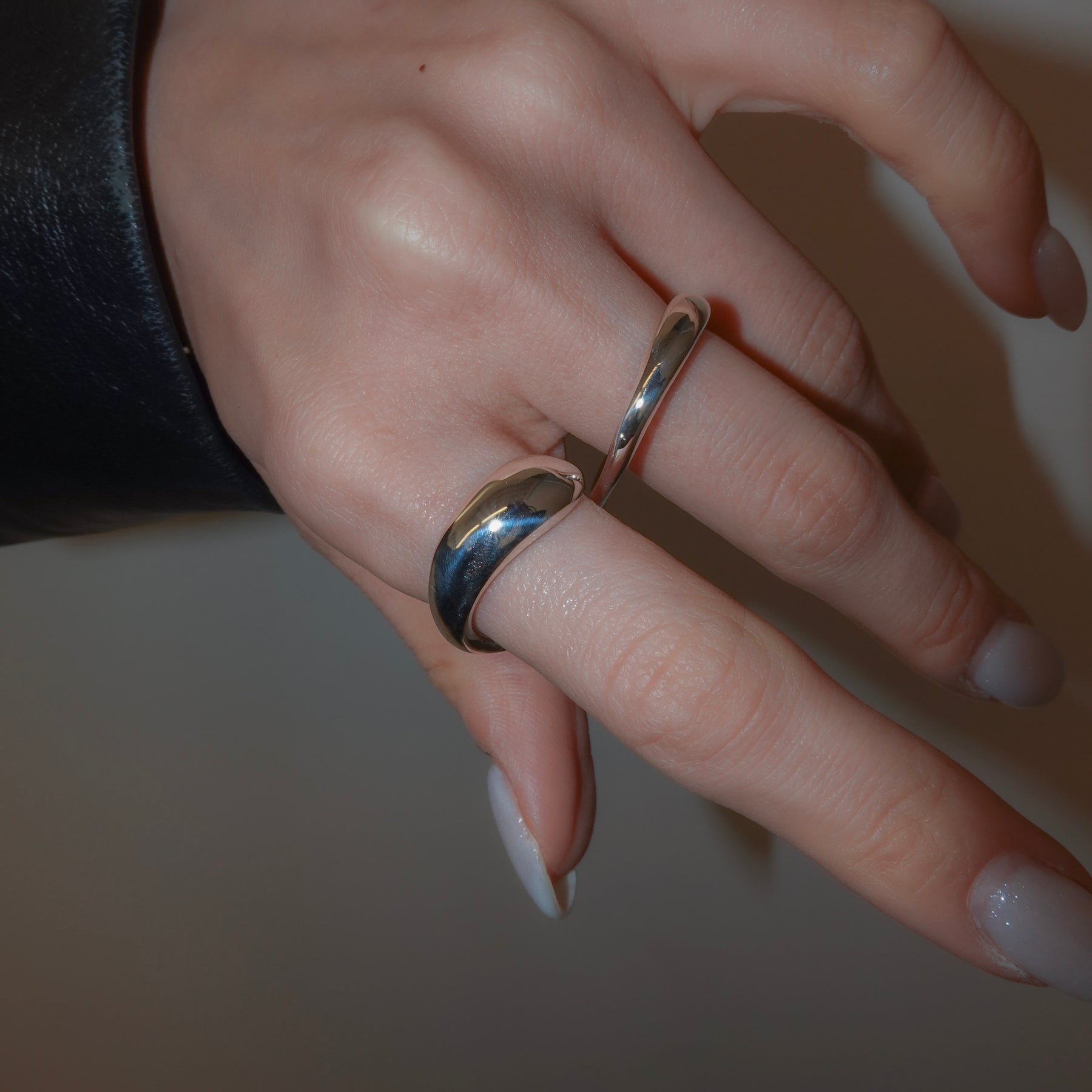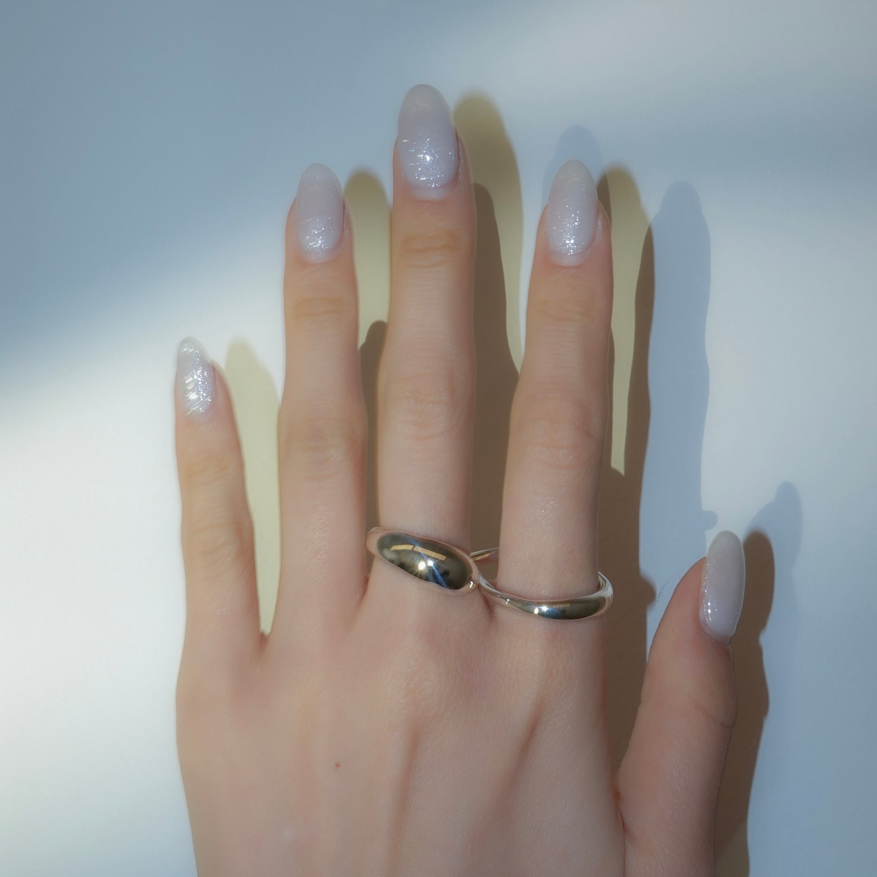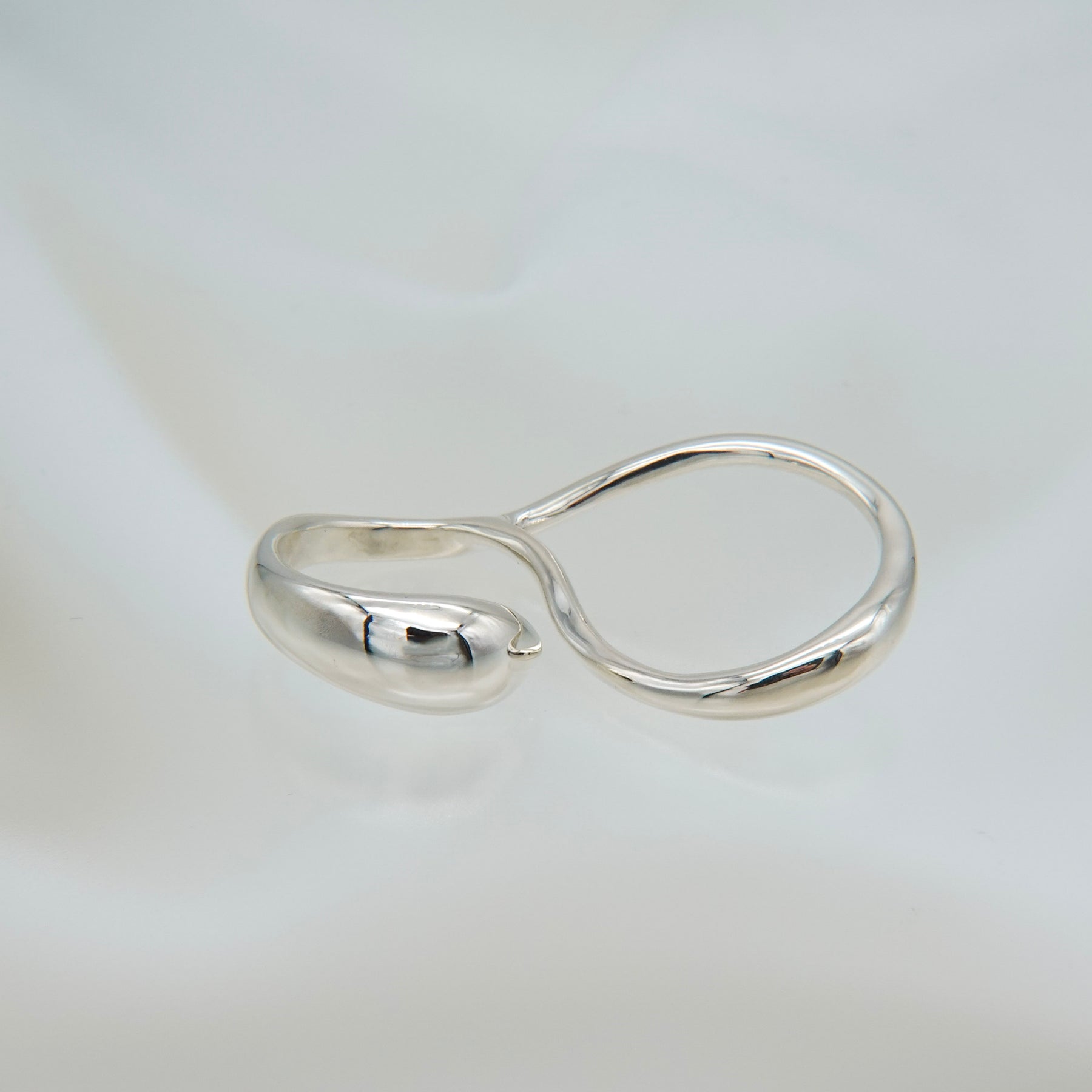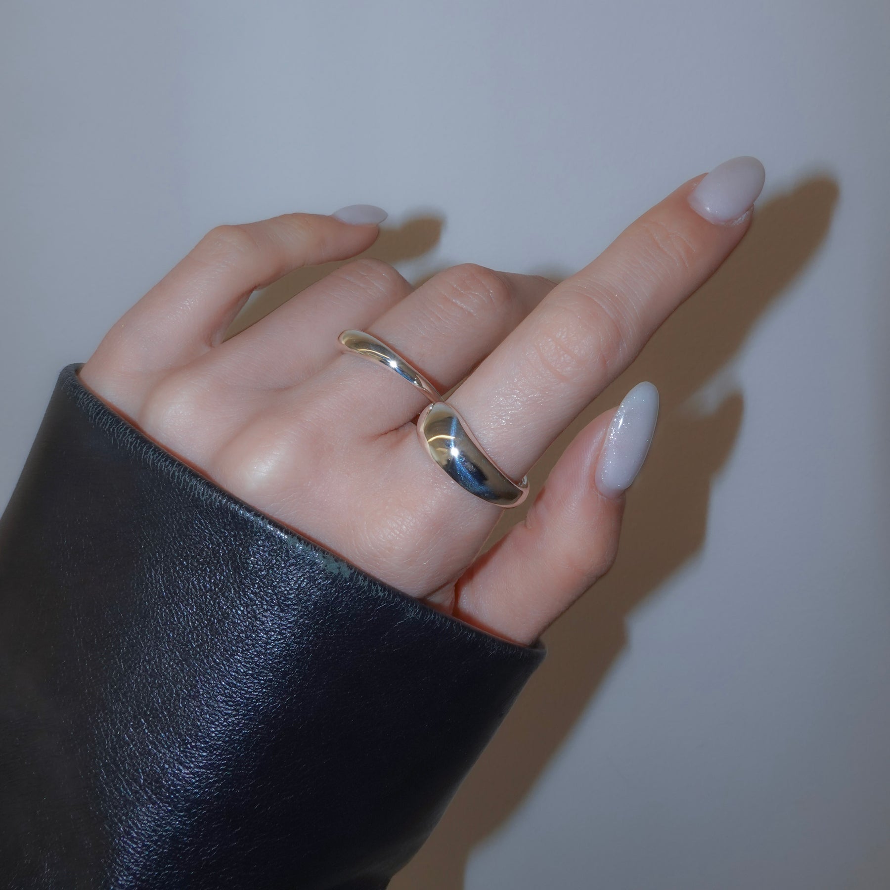 一本のラインがうねりを描きながら二本の指をまたぐ、立体的なダブルフィンガーリングです。