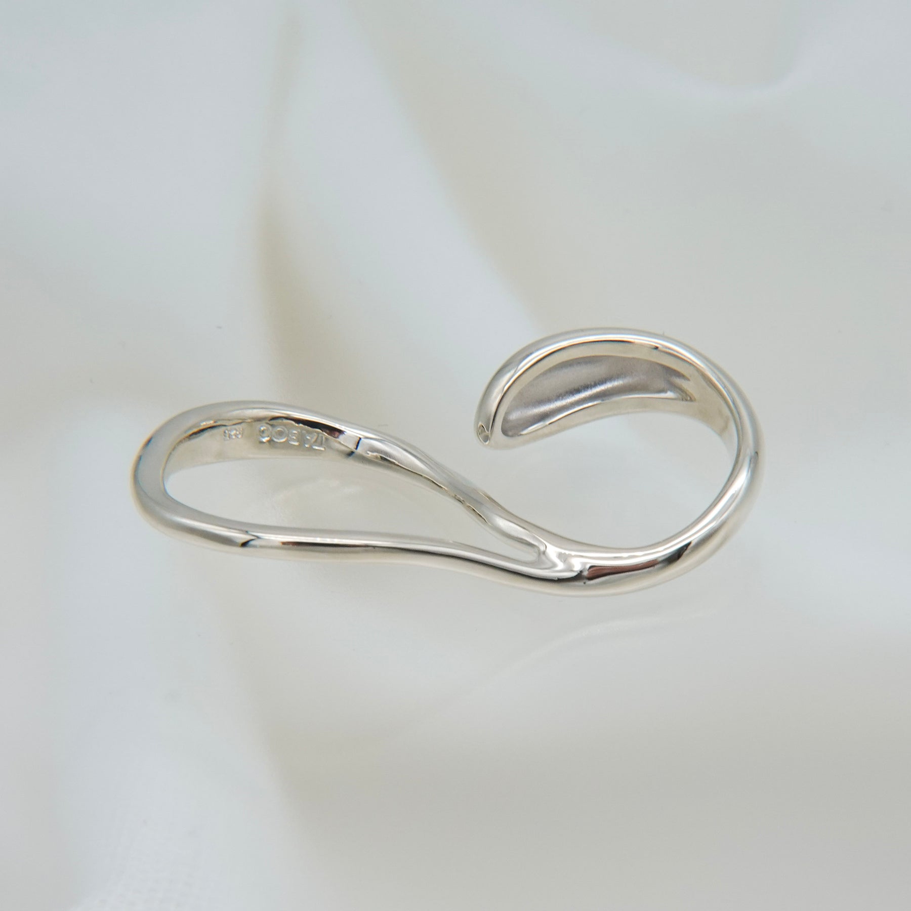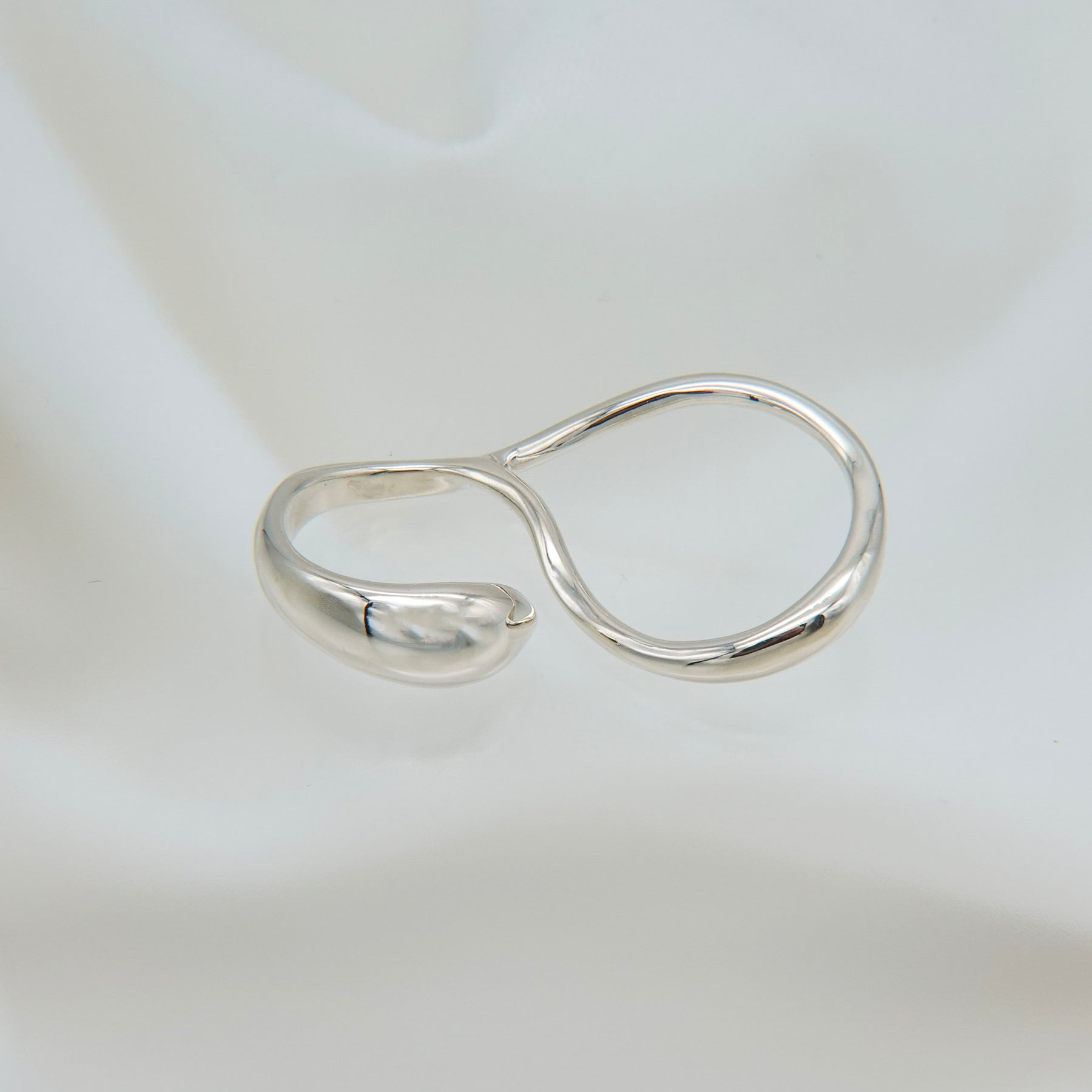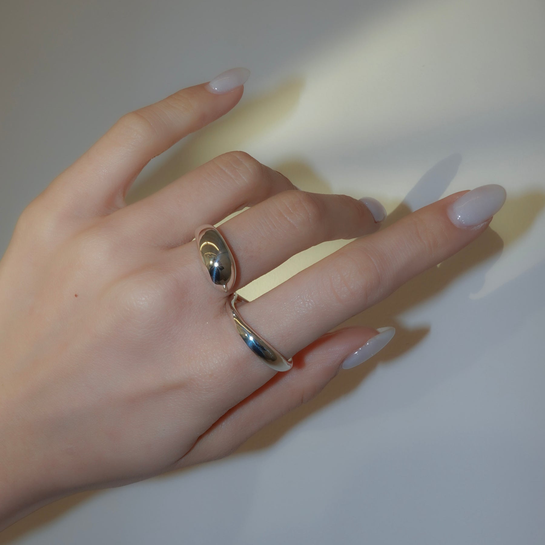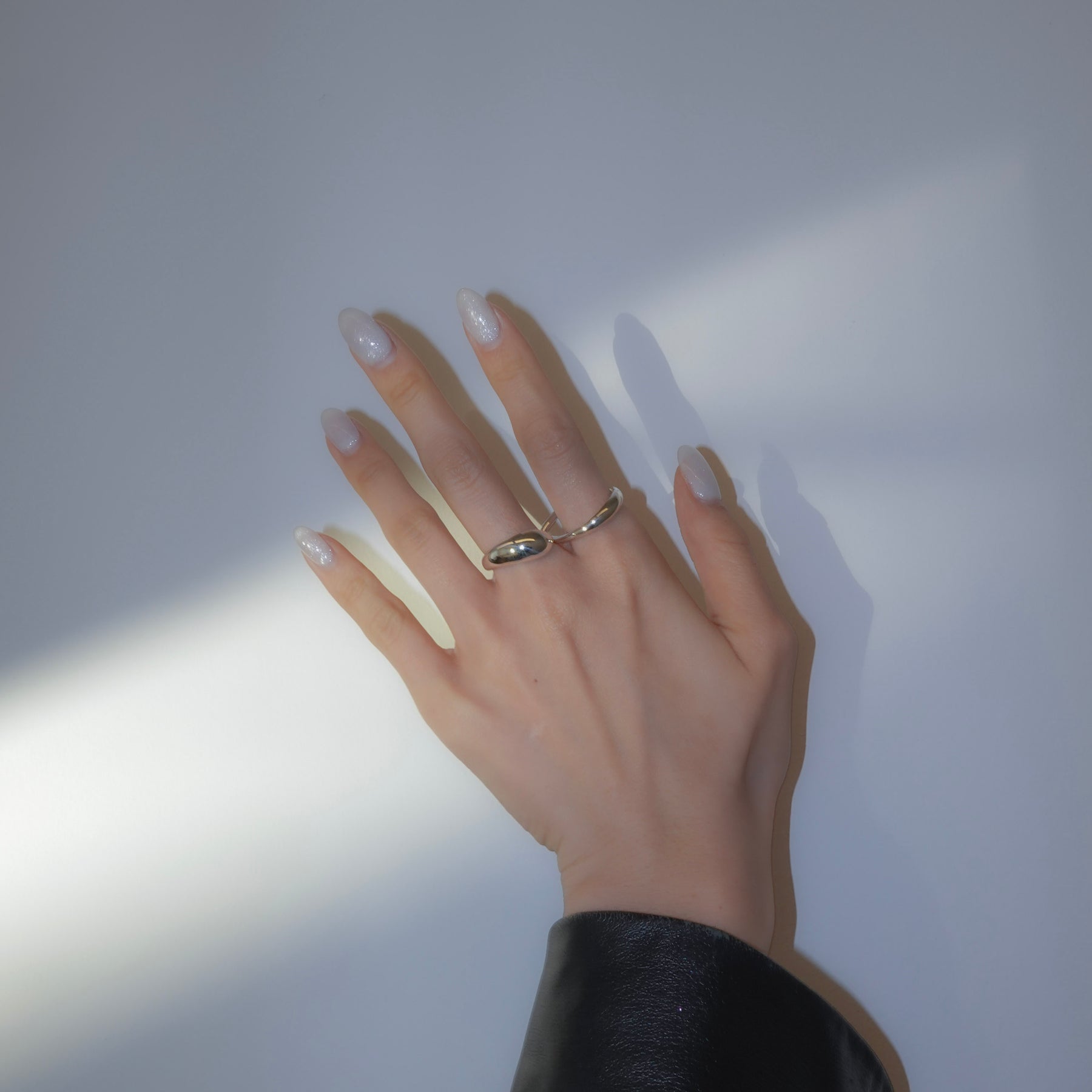 二つのリング部分を一体でつないだ設計で、指の動きに沿って安定感のある着用バランスに仕上げています。