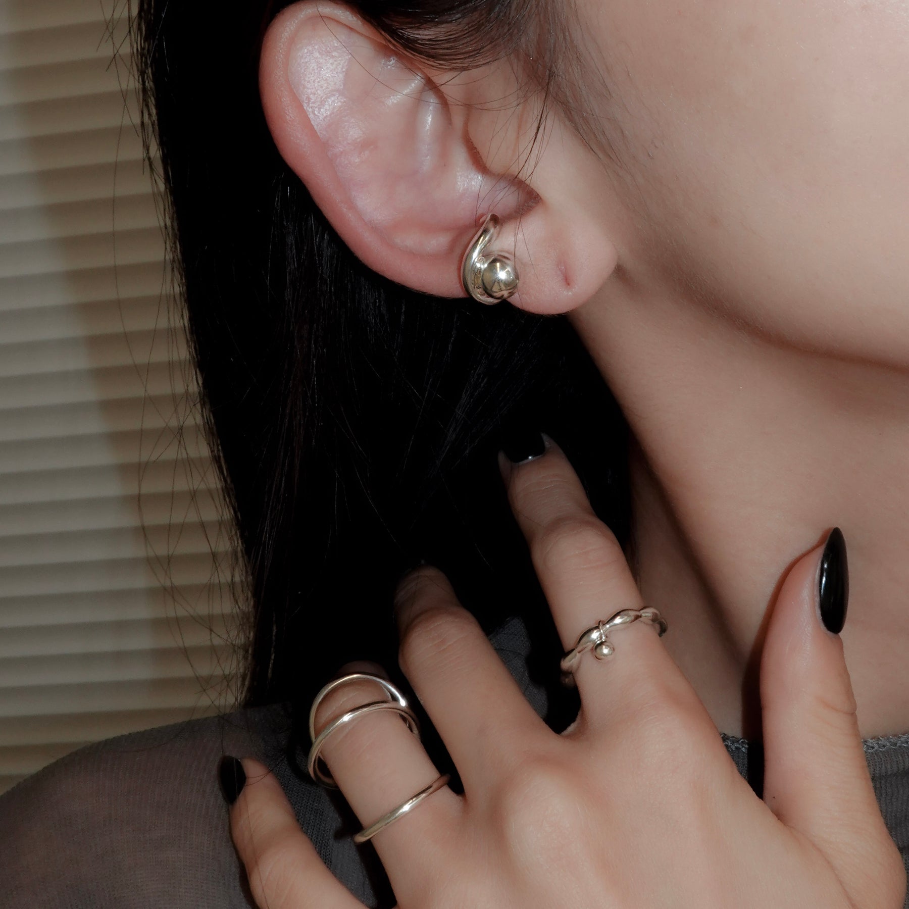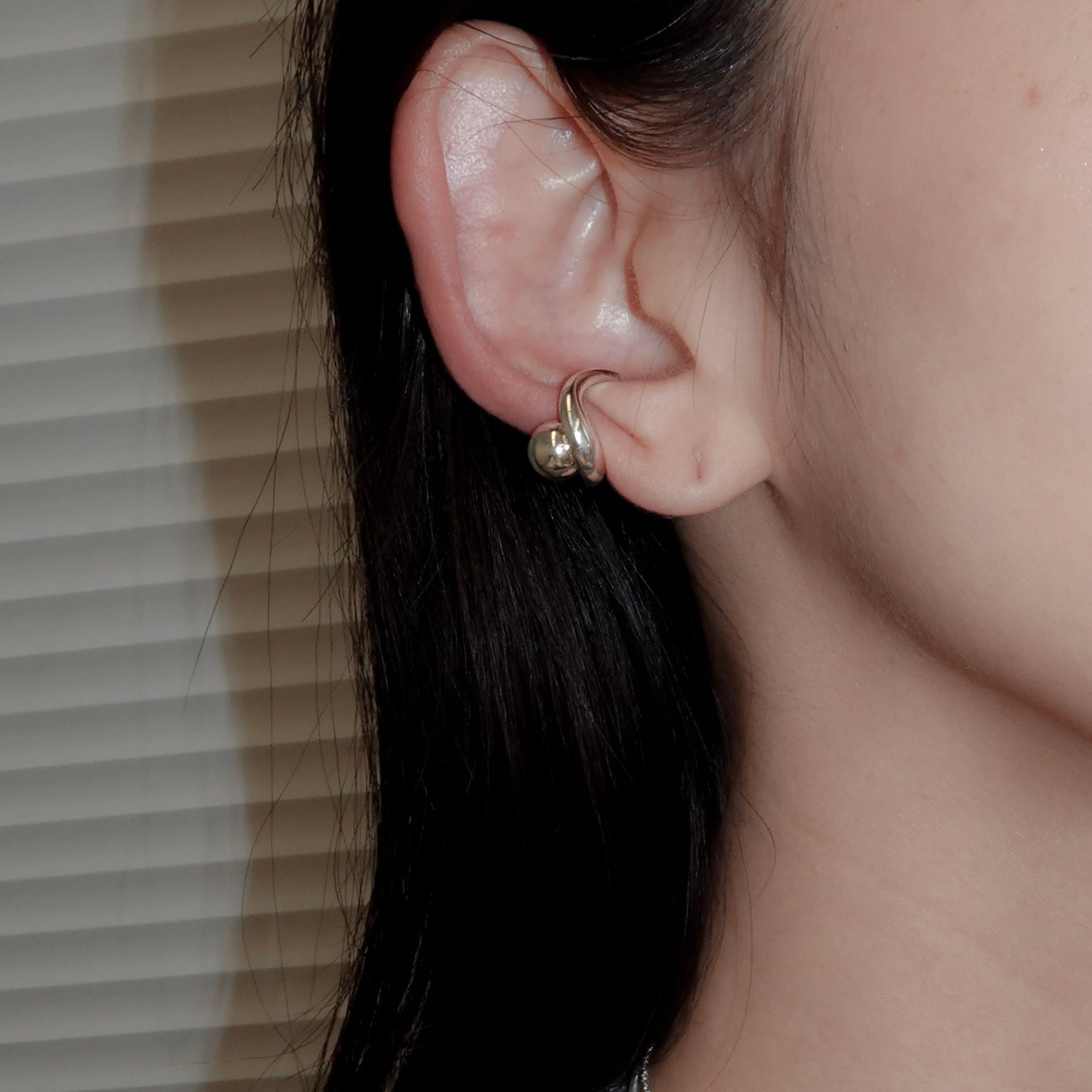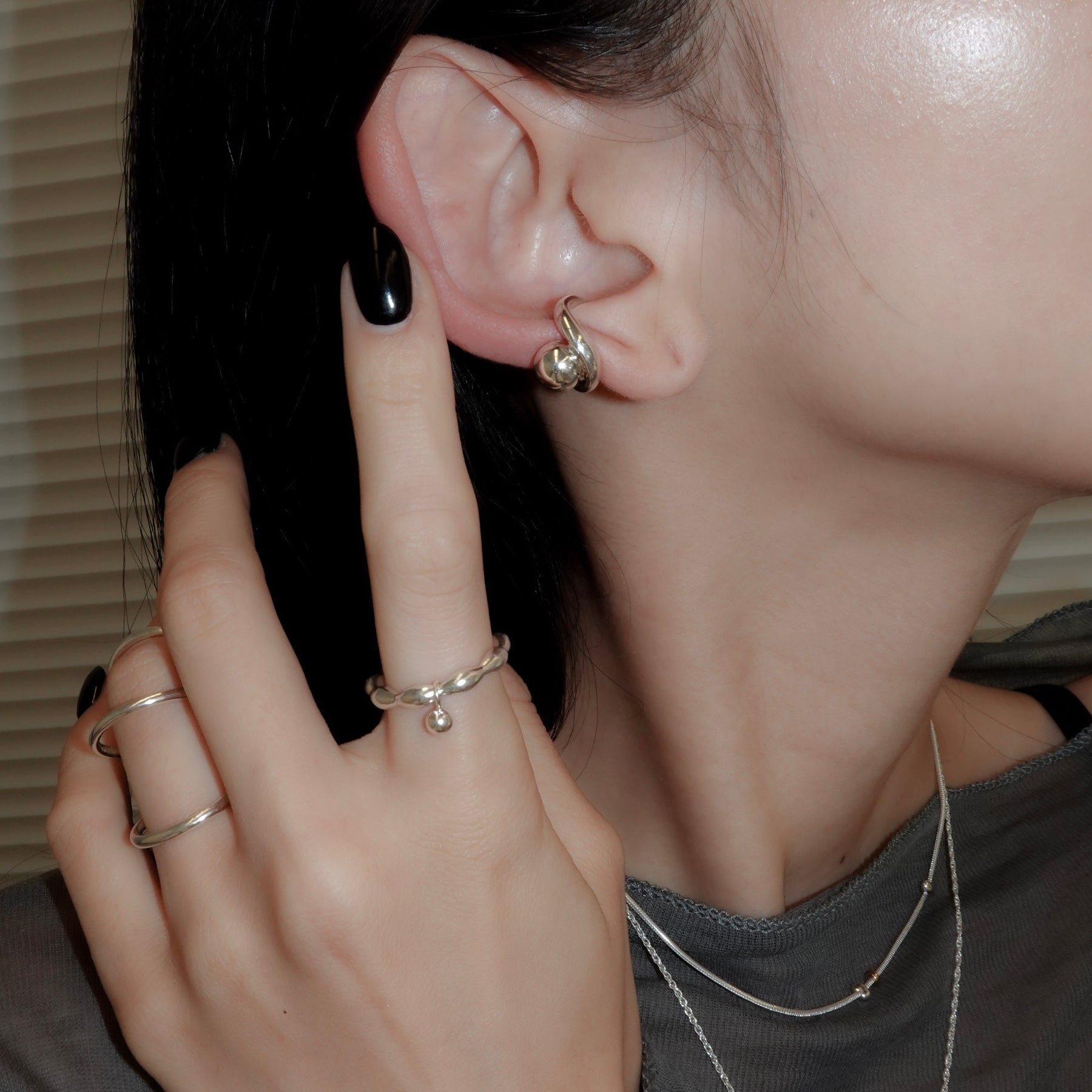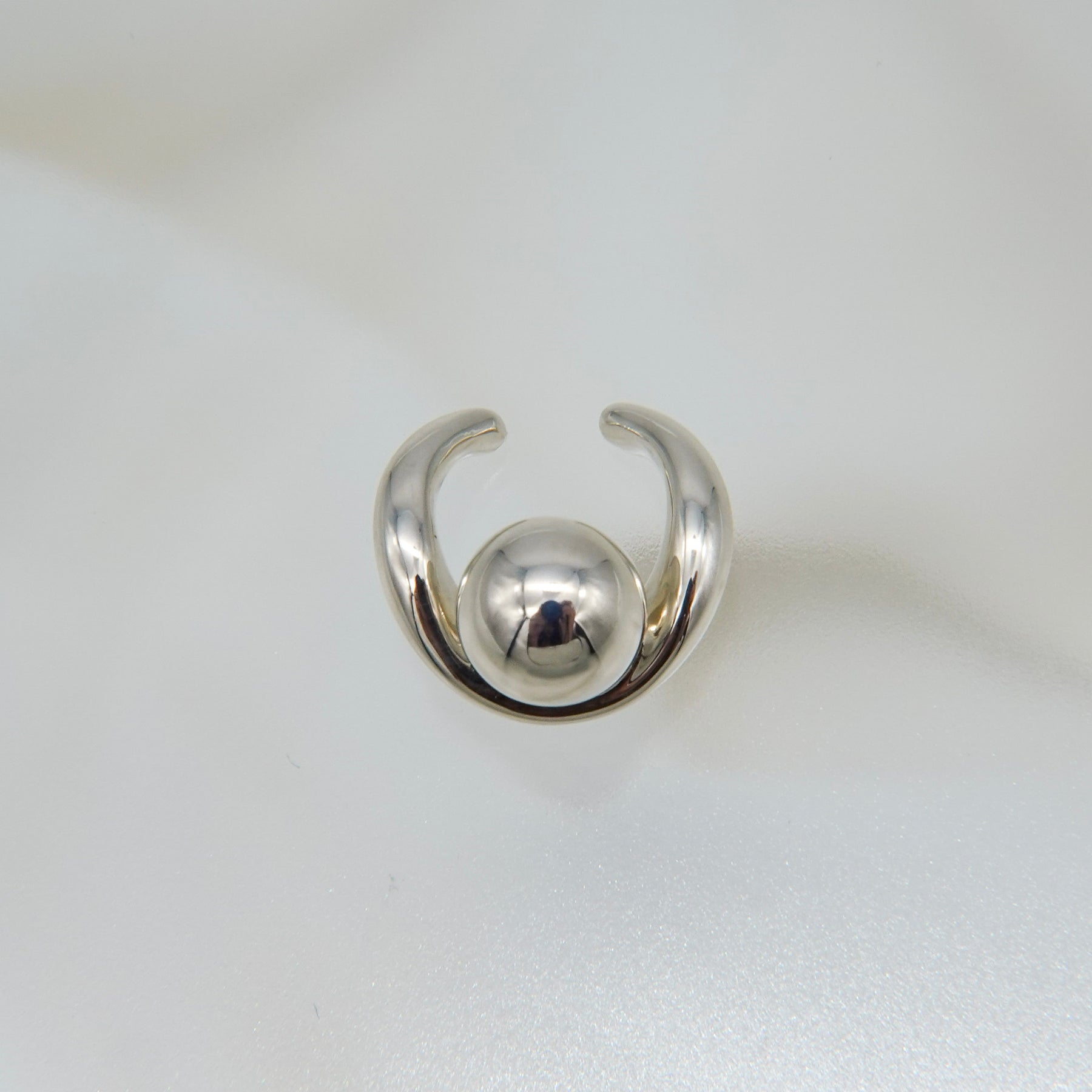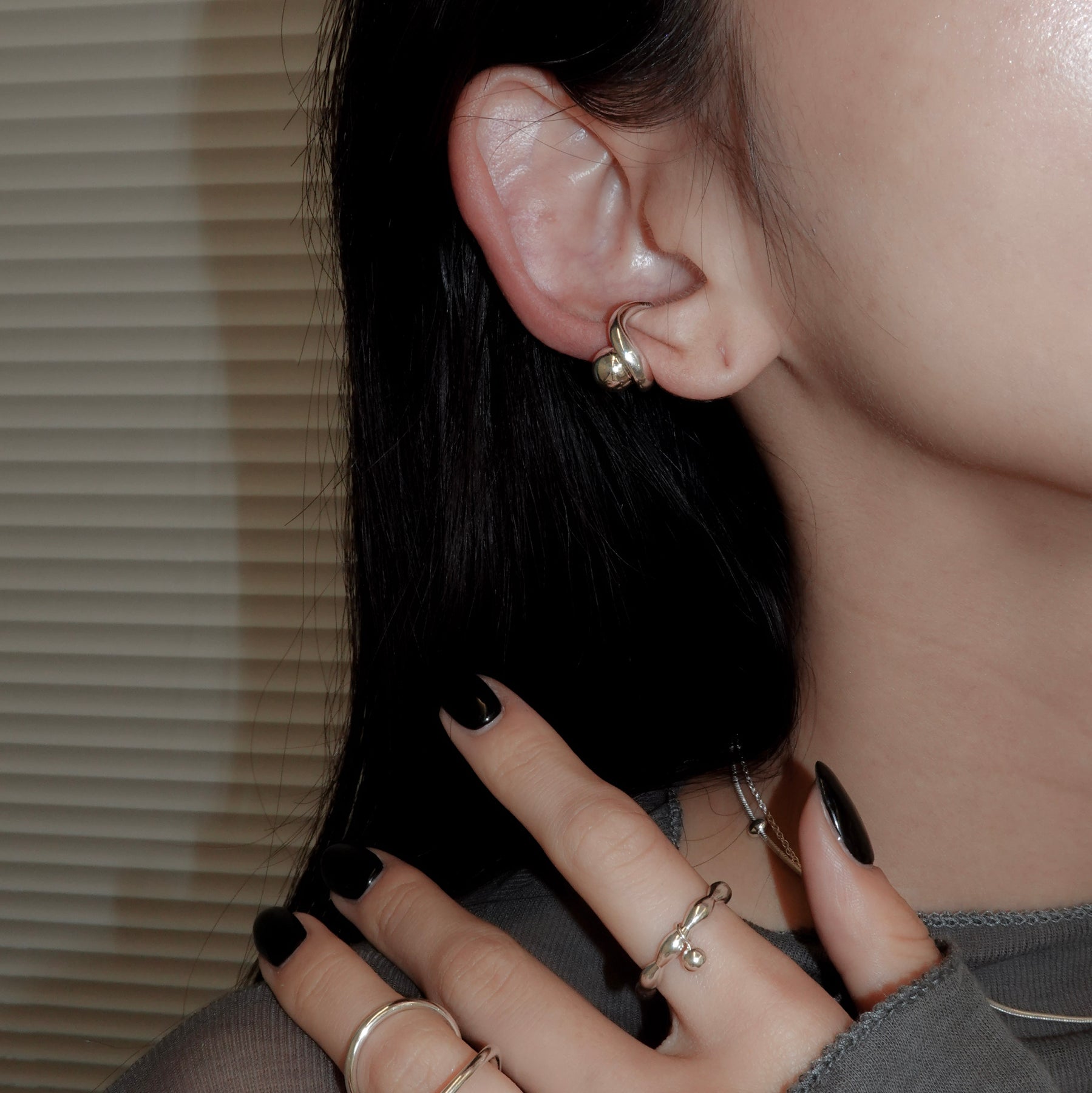 耳に沿うようなフォルムと、目を惹く丸玉モチーフが特徴的なデザイン。全体的にぷっくりとしたボリュームがあり、ひとつで雰囲気の出るイヤカフです。上下反対にすることでモチーフの見え方が変わり、表情の違いをお楽しみいただけます。