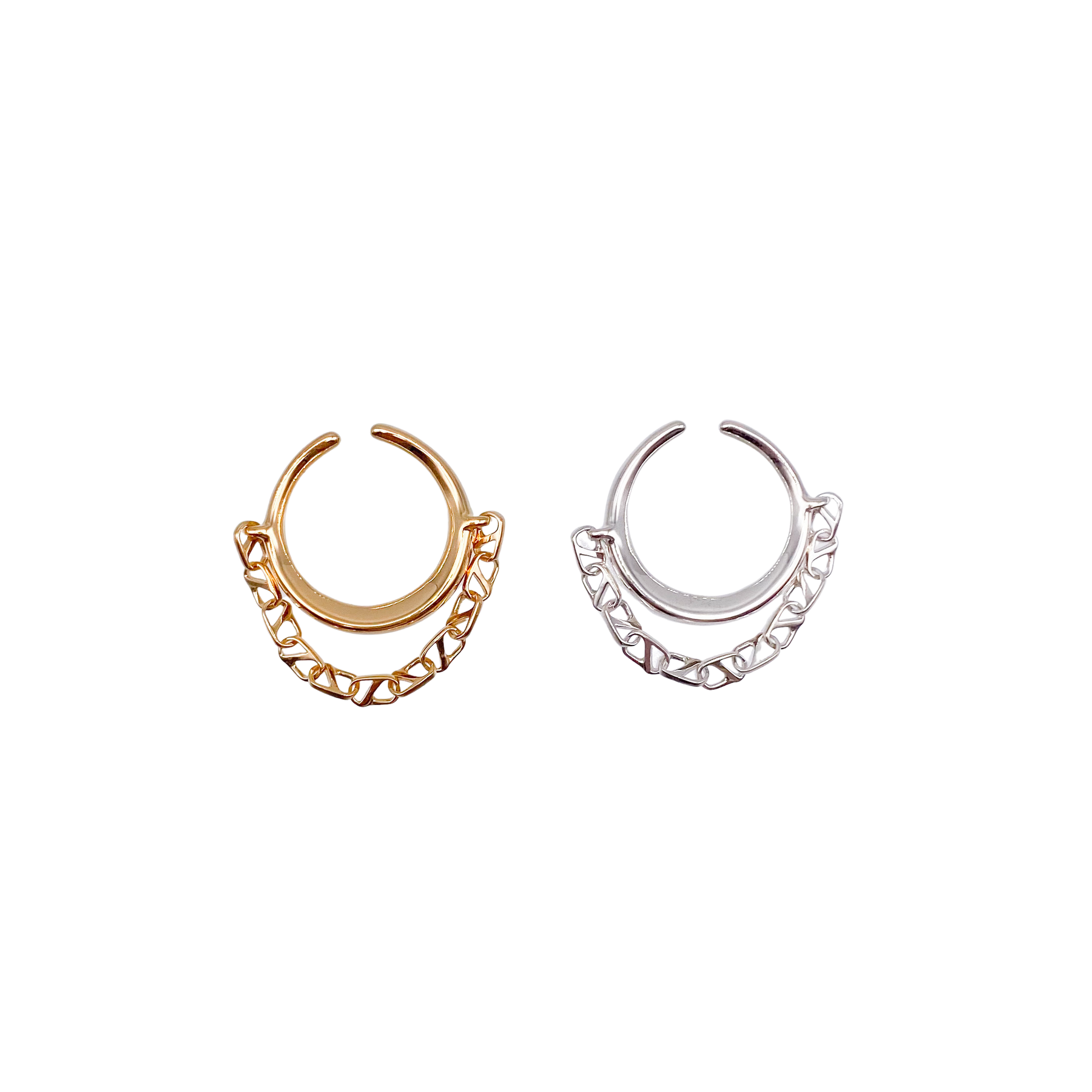 オリジナルチェーンパーツを繋いだイヤカフ。動きがあり、シンプルながらさりげなく個性を演出できます。