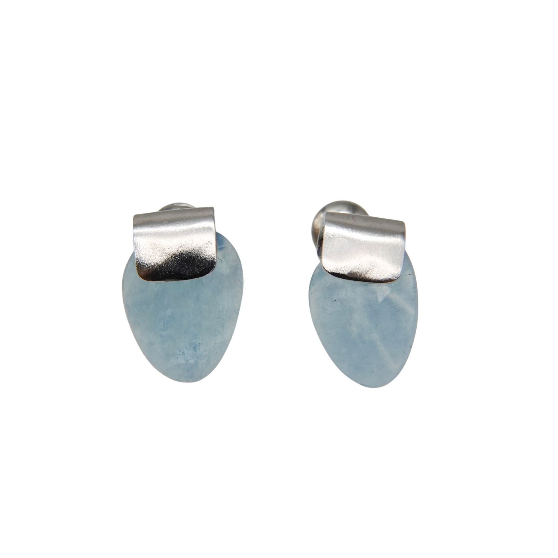 アクアマリンを挟んでいるような不思議なフォルムのピアス。金属部分は穏やかな水面を思わせる有機的なテクスチャー。アクアマリンの自然なフォルムと美しく調和しています。