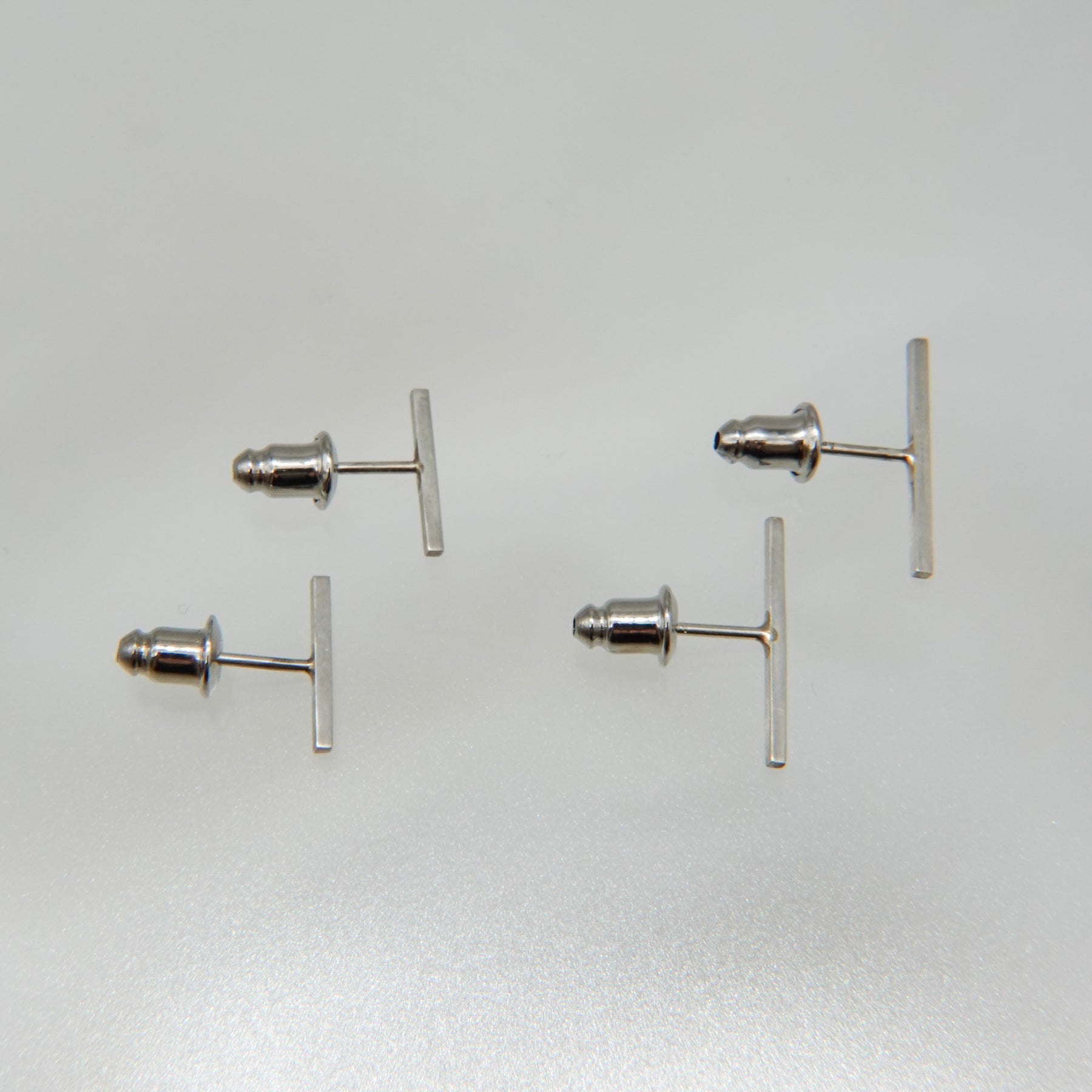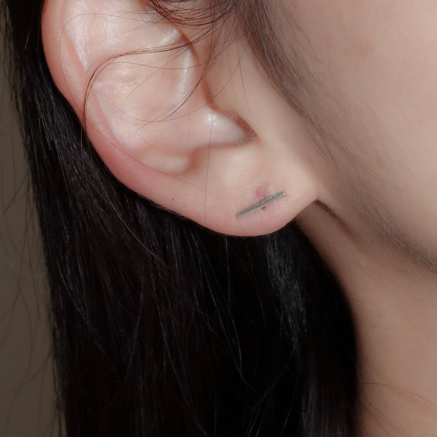 縦・横・斜め、360度どのようにも着用できるデザインのバーピアス。耳を縫っているように見えます。マット加工で落ち着いた印象です。
