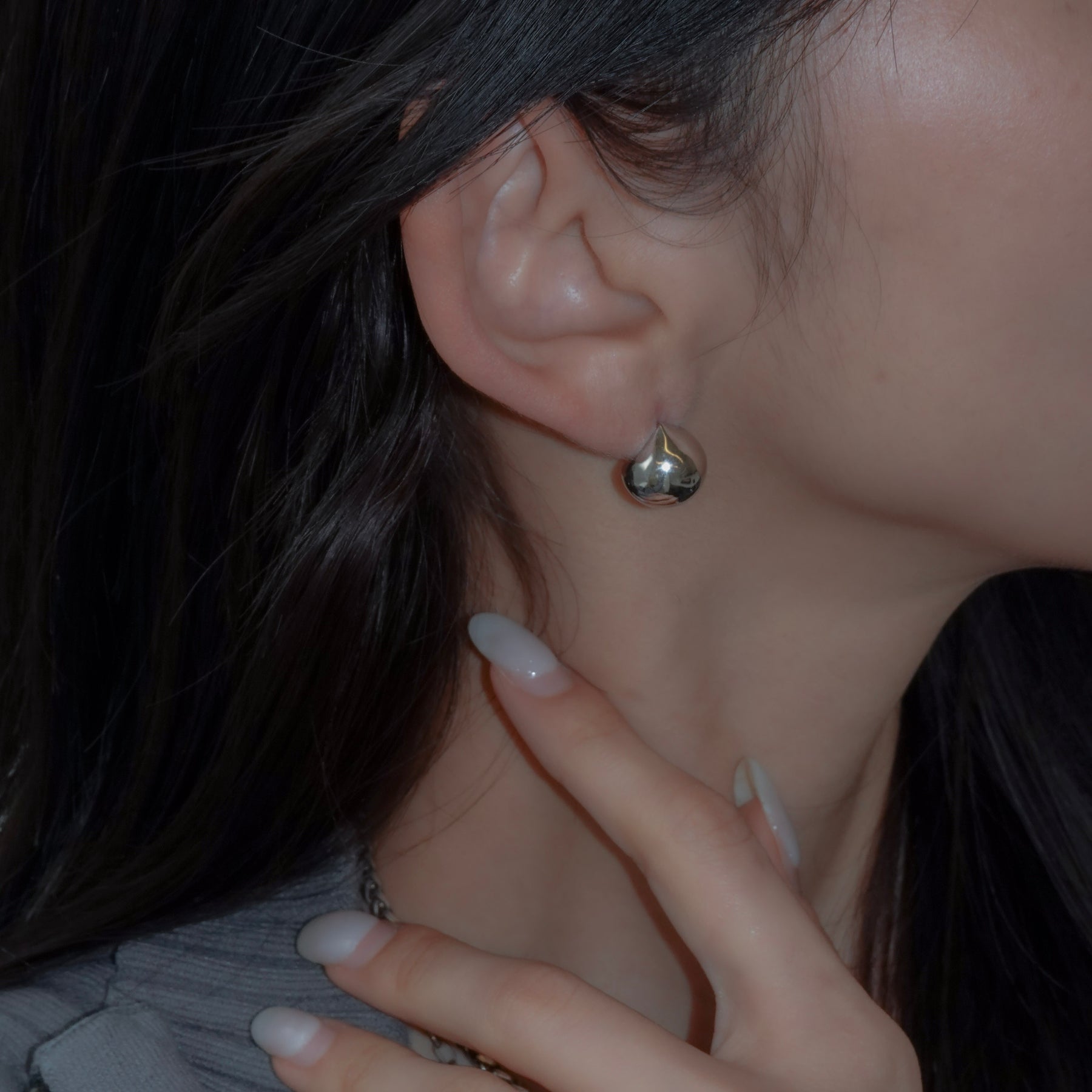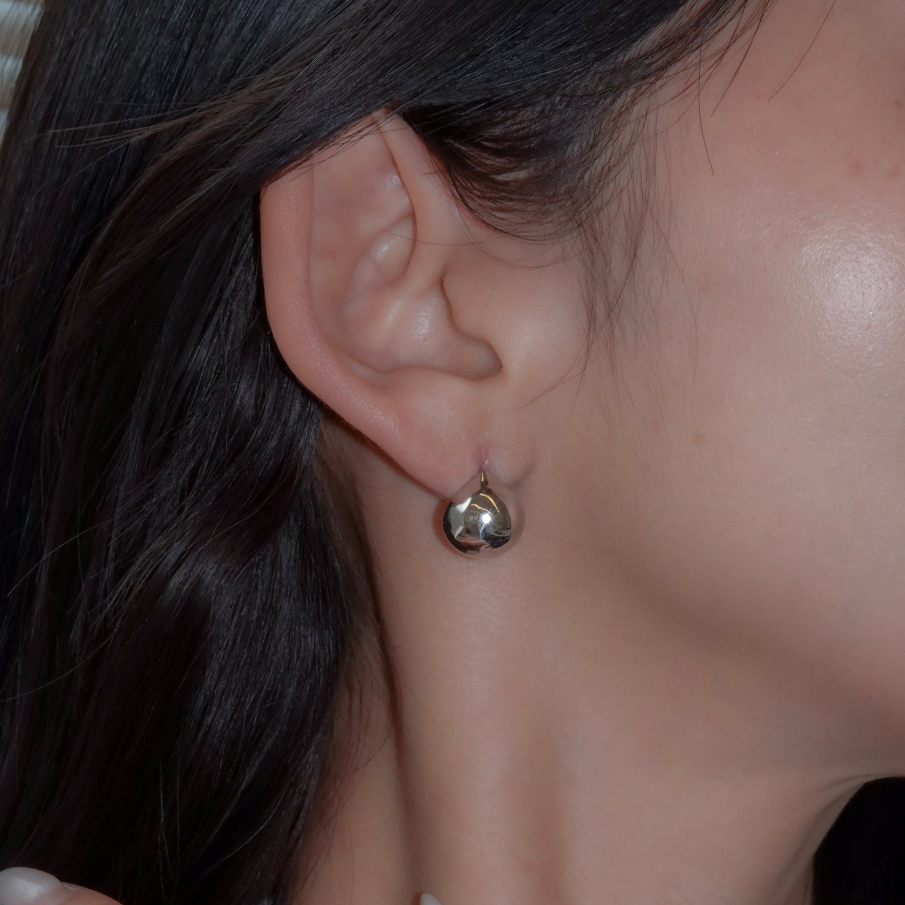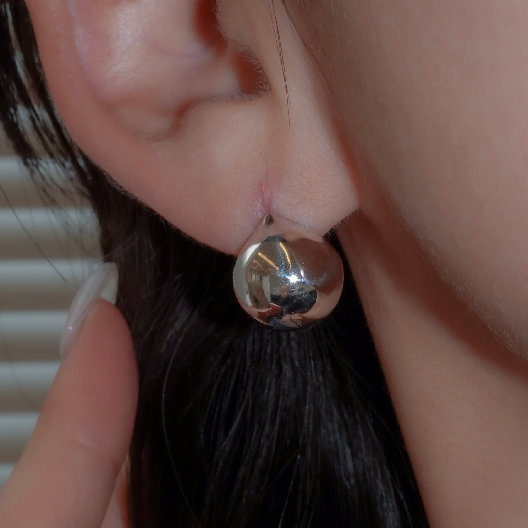ボールモチーフが耳たぶをそっと挟み込む、無駄をそぎ落としたシンプルなピアス。