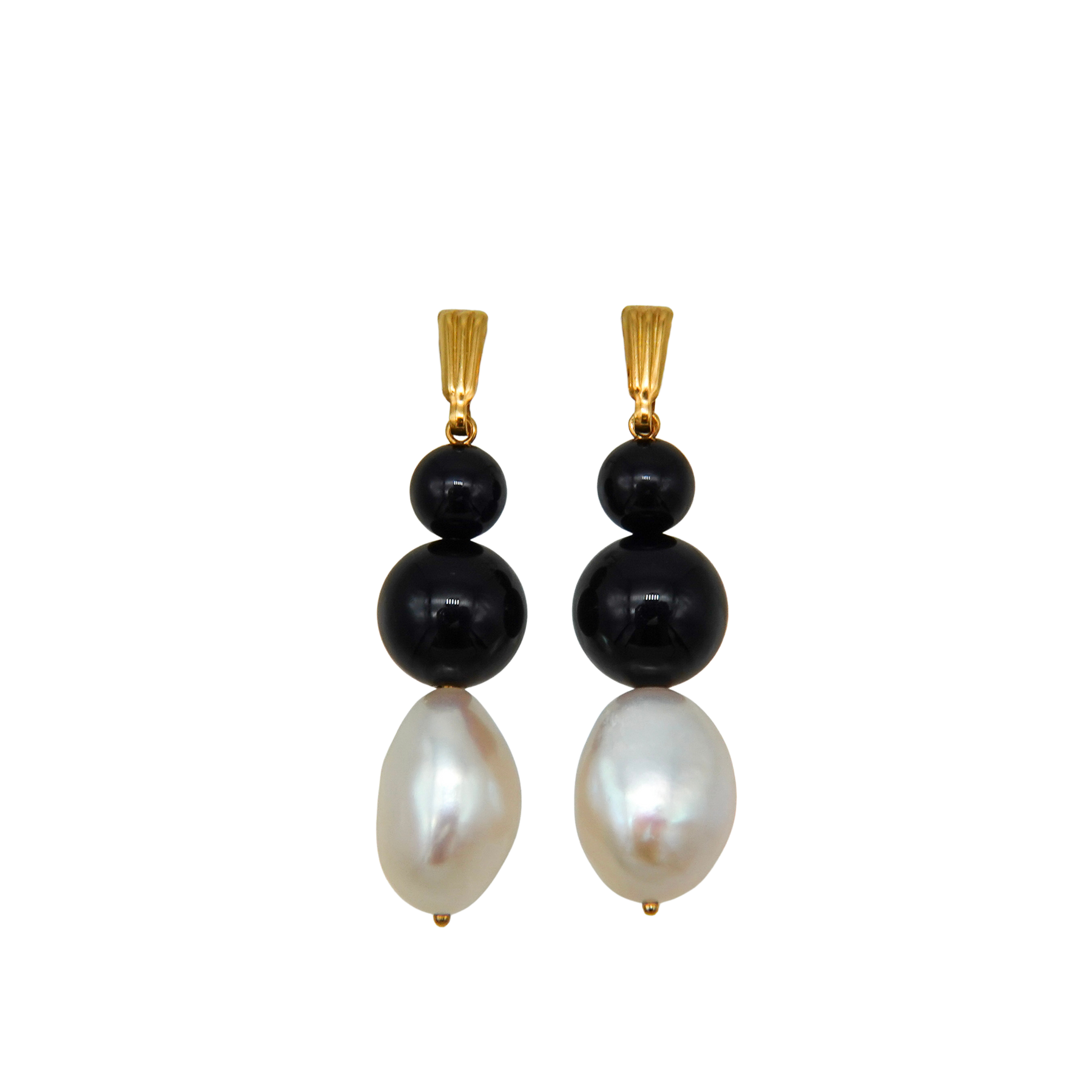 ヴィンテージな雰囲気が漂う、14-15mm玉バロックパールにオニキスのラウンドストーンを配した揺れるタイプのデザインピアス。