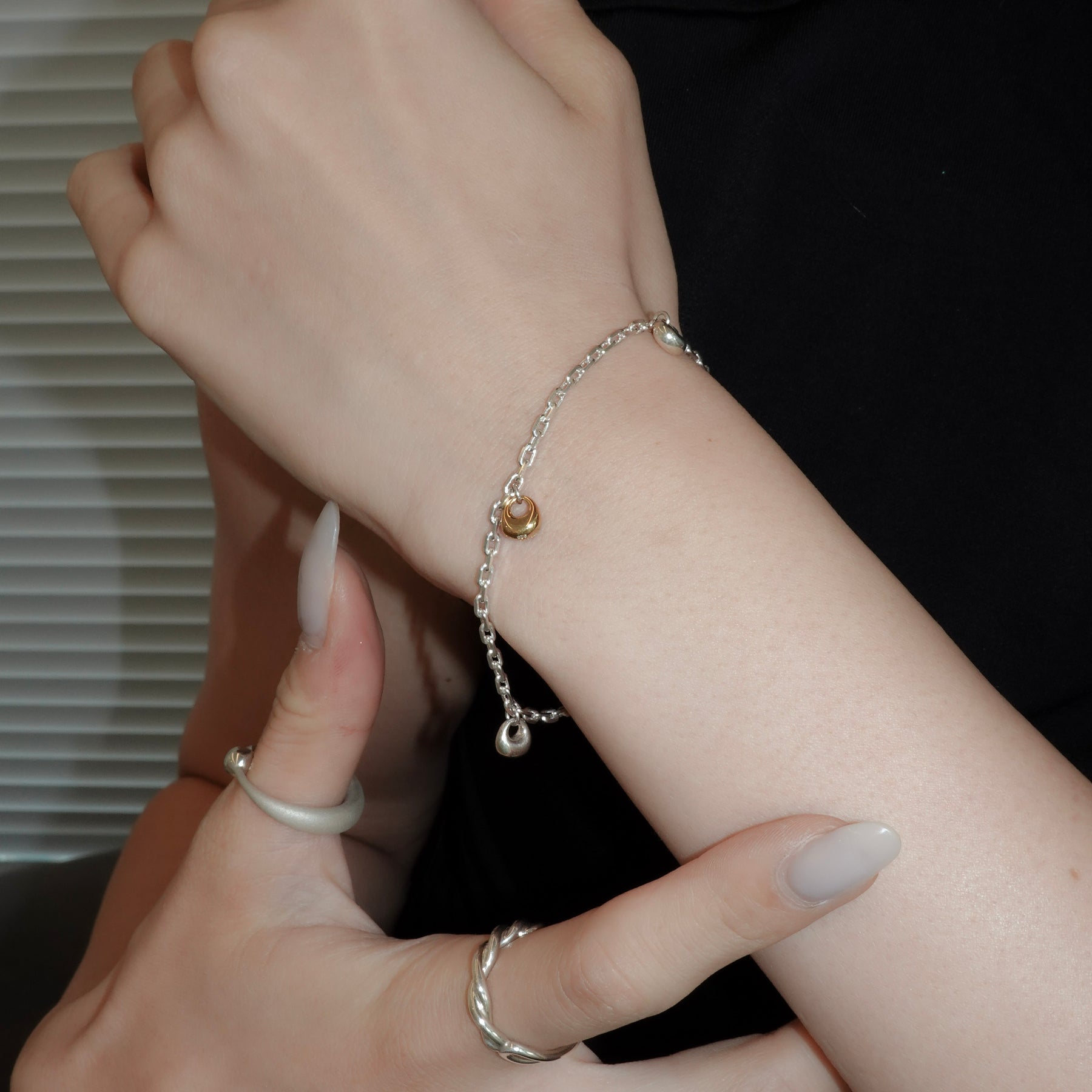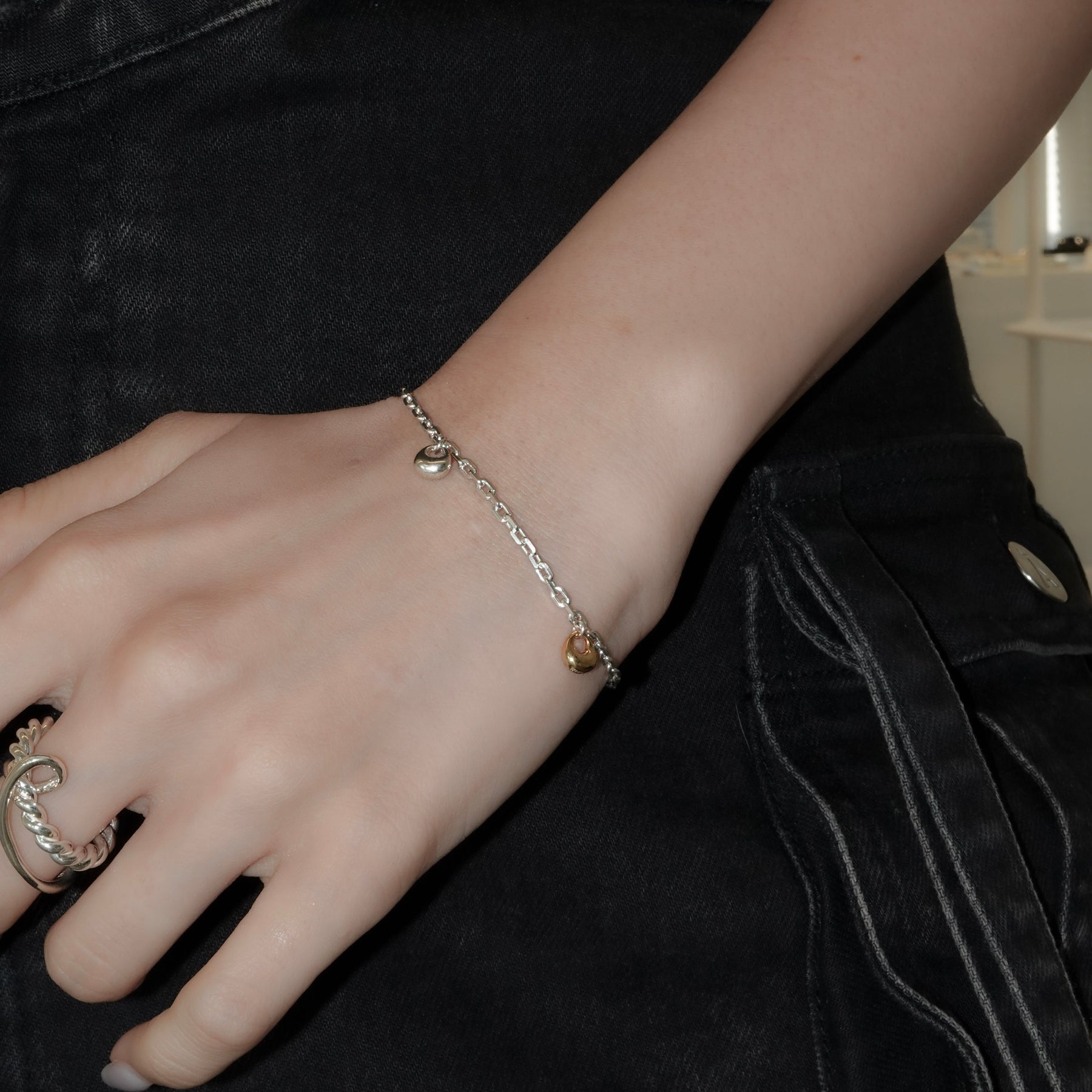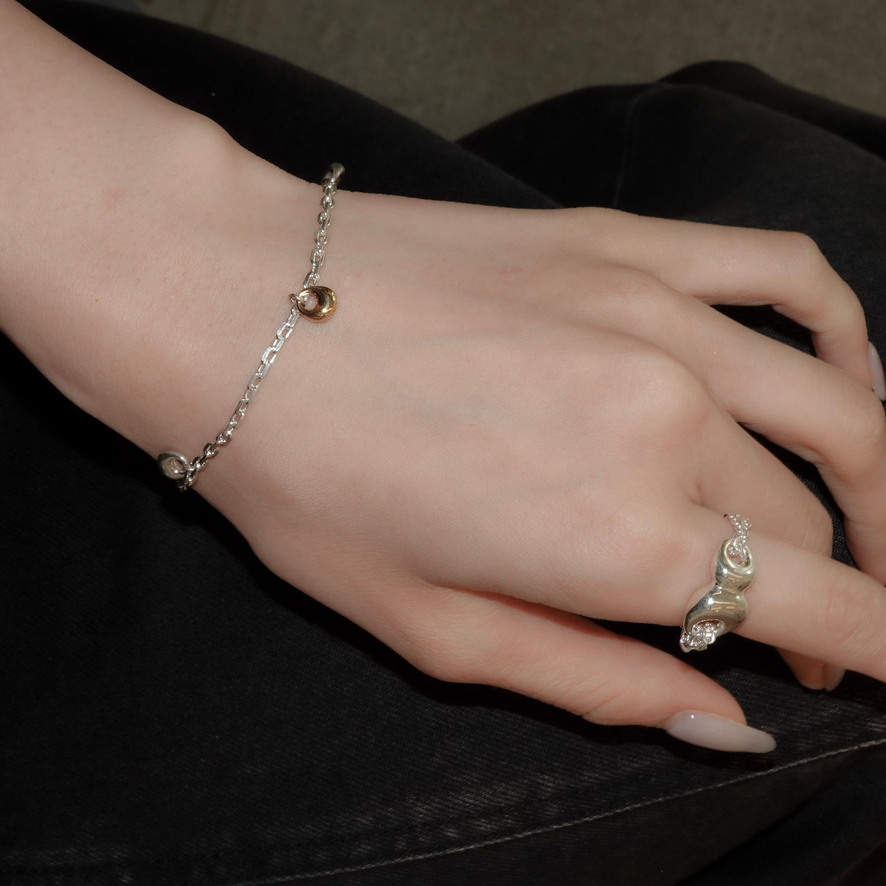 中央のモチーフには18Kゴールドプレーティング加工を施し、静かに佇むそれらのパーツは、手首の動きに呼応して、わずかにきらめきを揺らします。