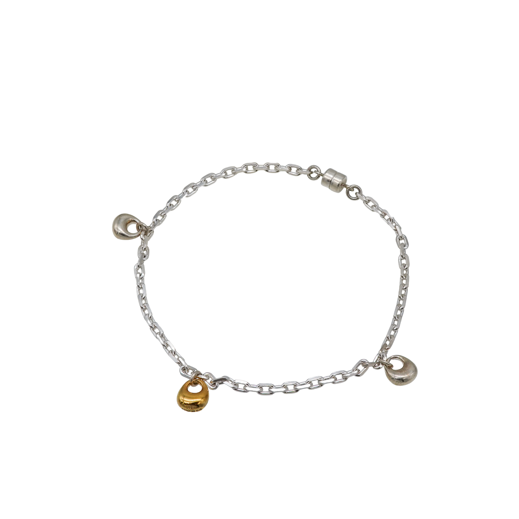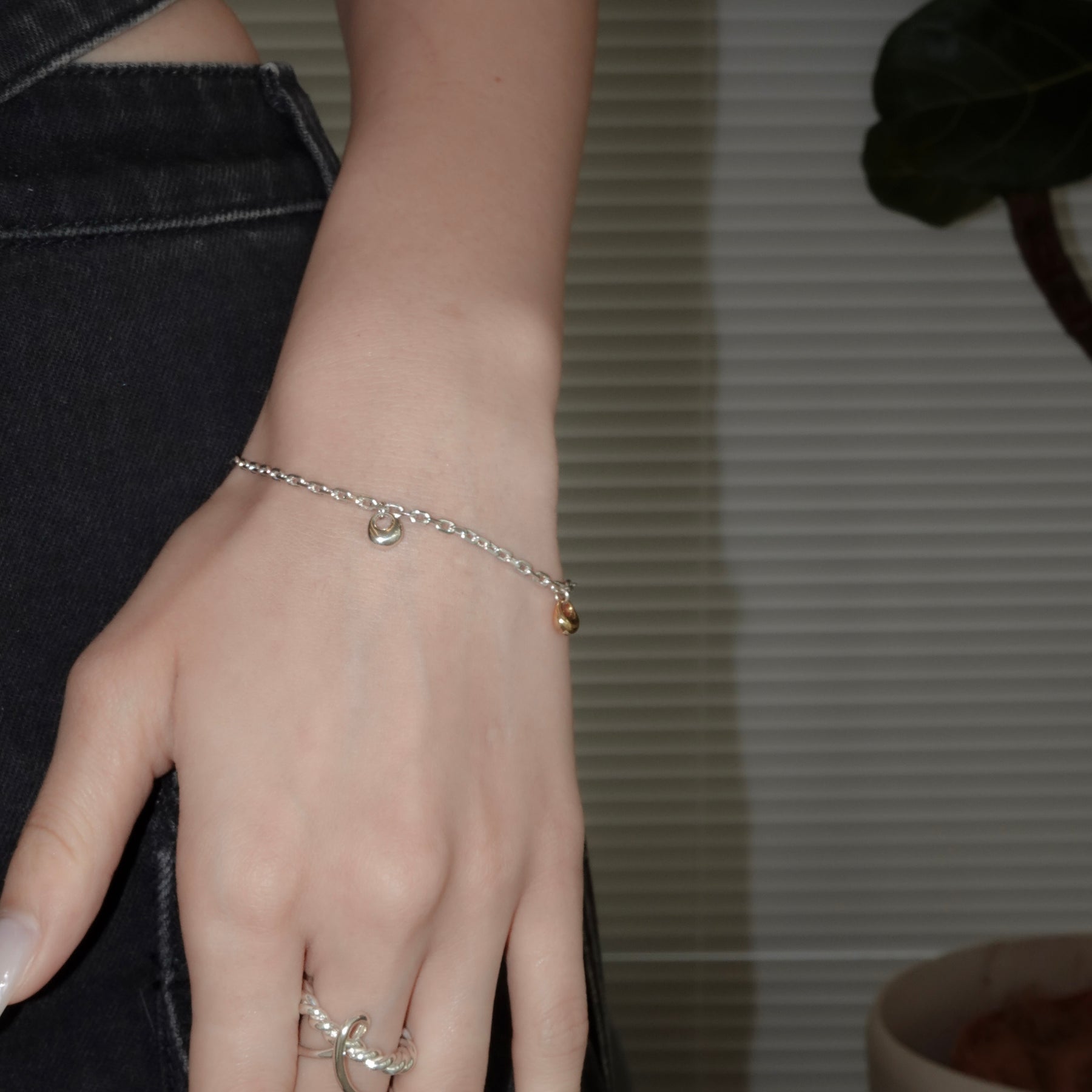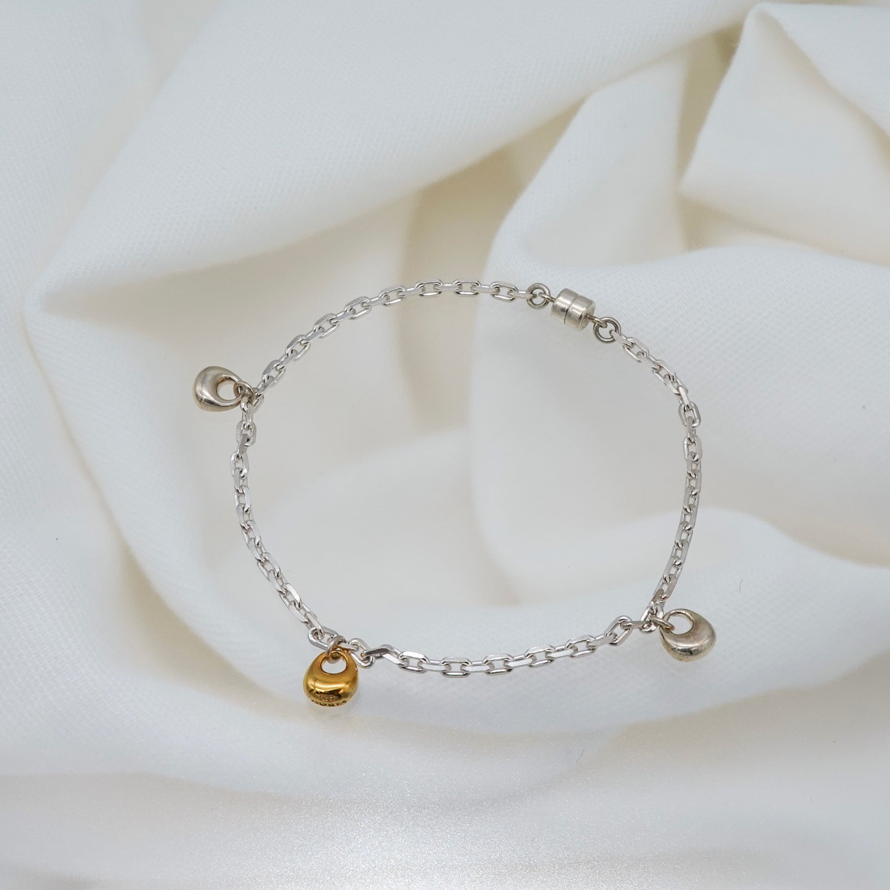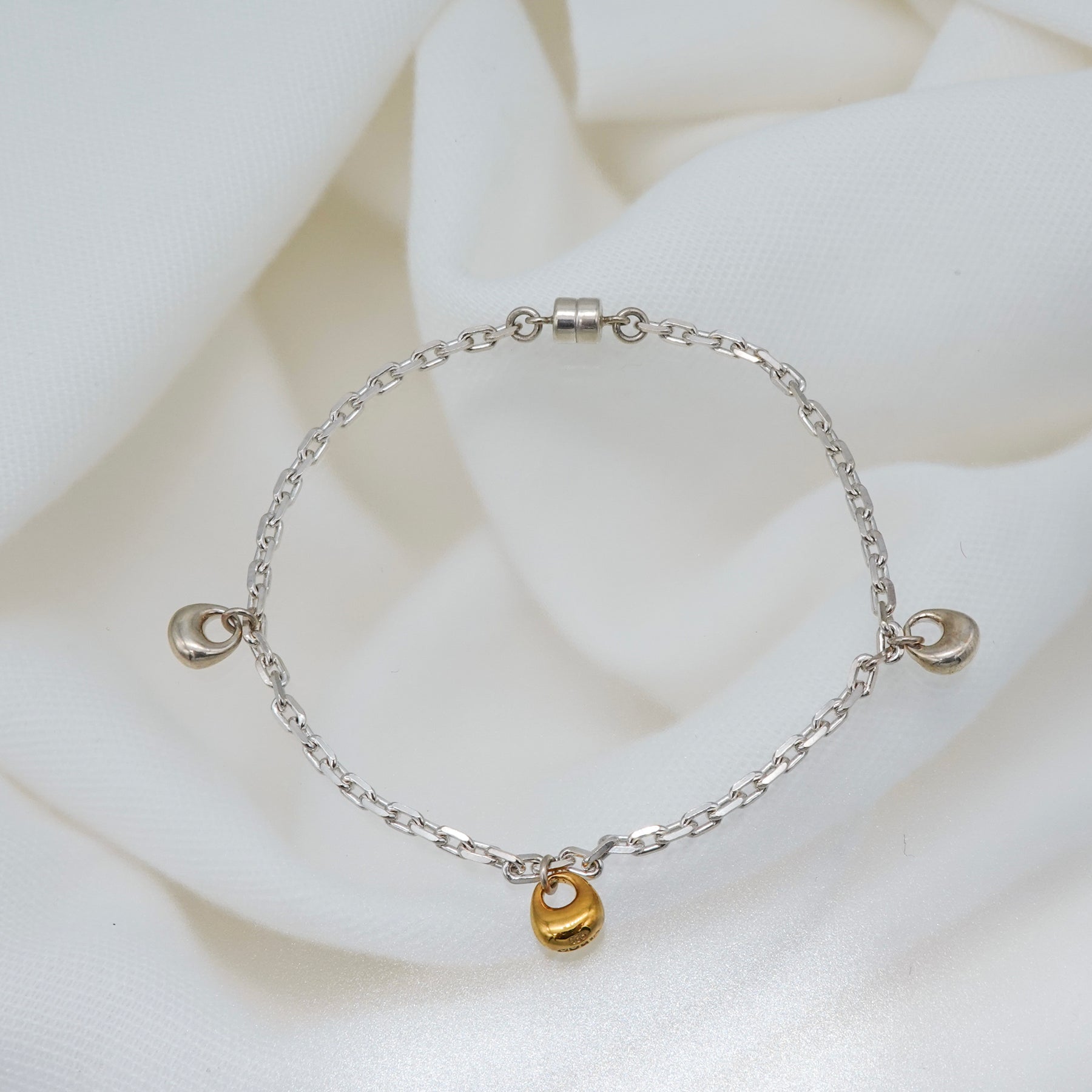 中央のモチーフには18Kゴールドプレーティング加工を施し、静かに佇むそれらのパーツは、手首の動きに呼応して、わずかにきらめきを揺らします。