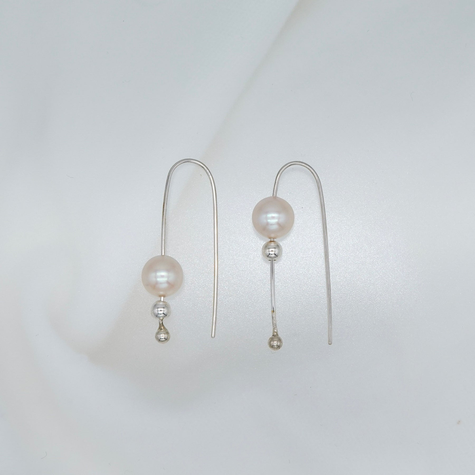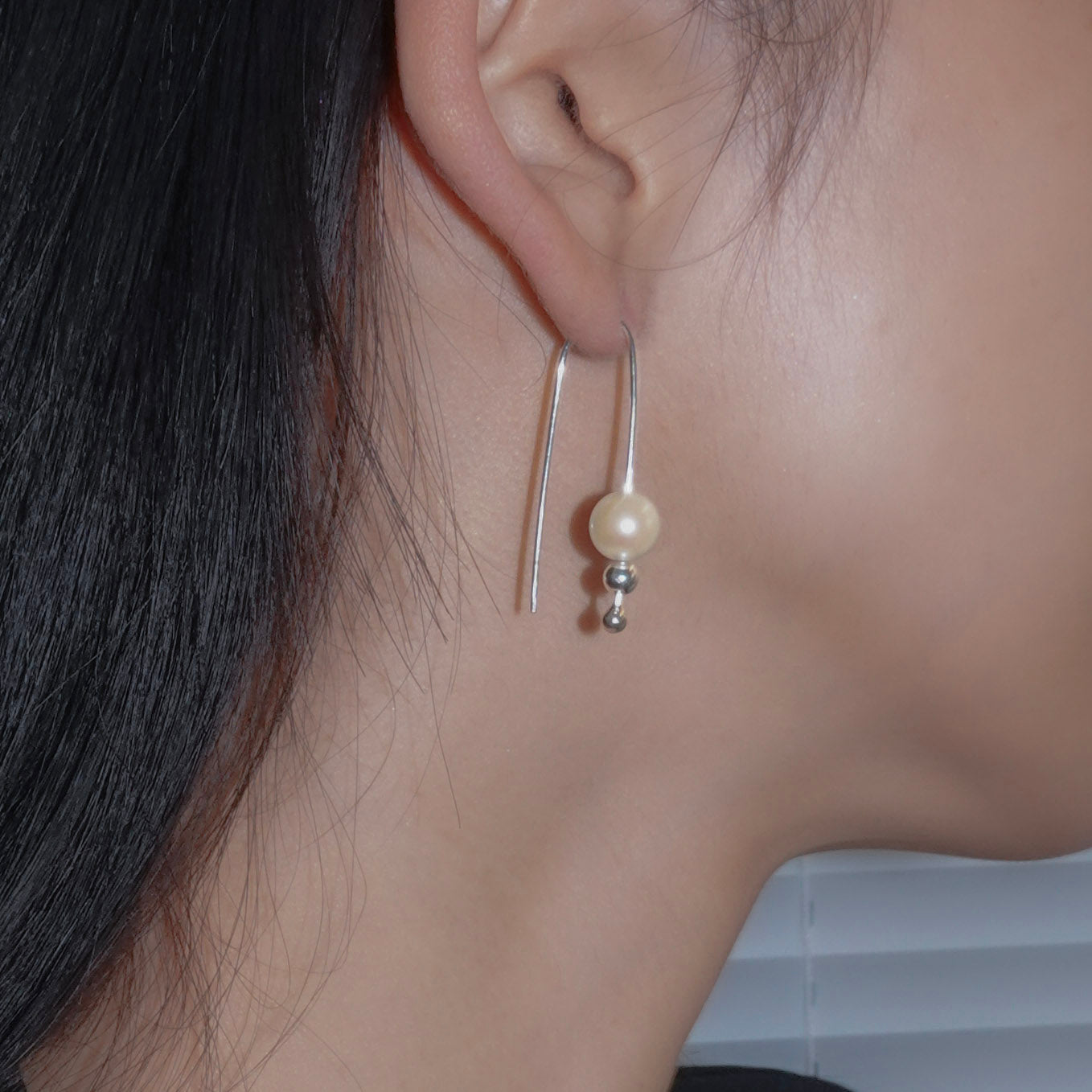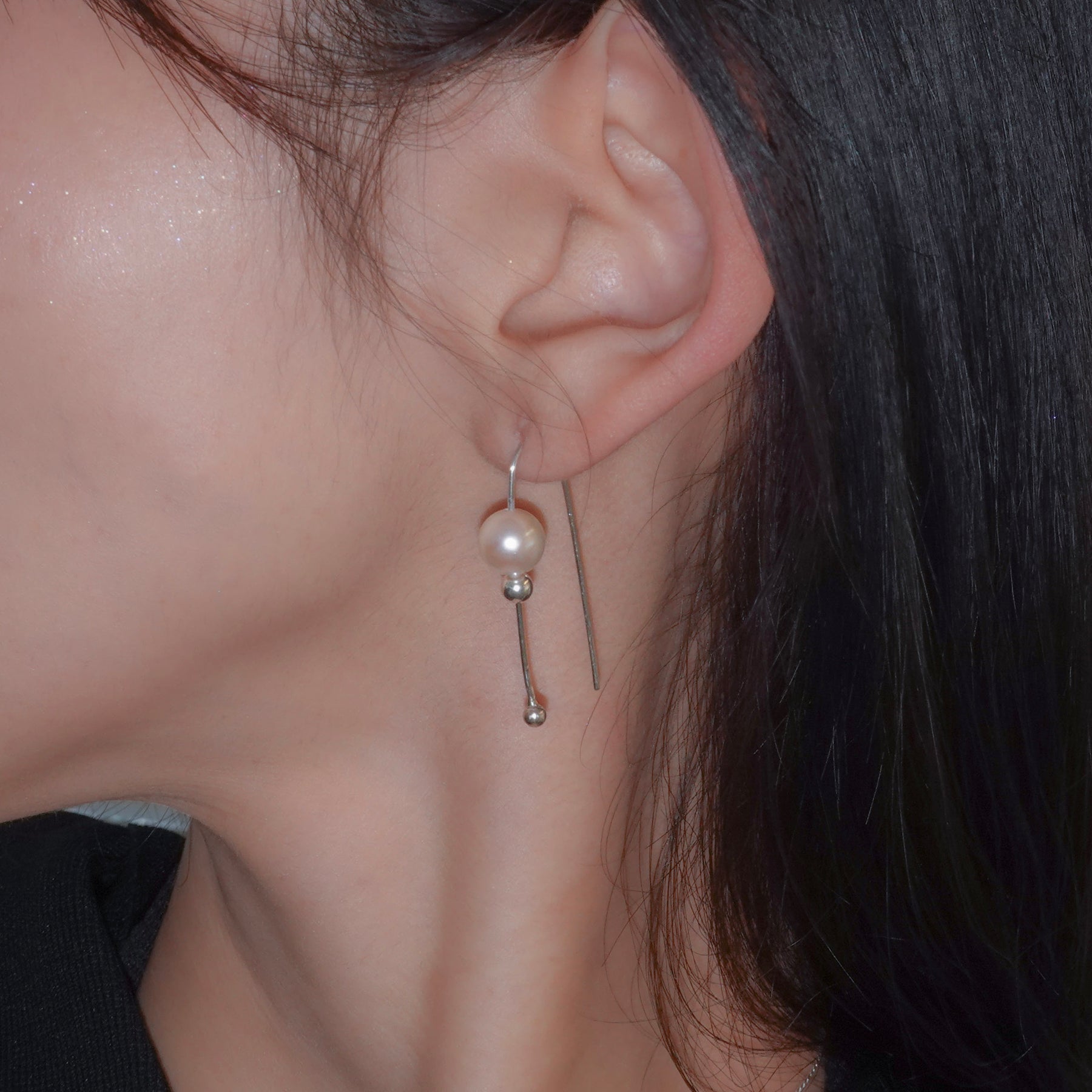 約8mmの国産あこや真珠を贅沢に使用。キャッチが無くてもバランスよく耳に収まるようデザインされたピアス。シルバーの球とあこやの真珠の間にあるシルバーボールは可動し、好きな位置に固定できます。フォーマルシーンではシンメトリーに配置、カジュアルシーンではアシンメトリーに配置するなど、変化を楽しめるデザイン。