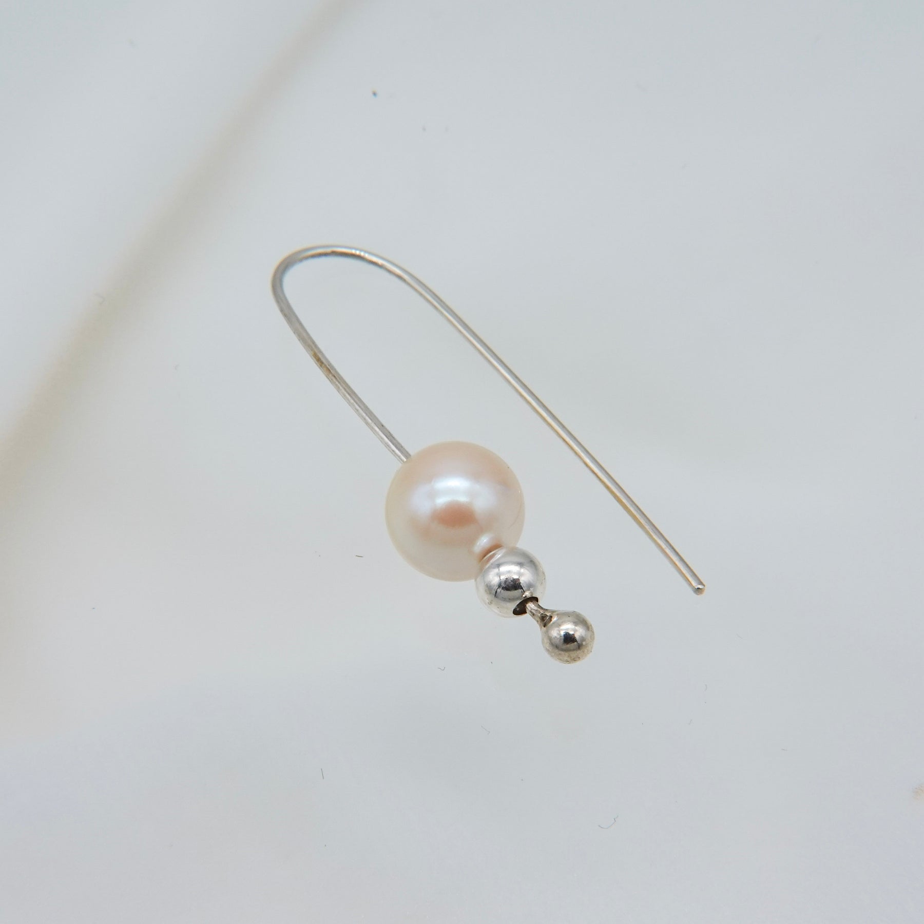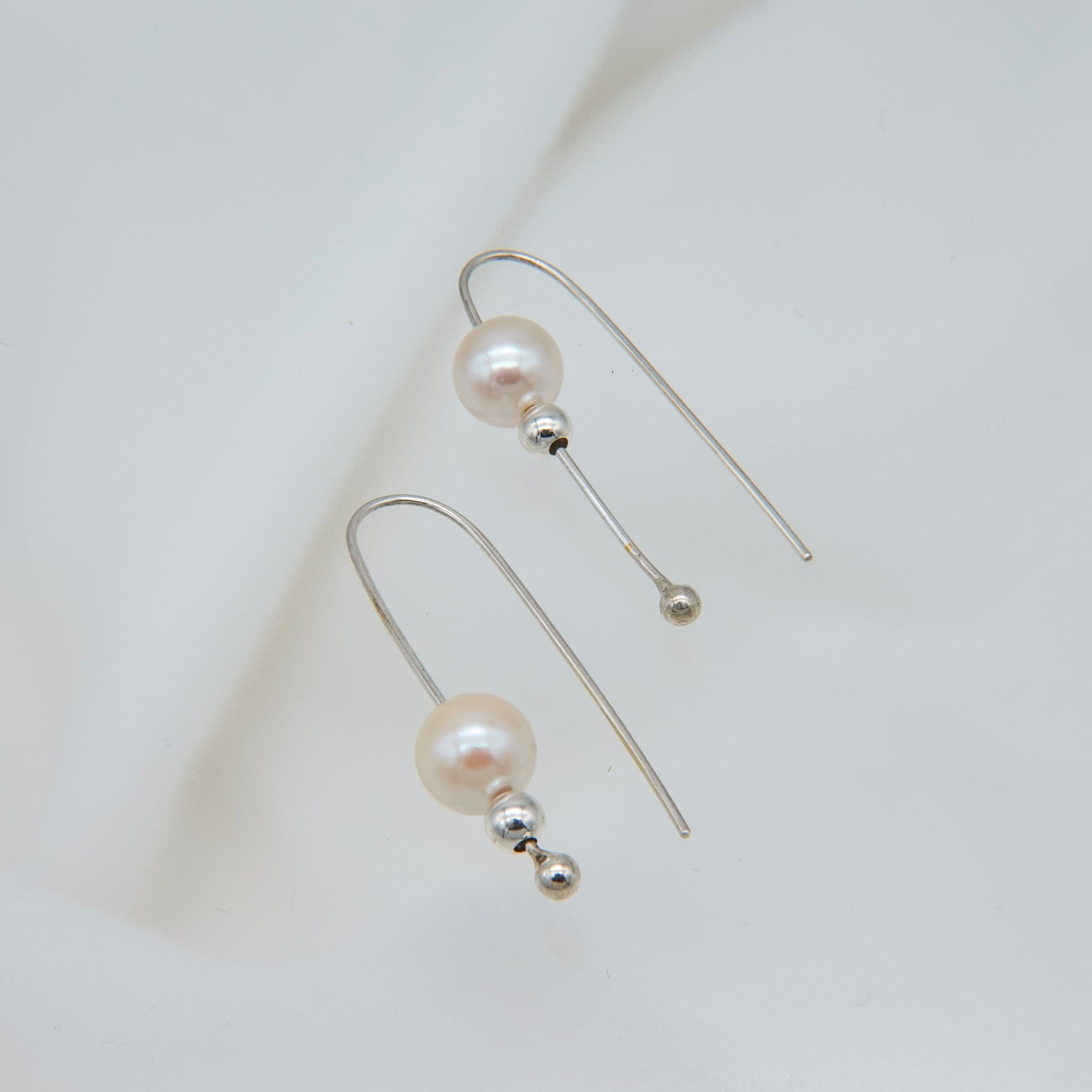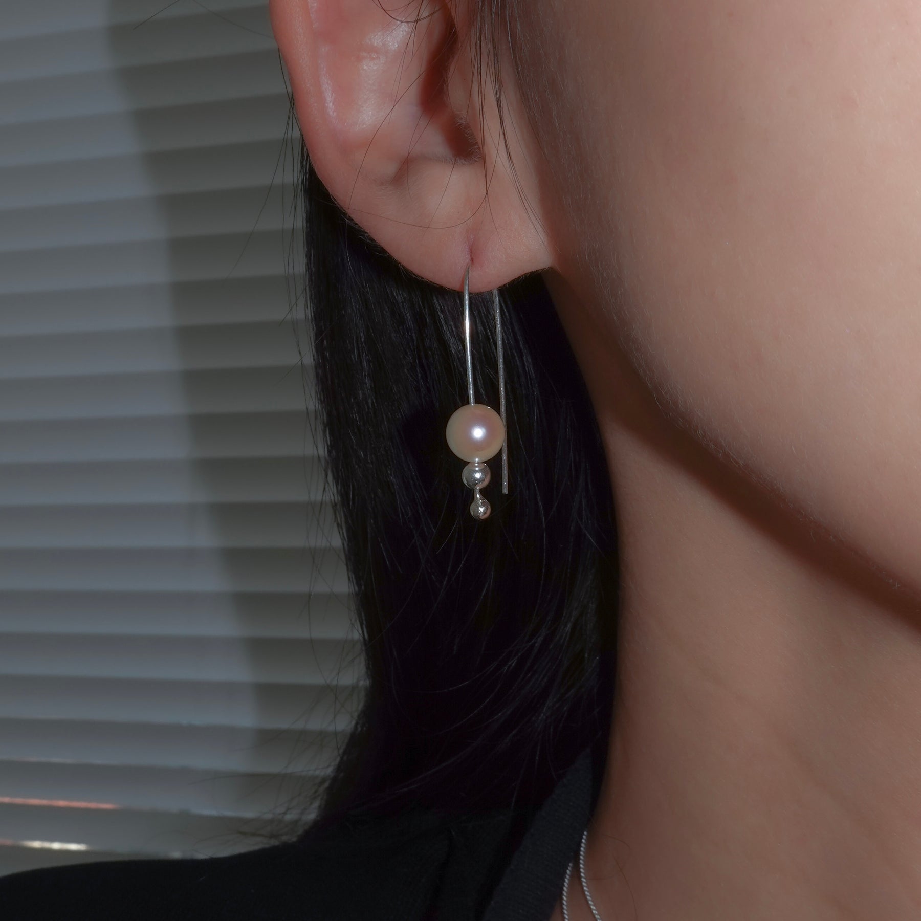約8mmの国産あこや真珠を贅沢に使用。キャッチが無くてもバランスよく耳に収まるようデザインされたピアス。シルバーの球とあこやの真珠の間にあるシルバーボールは可動し、好きな位置に固定できます。フォーマルシーンではシンメトリーに配置、カジュアルシーンではアシンメトリーに配置するなど、変化を楽しめるデザイン。