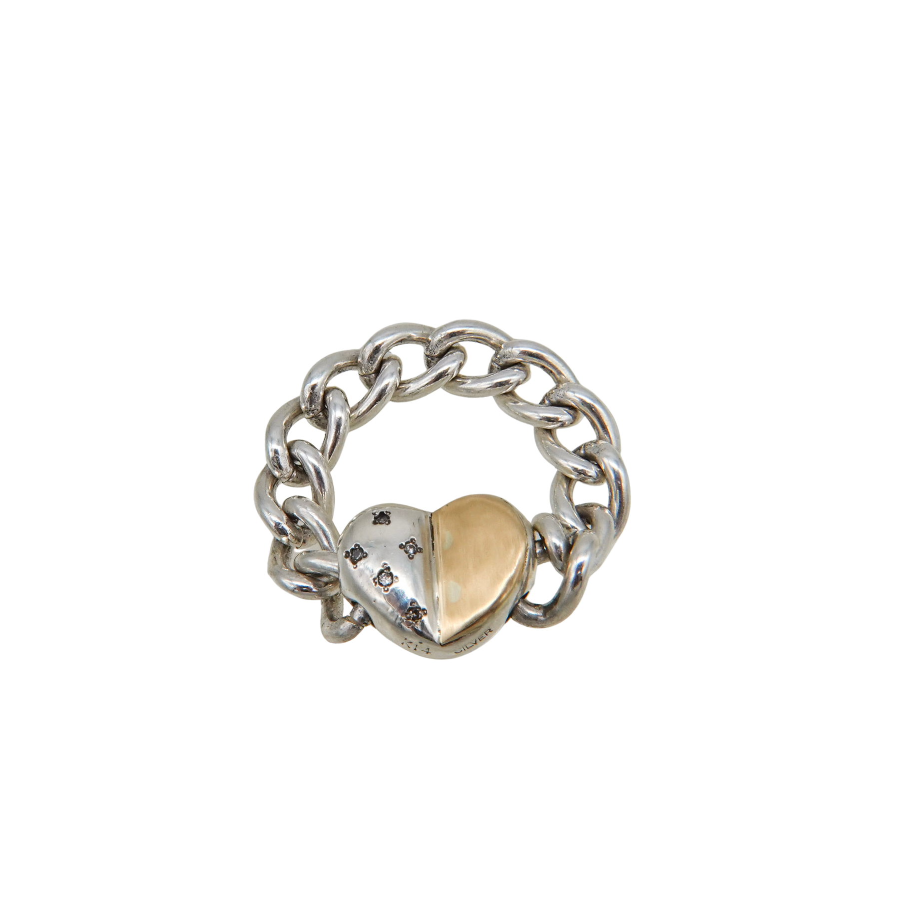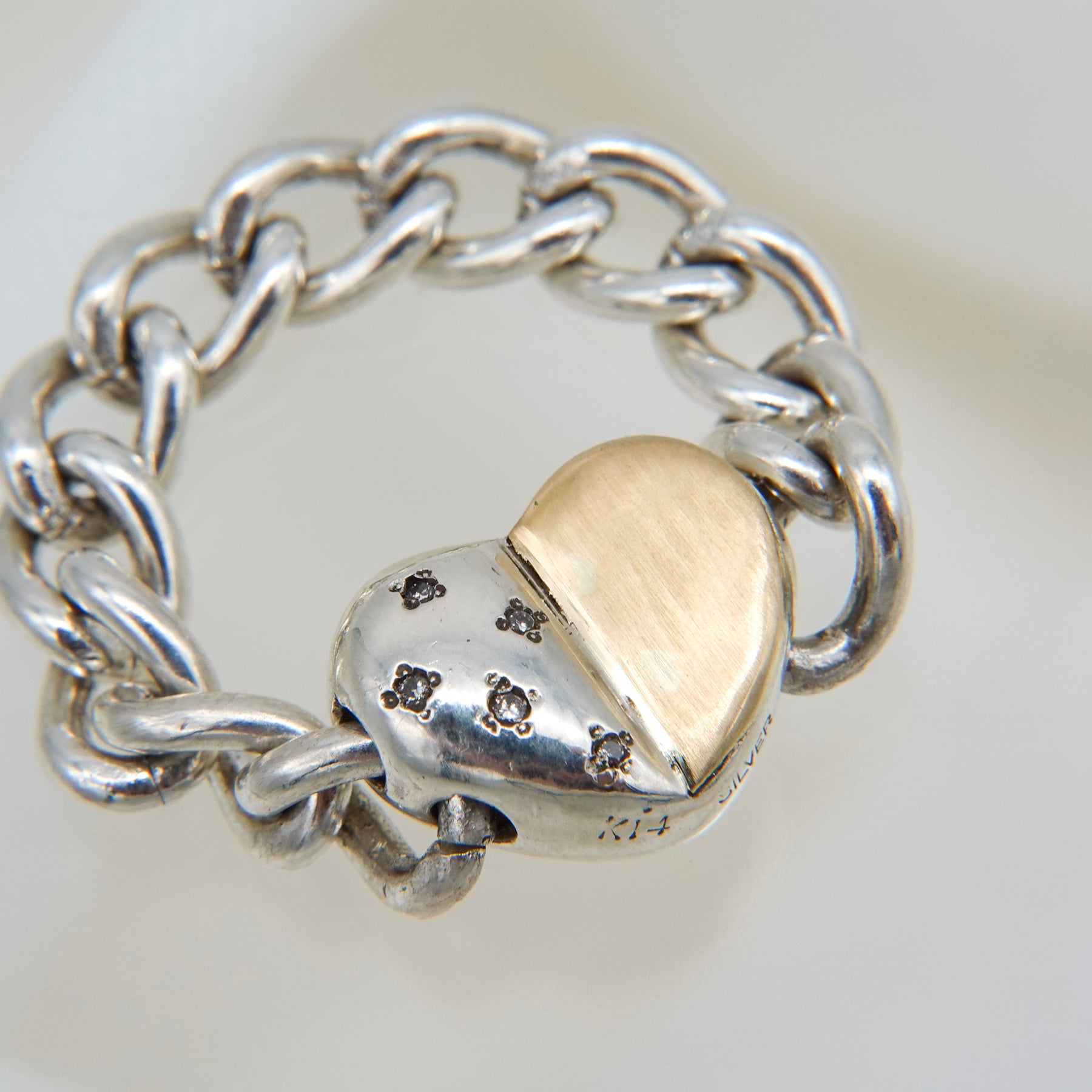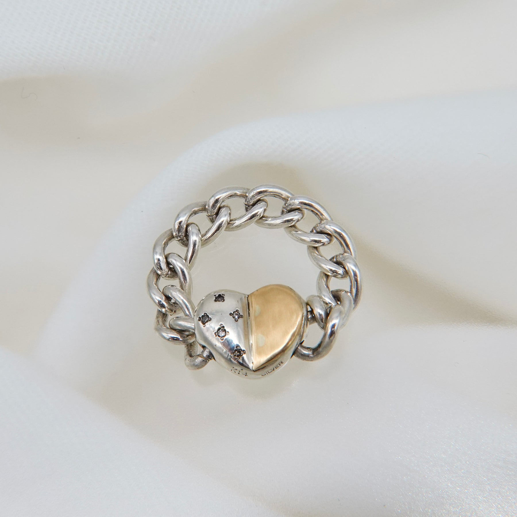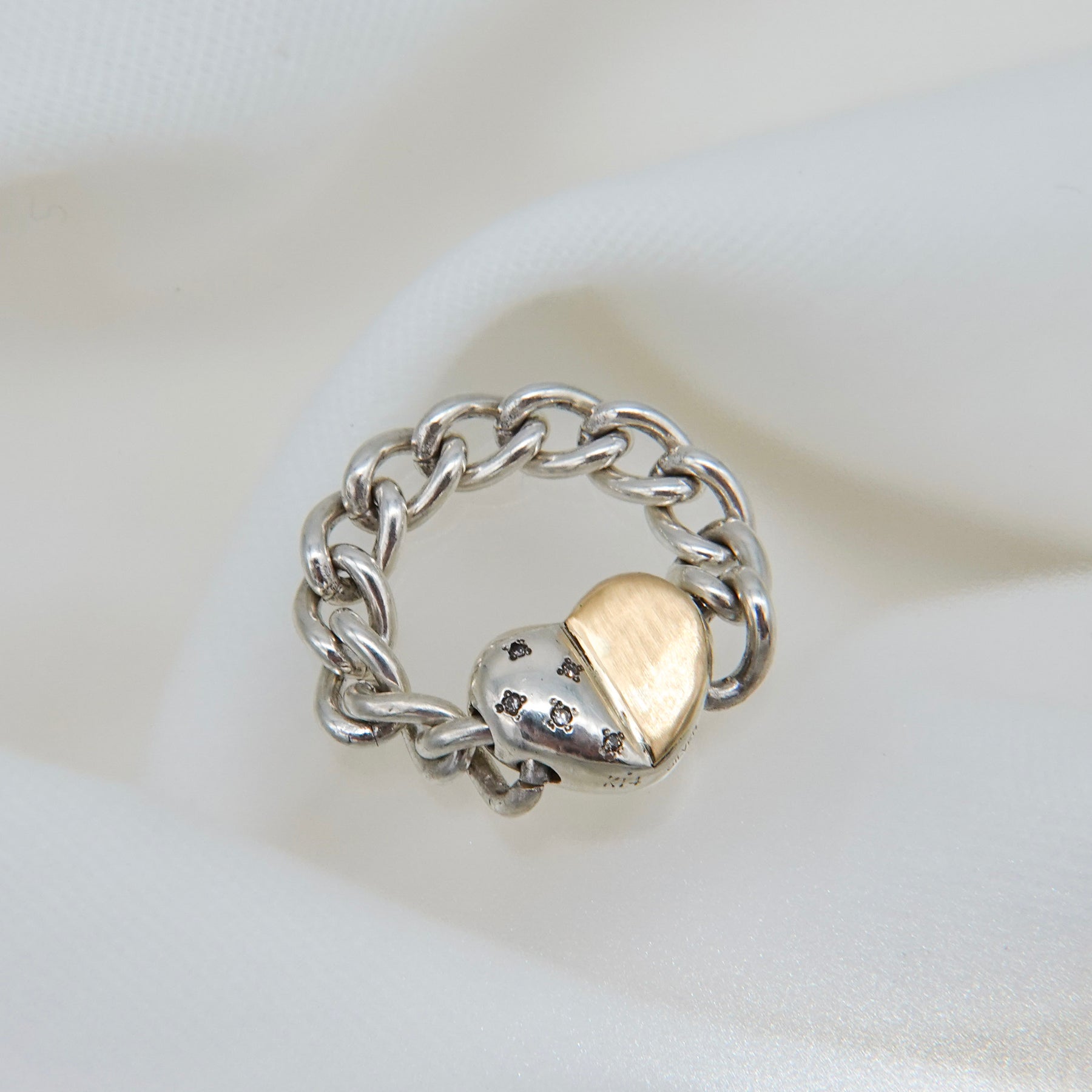 シルバーとゴールドを組み合わせたハートモチーフのチェーンリング。 ハートの片側にはダイヤモンドがあしらわれ、可憐なきらめきを添えられています。リバーシブル仕様のため、その日の気分に合わせて裏表を使い分けられる、遊び心のあるデザインです。
