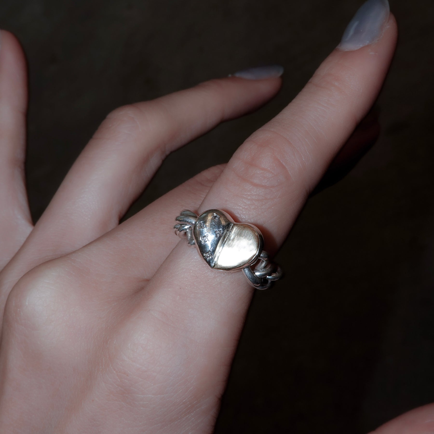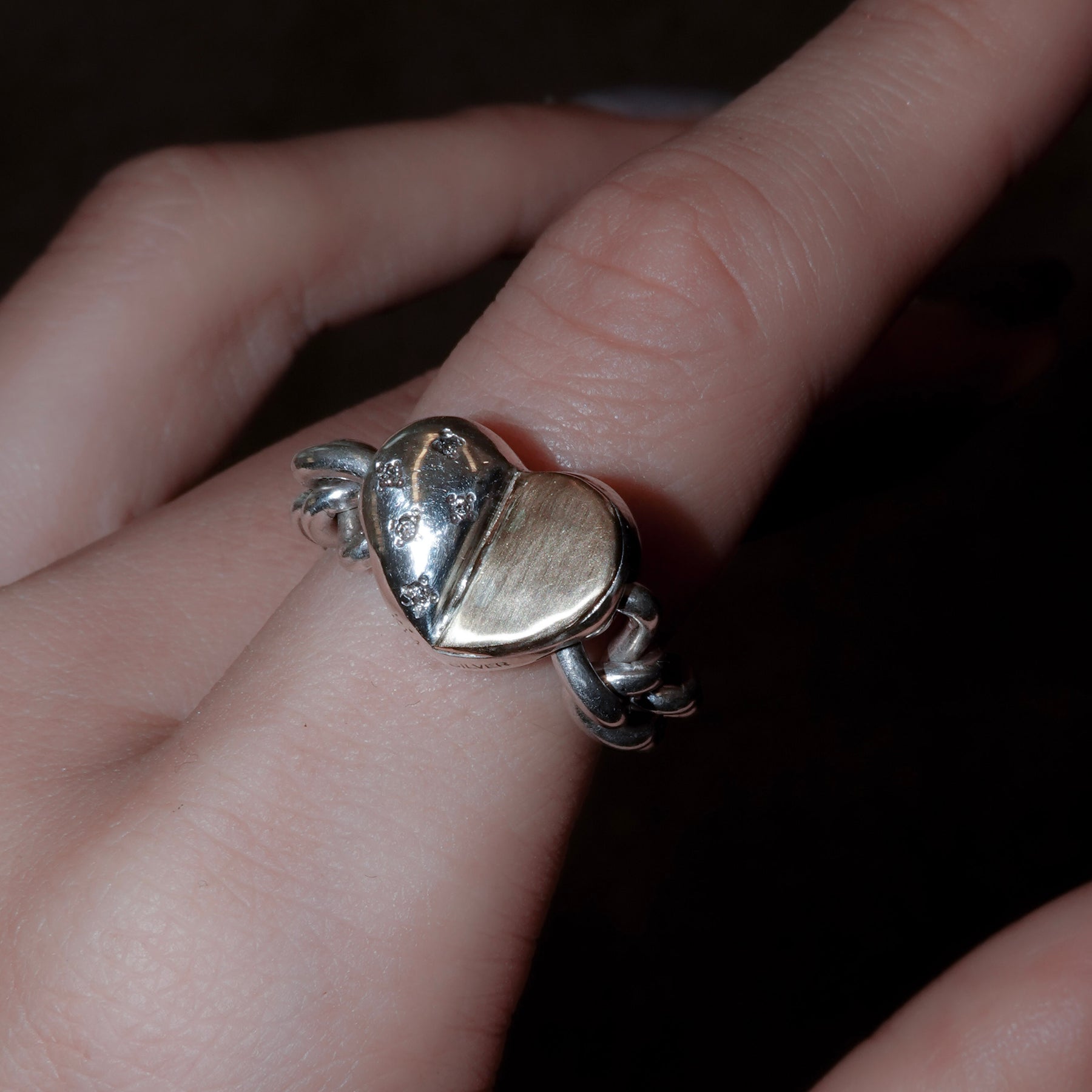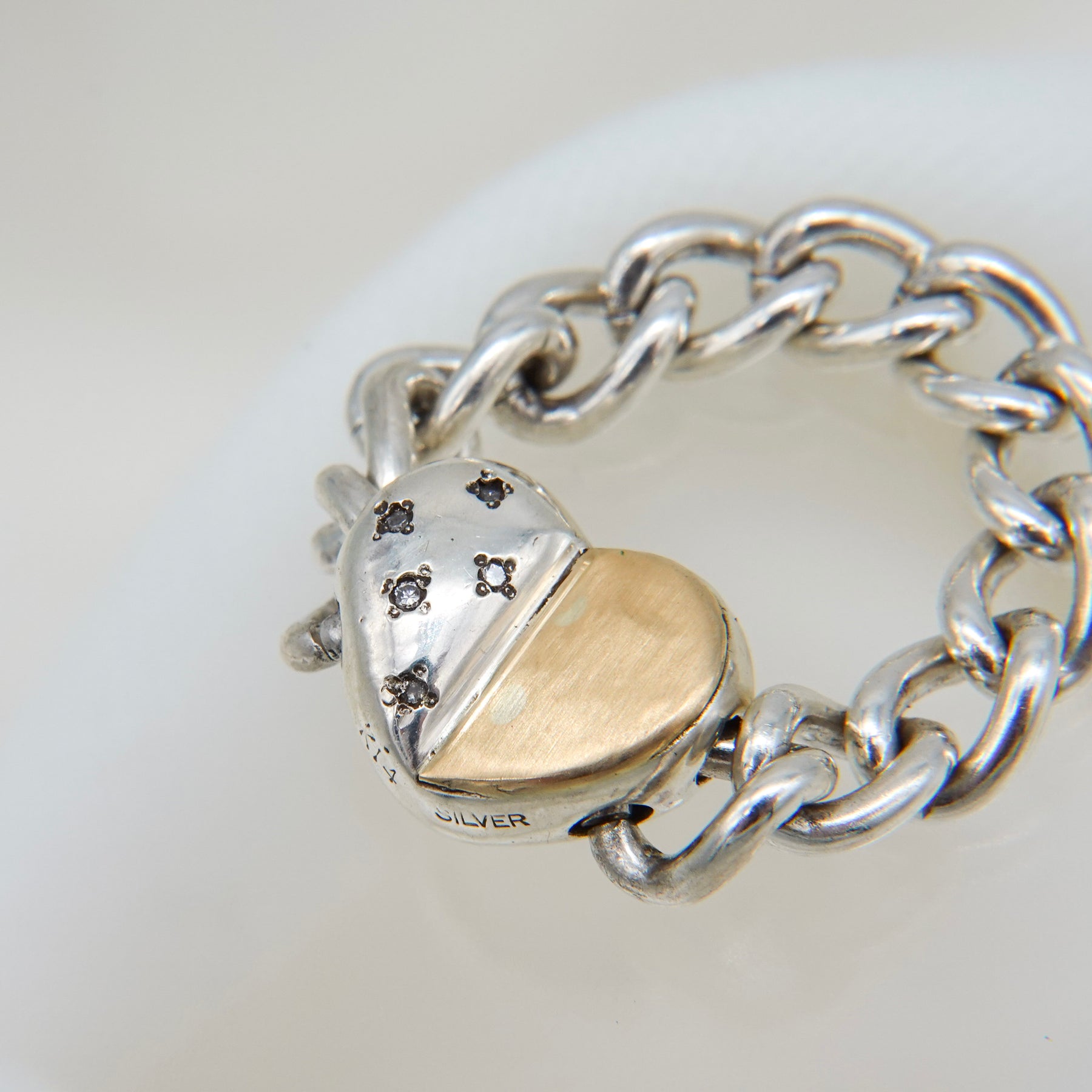 シルバーとゴールドを組み合わせたハートモチーフのチェーンリング。 ハートの片側にはダイヤモンドがあしらわれ、可憐なきらめきを添えられています。リバーシブル仕様のため、その日の気分に合わせて裏表を使い分けられる、遊び心のあるデザインです。