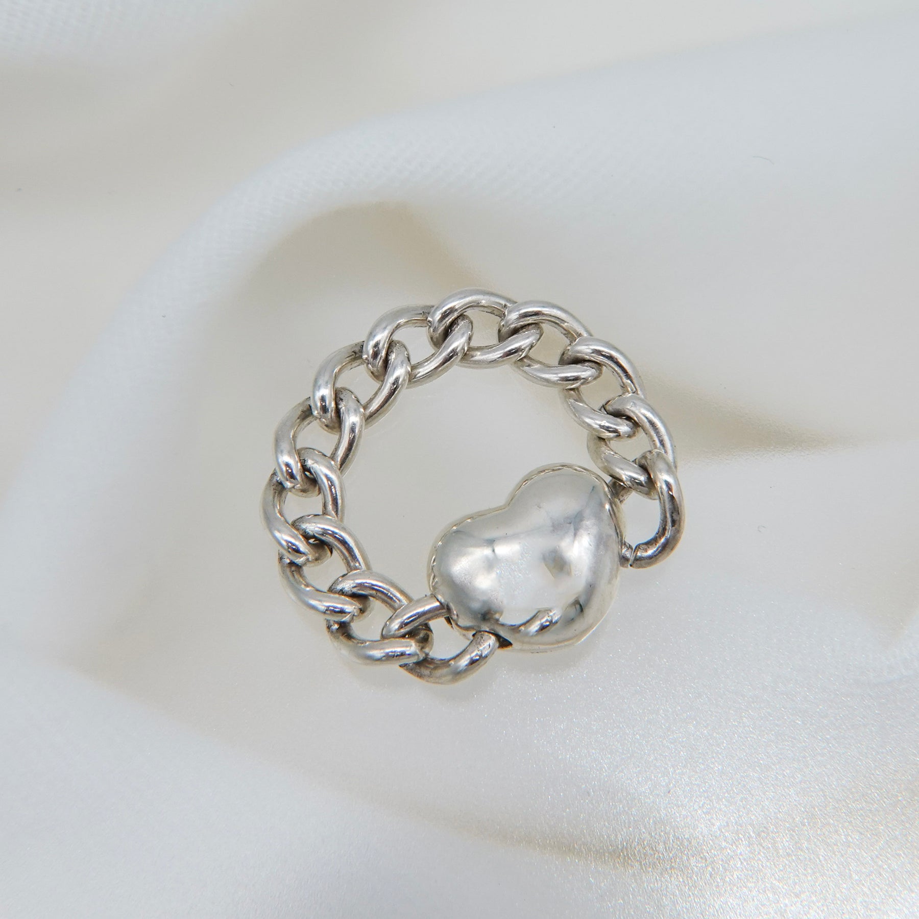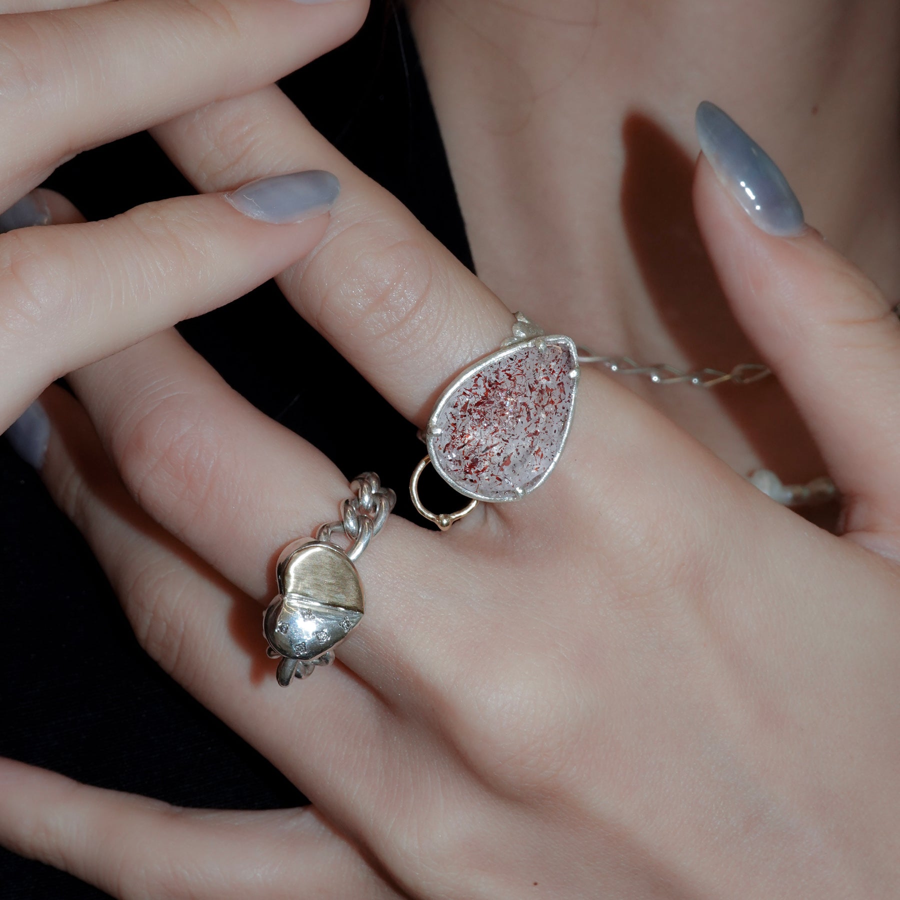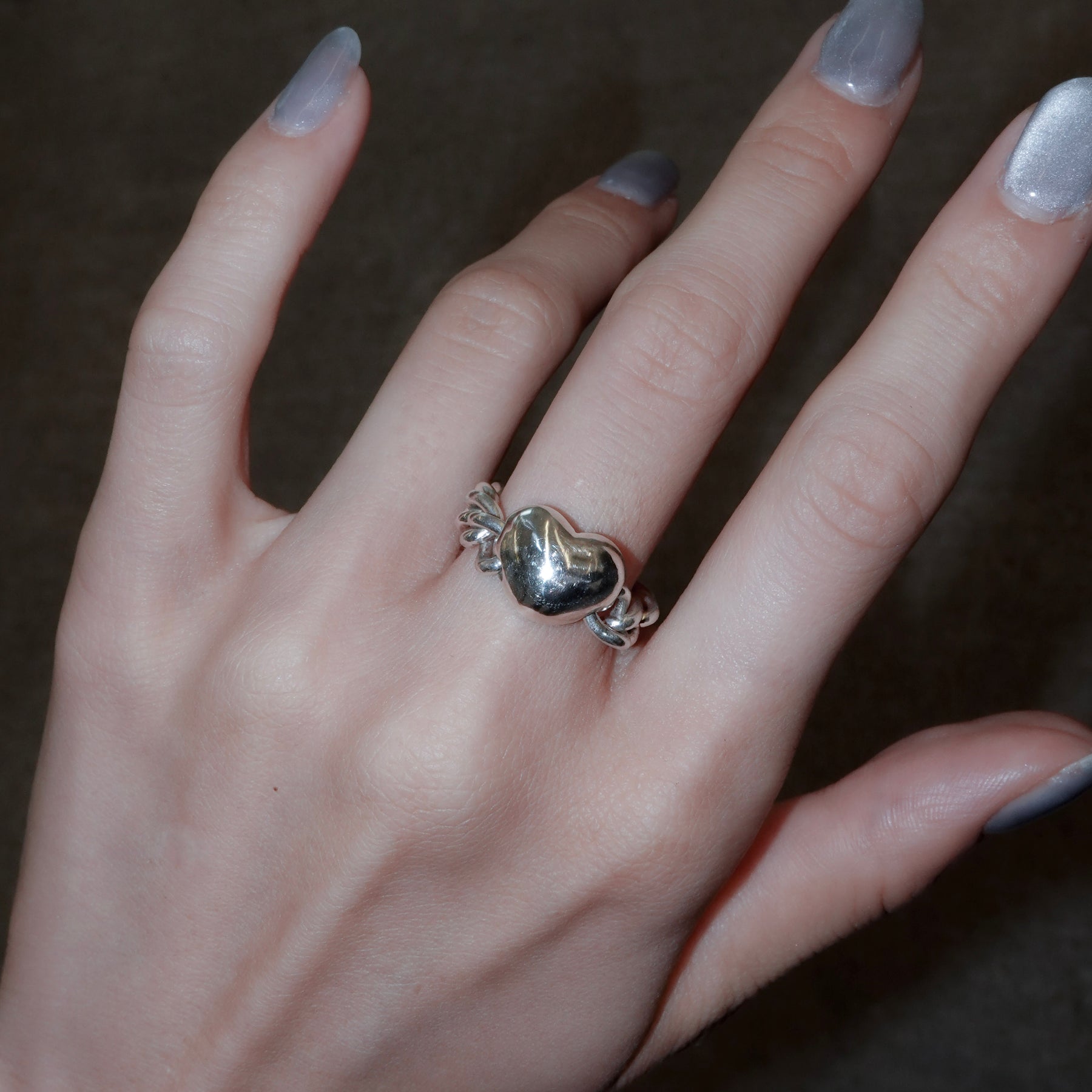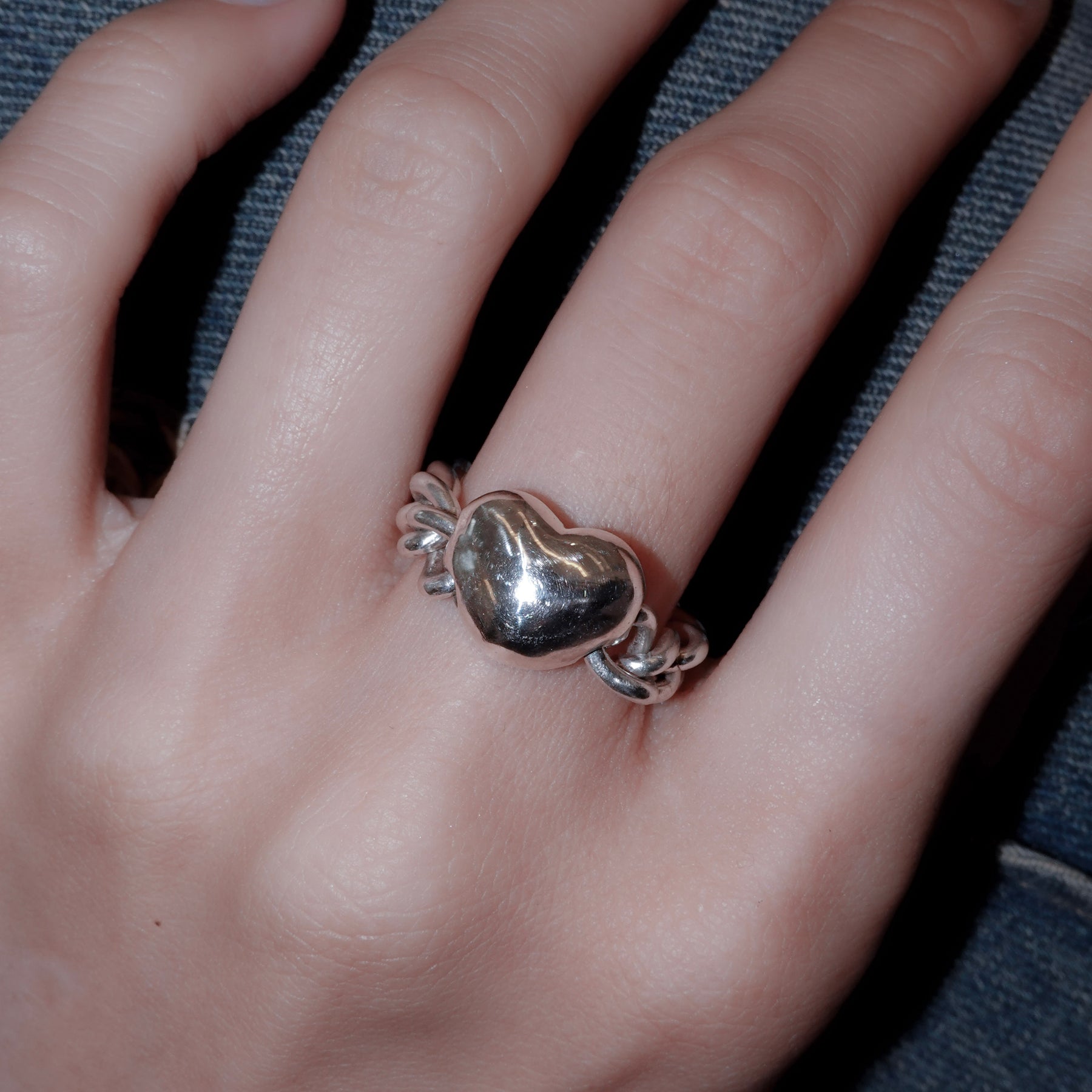 シルバーとゴールドを組み合わせたハートモチーフのチェーンリング。 ハートの片側にはダイヤモンドがあしらわれ、可憐なきらめきを添えられています。リバーシブル仕様のため、その日の気分に合わせて裏表を使い分けられる、遊び心のあるデザインです。