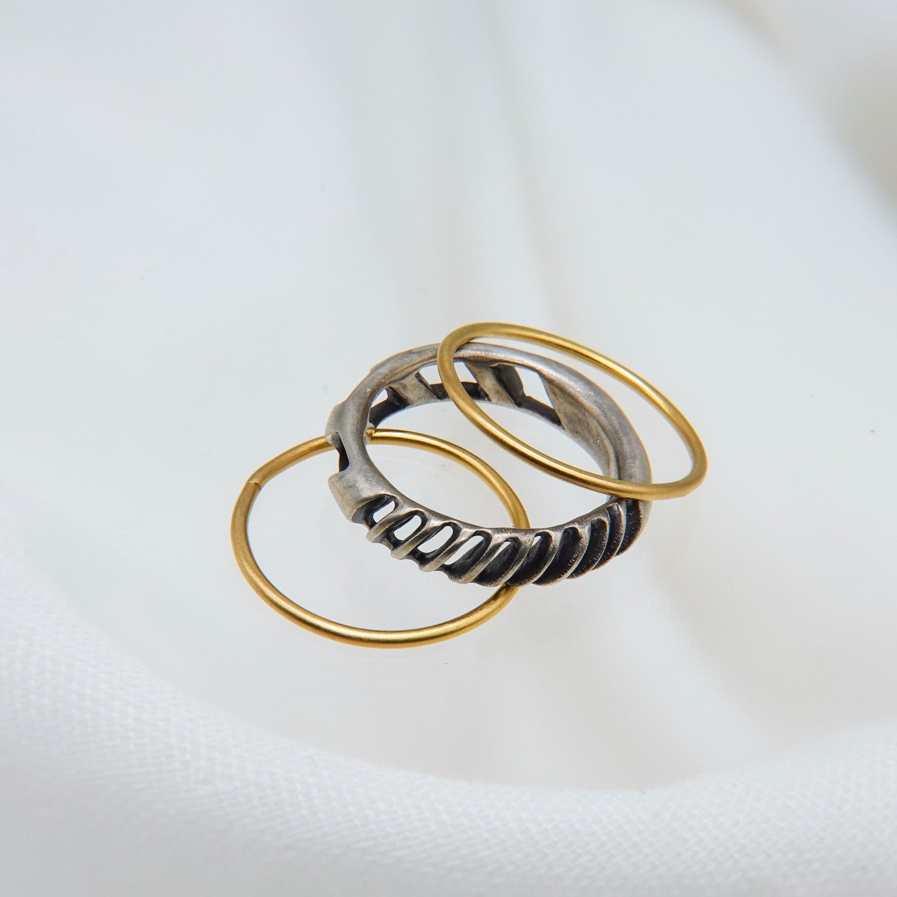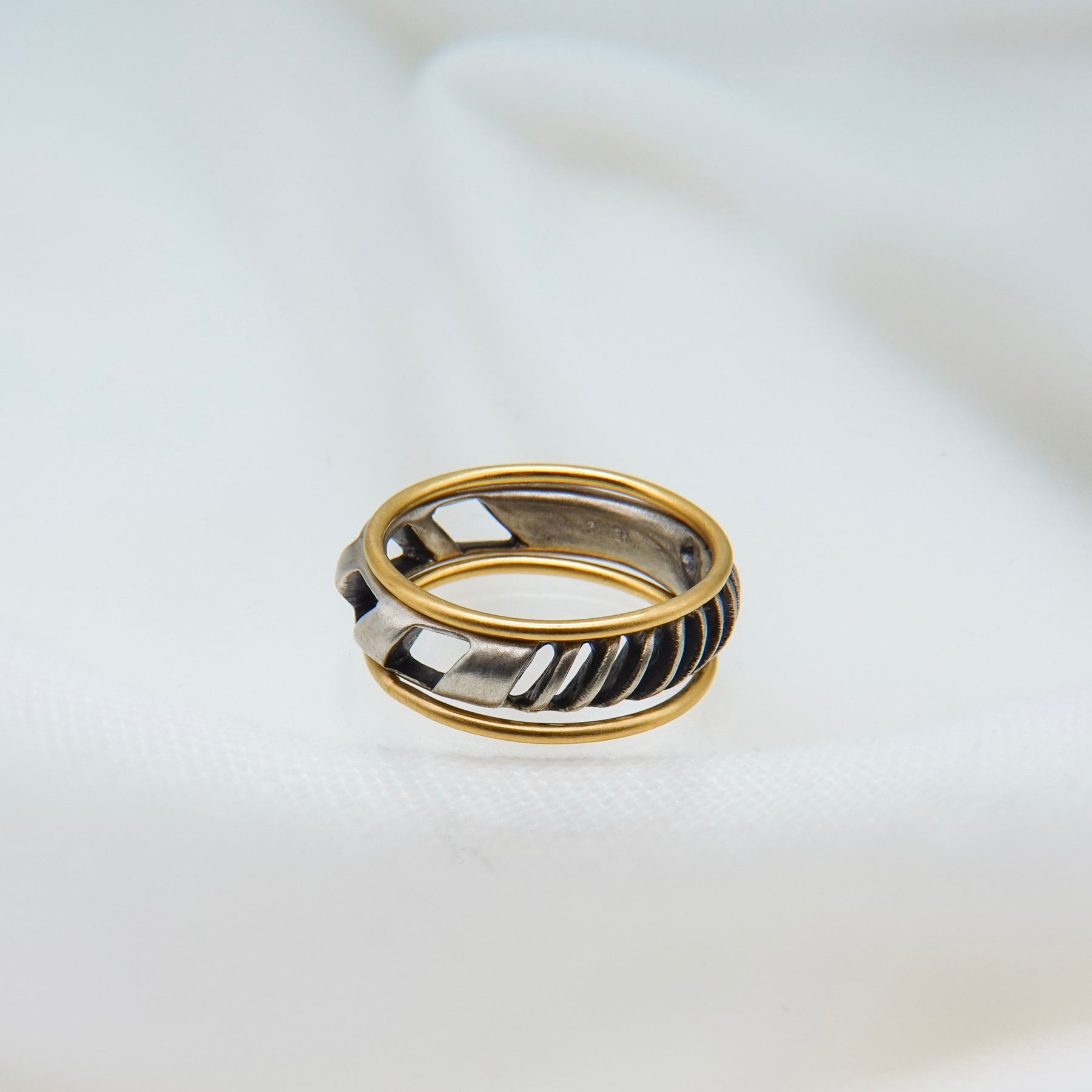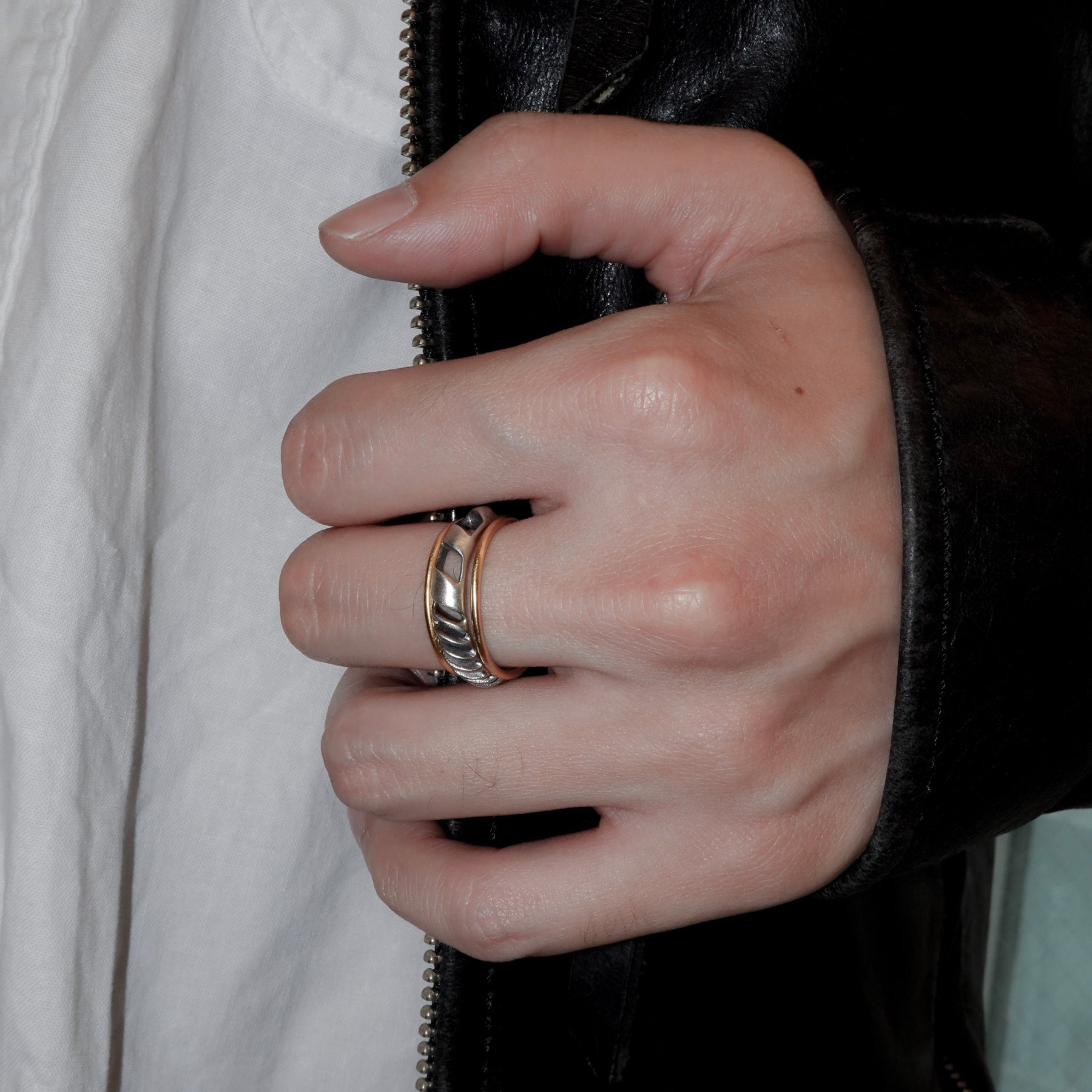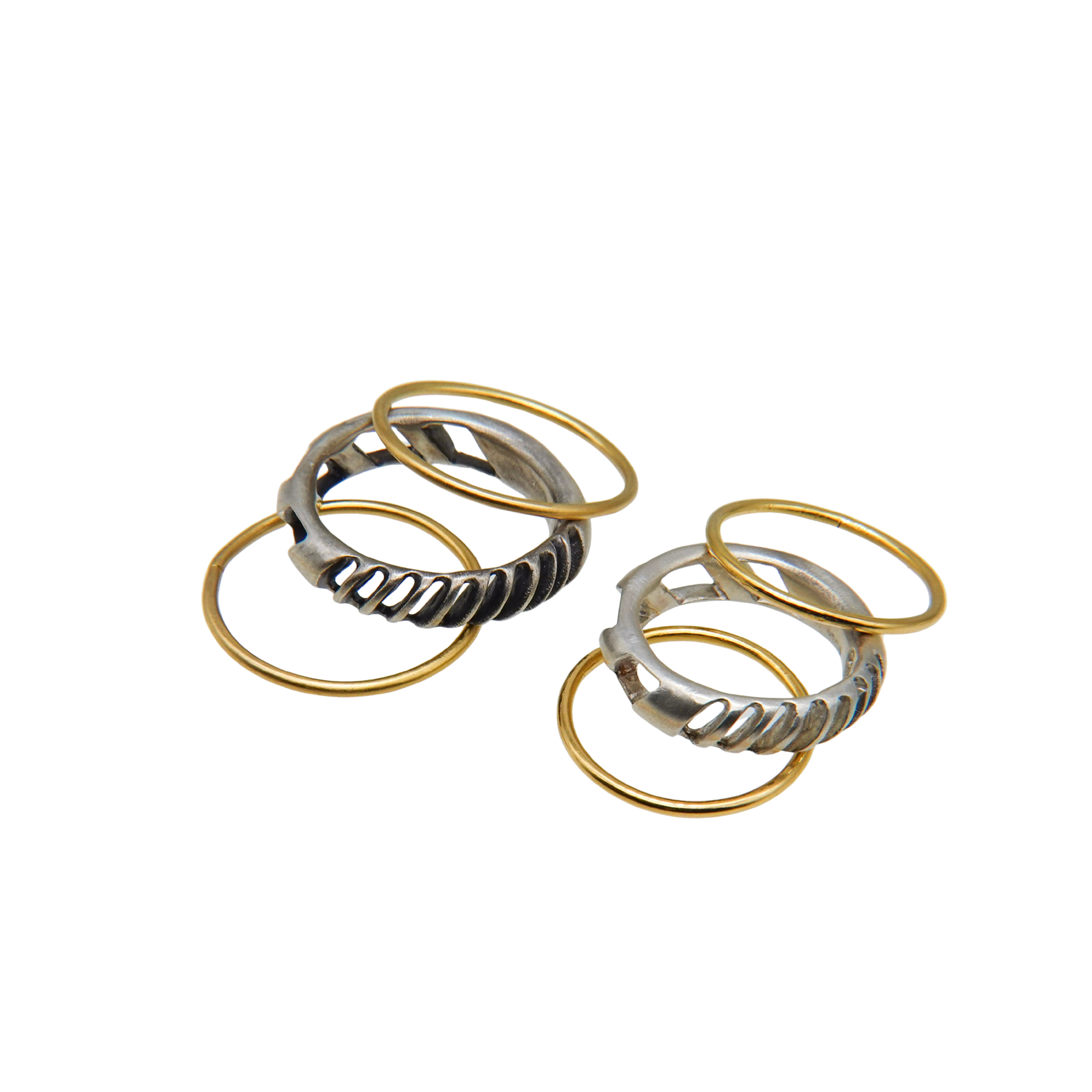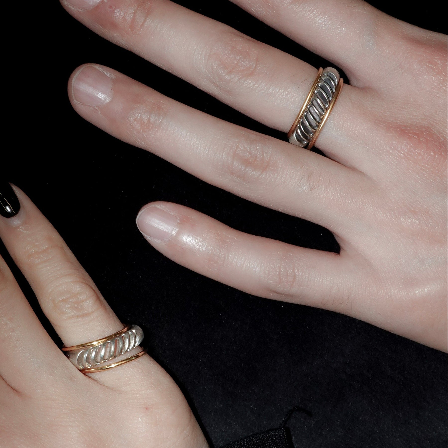4mm幅の程よいボリュームのシルバーリングに1mmの華奢なゴールドリングが2本セットになったアイテム。4mm幅のリングはざっくりと大きめの穴と細かめの小さな穴が抜け感を生むデザイン。ゴールドのリングとセットでつけても別々につけても楽しめます。
