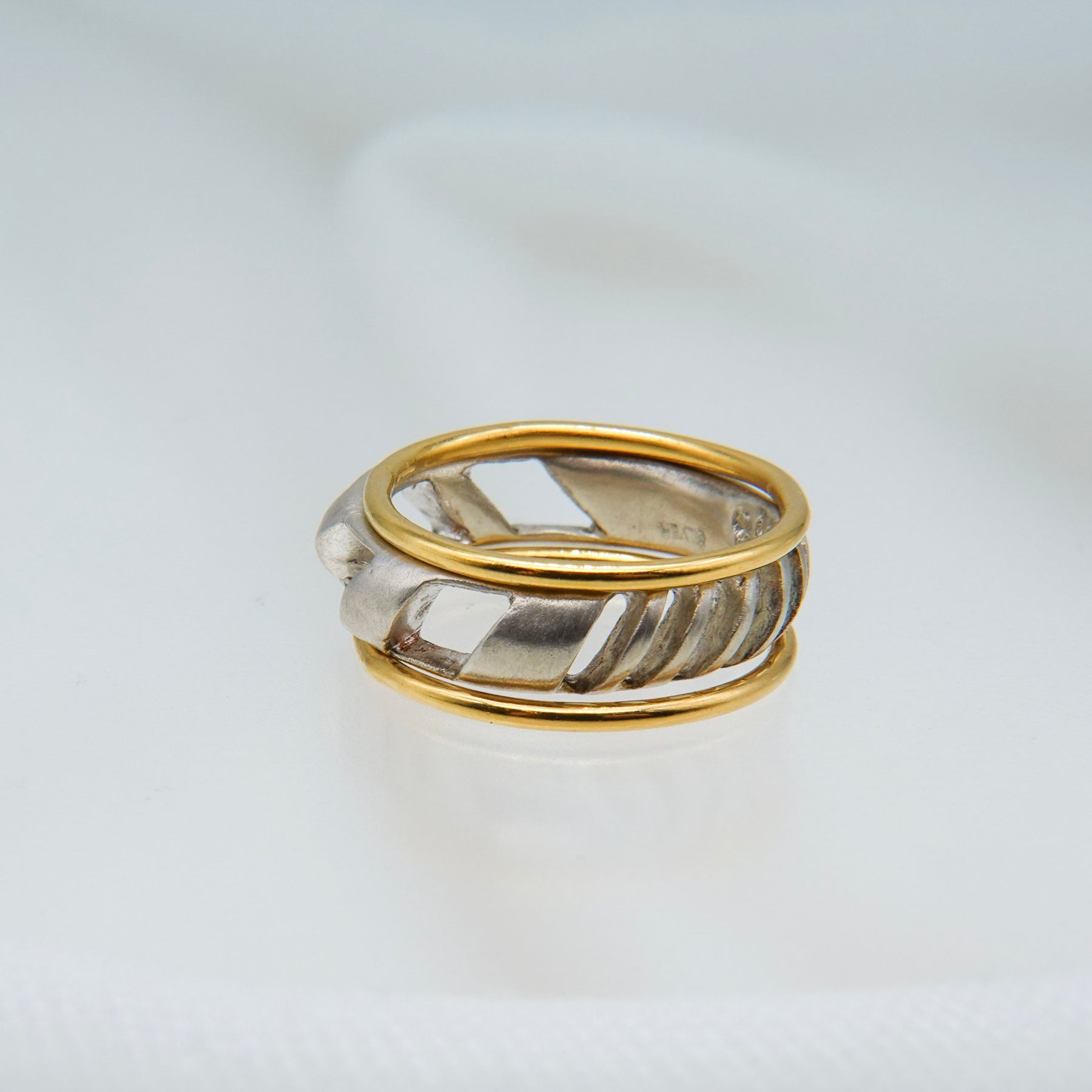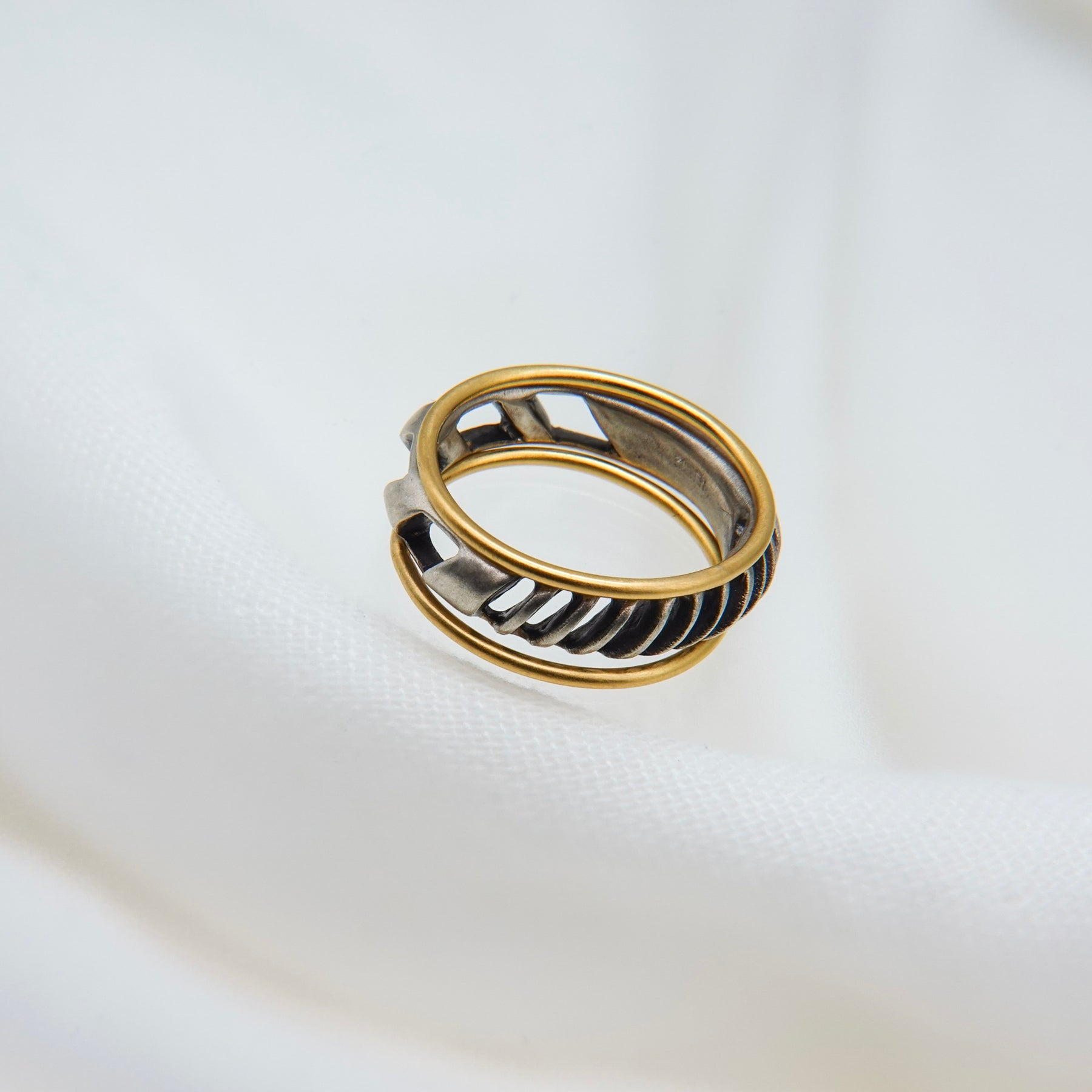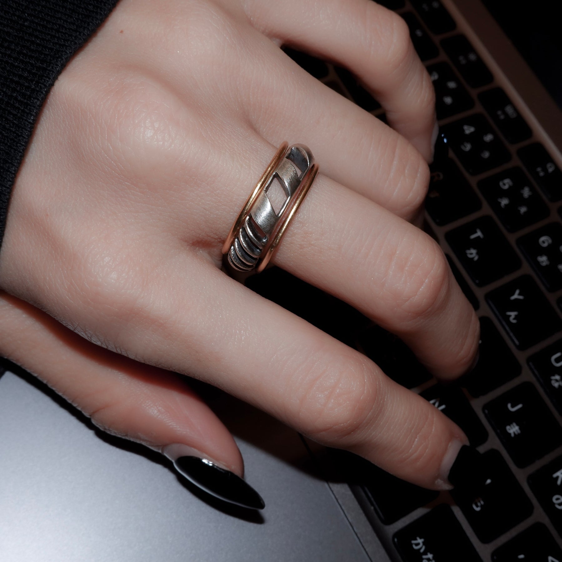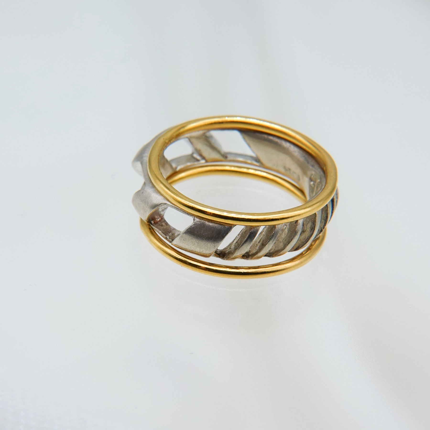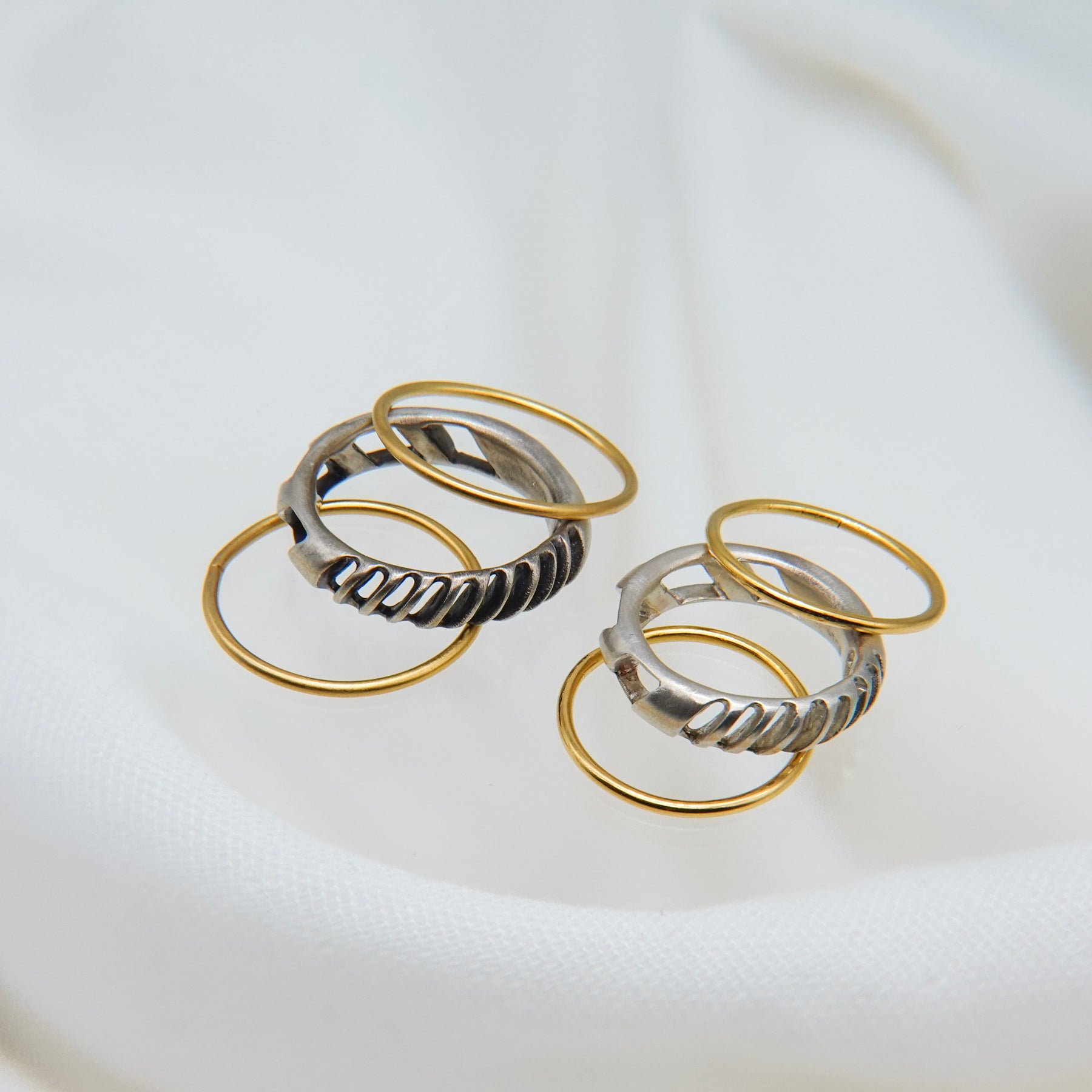 4mm幅の程よいボリュームのシルバーリングに1mmの華奢なゴールドリングが2本セットになったアイテム。4mm幅のリングはざっくりと大きめの穴と細かめの小さな穴が抜け感を生むデザイン。ゴールドのリングとセットでつけても別々につけても楽しめます。