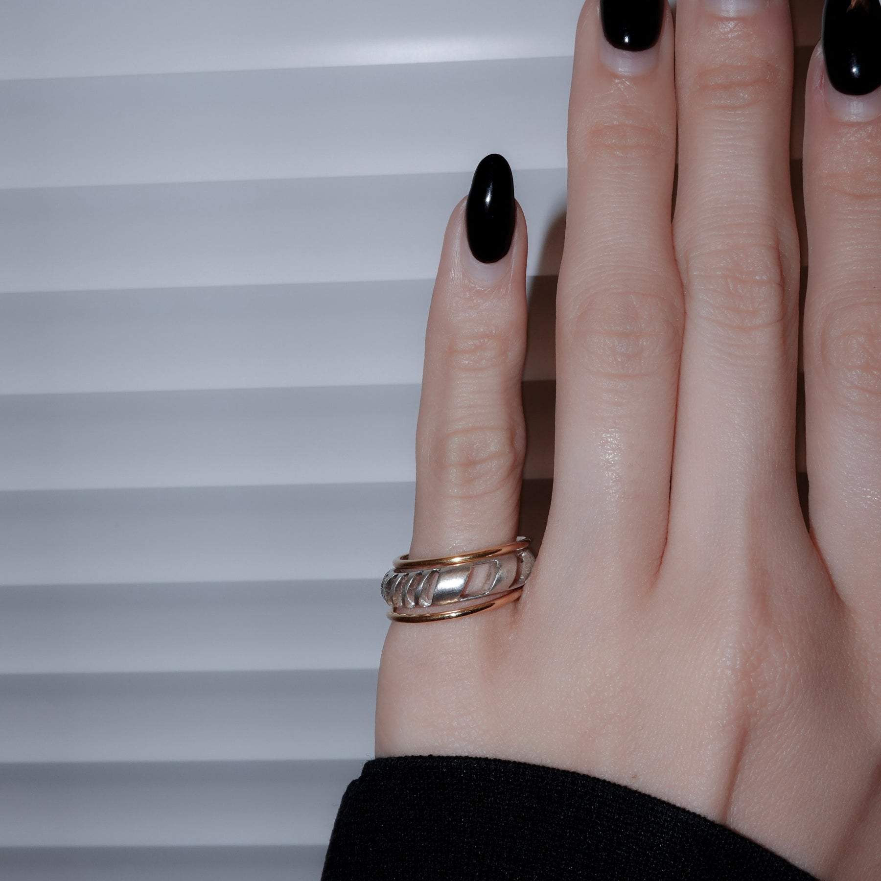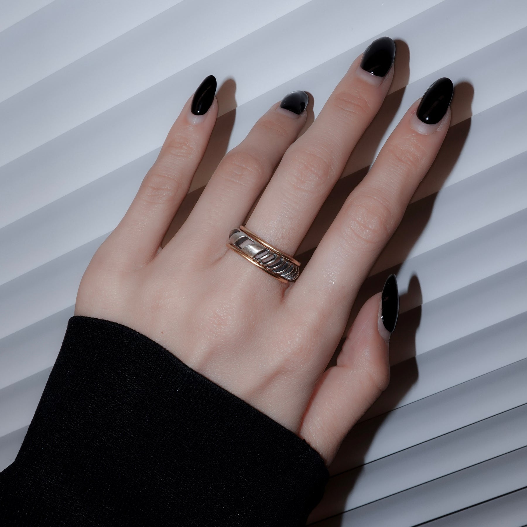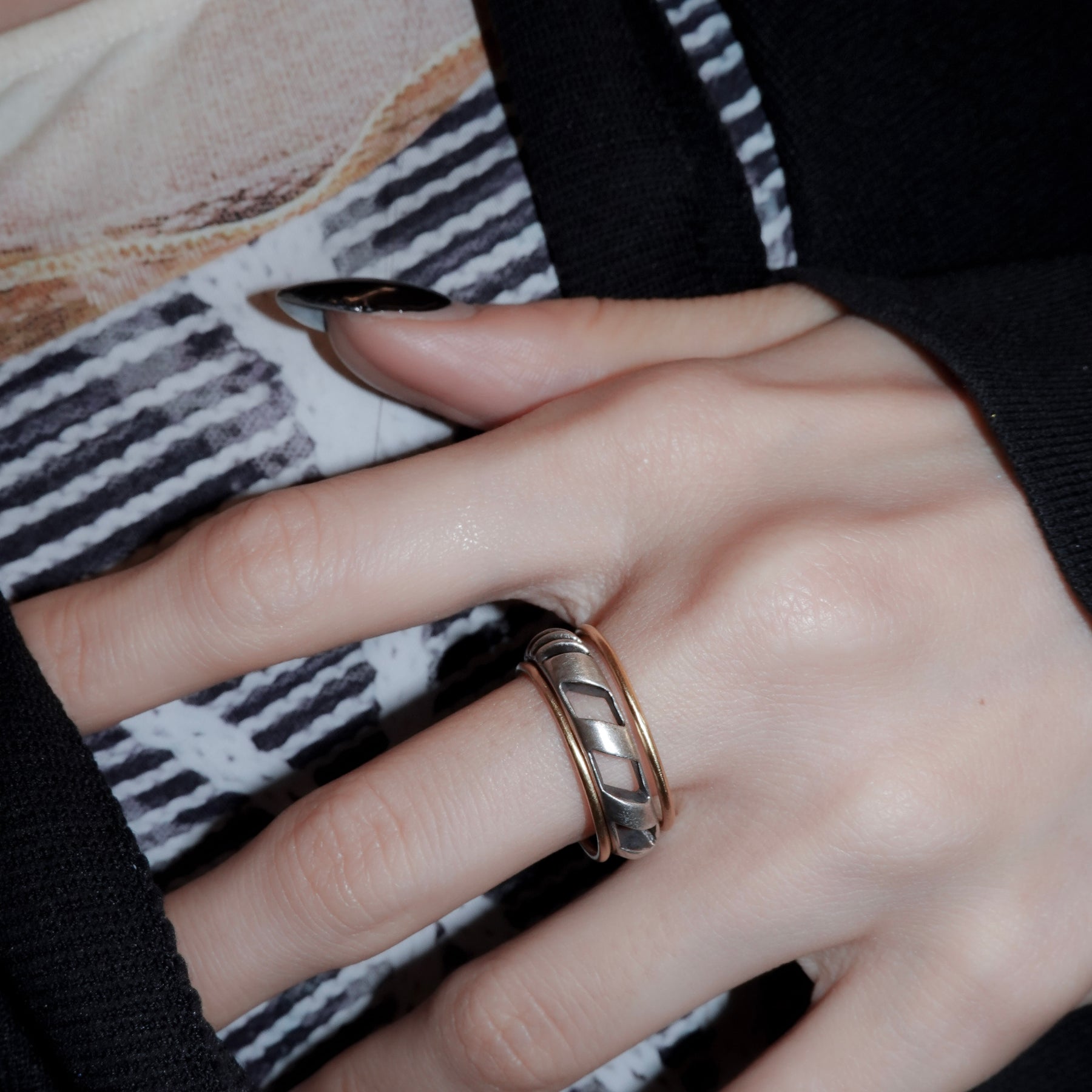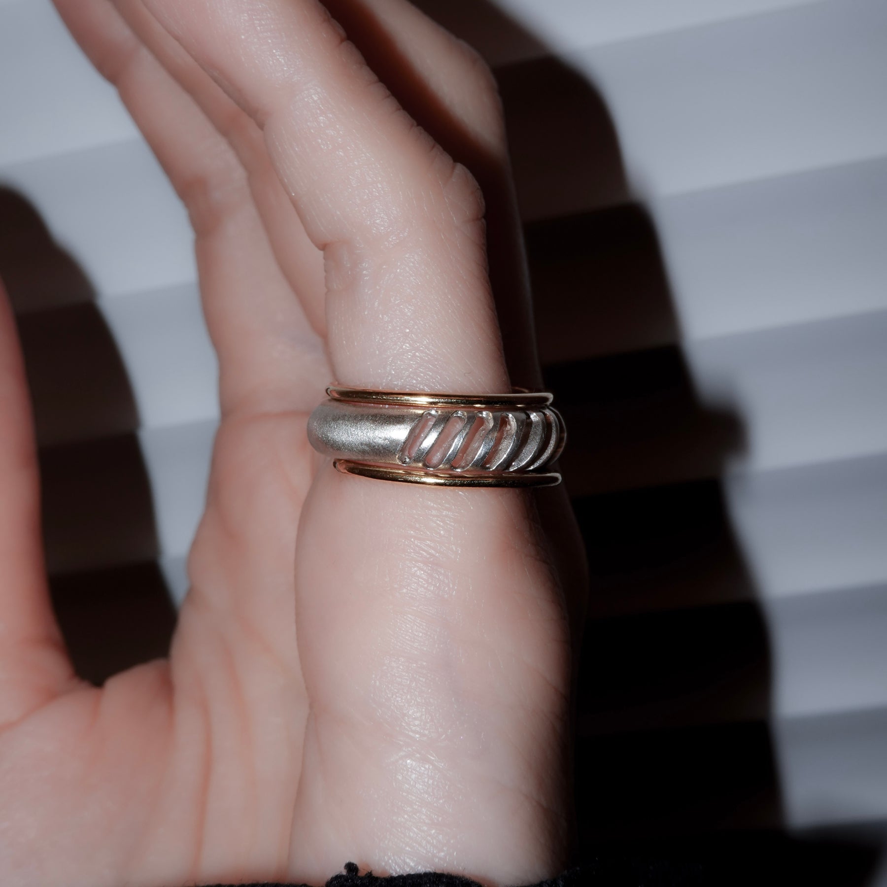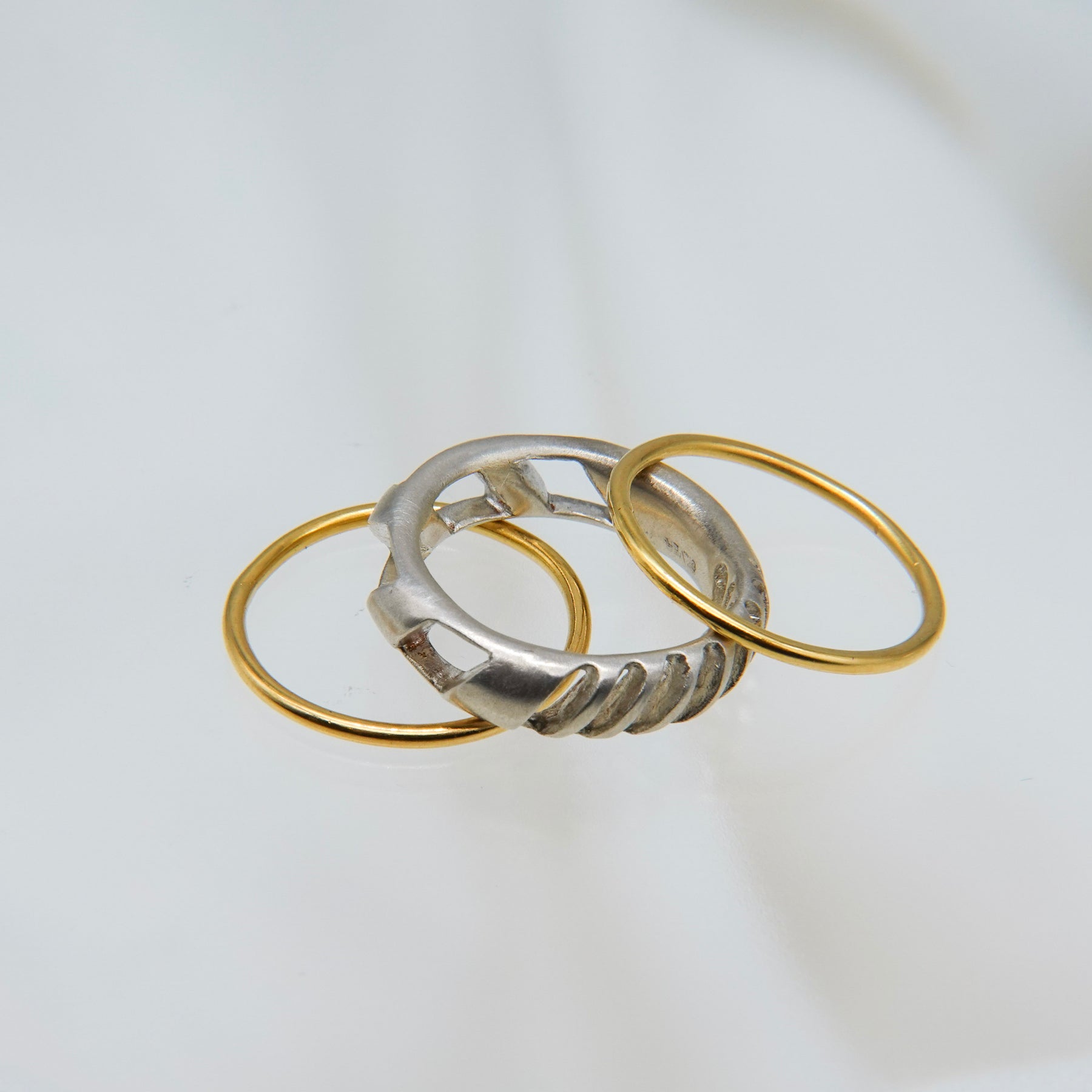 4mm幅の程よいボリュームのシルバーリングに1mmの華奢なゴールドリングが2本セットになったアイテム。4mm幅のリングはざっくりと大きめの穴と細かめの小さな穴が抜け感を生むデザイン。ゴールドのリングとセットでつけても別々につけても楽しめます。