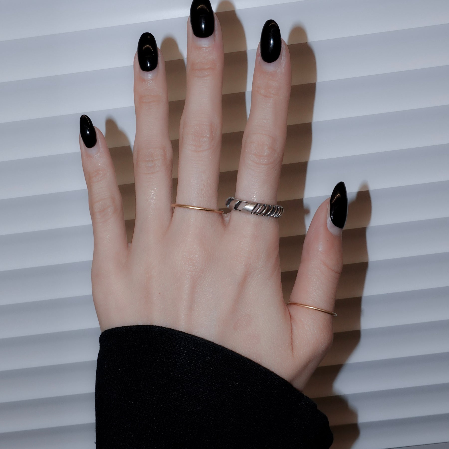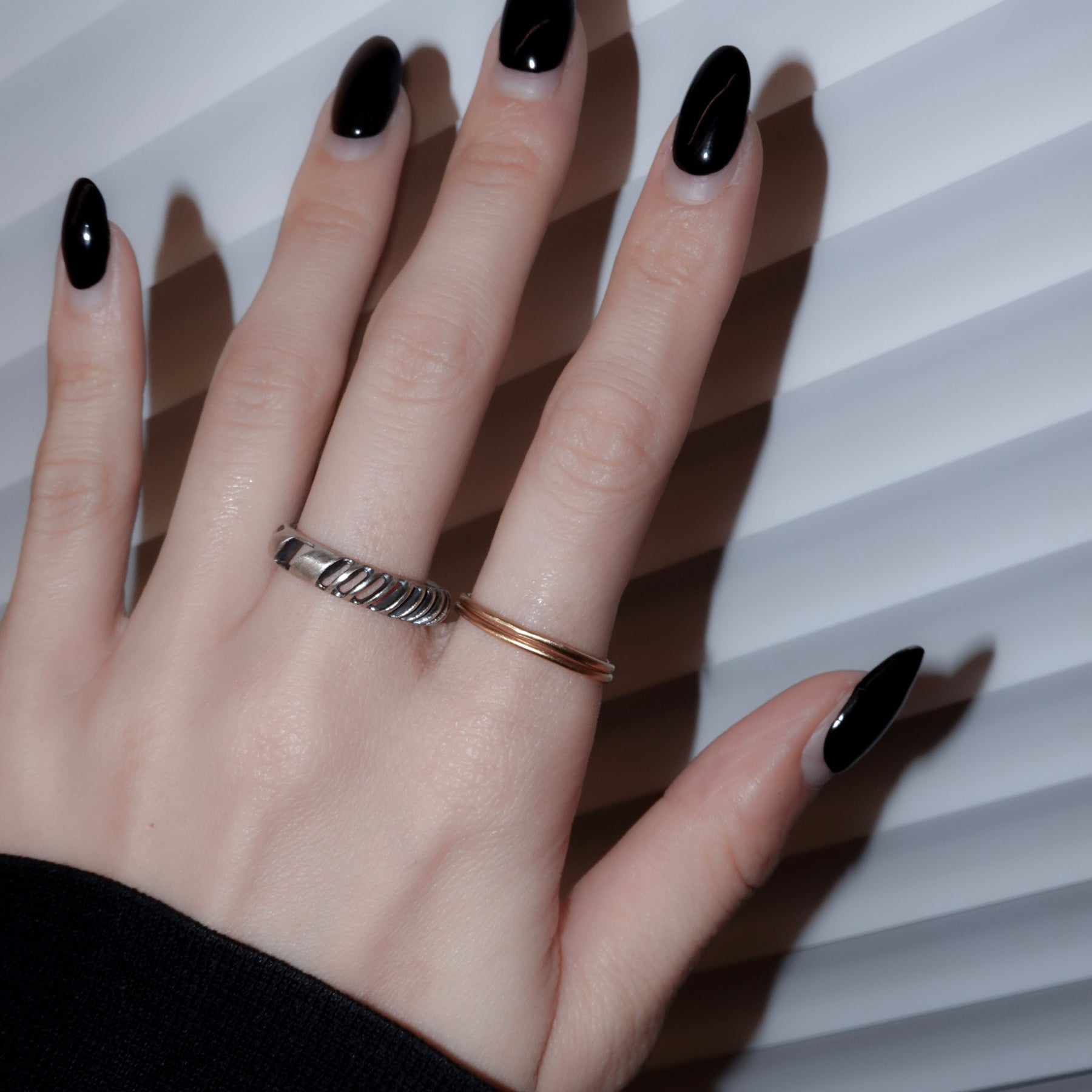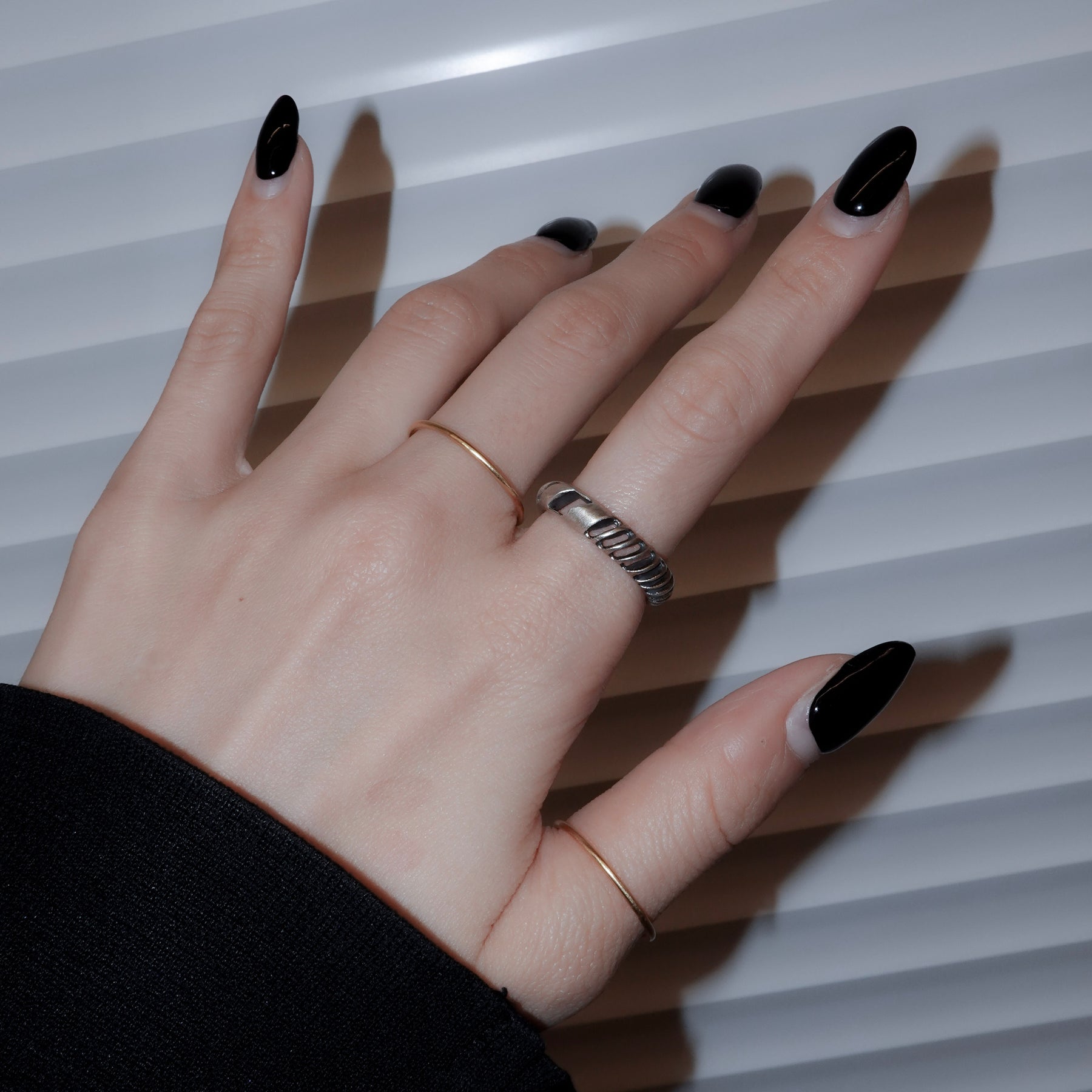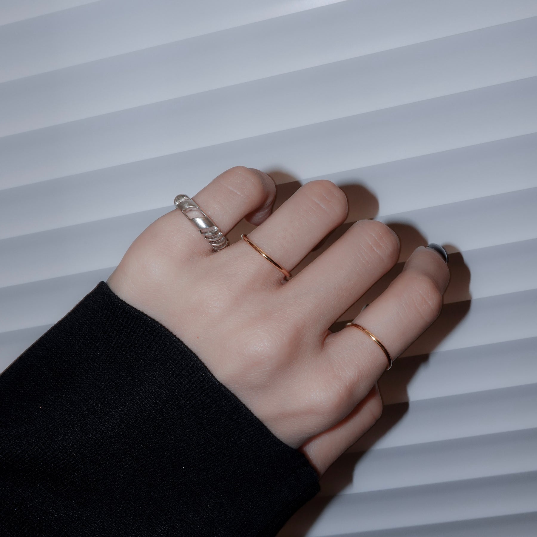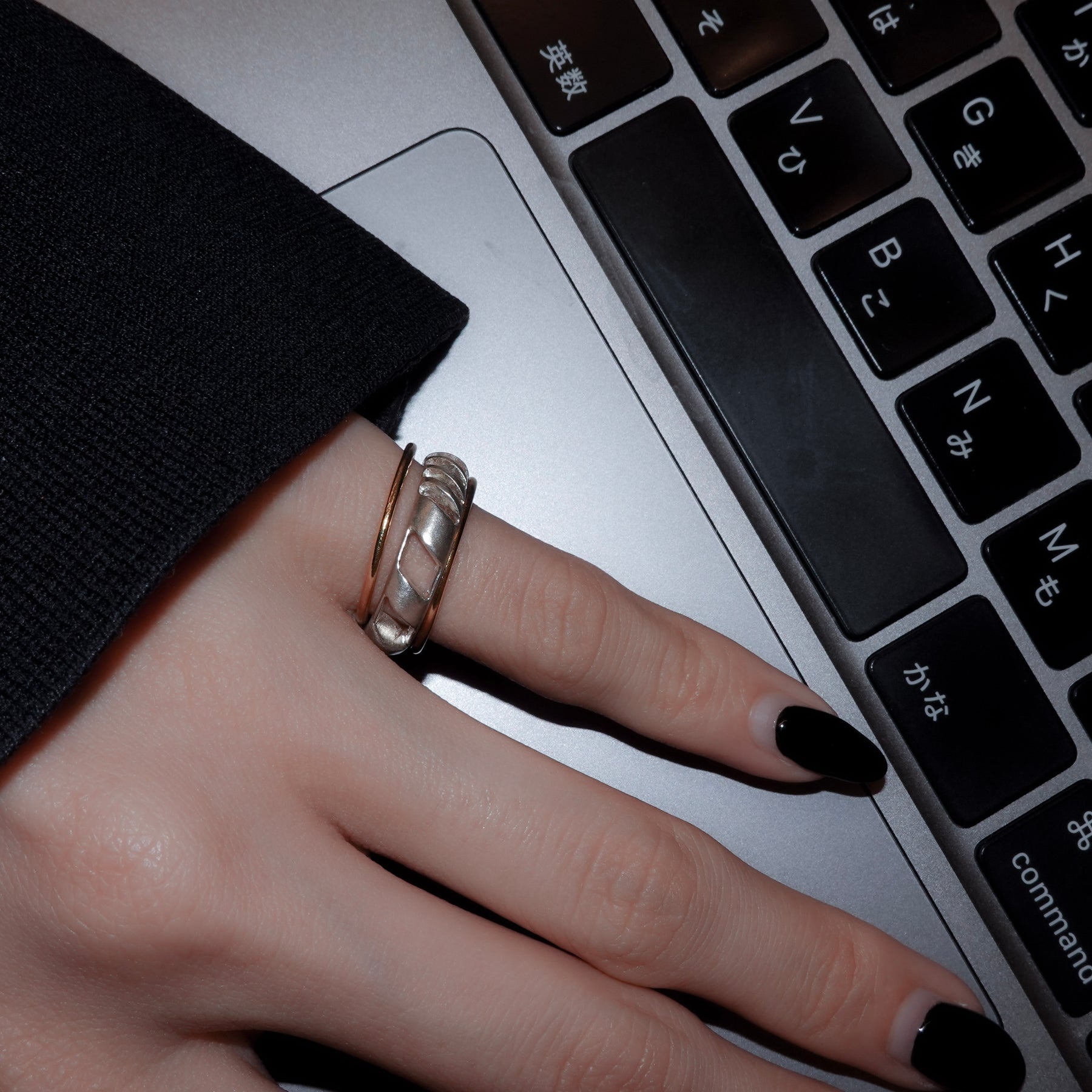 4mm幅の程よいボリュームのシルバーリングに1mmの華奢なゴールドリングが2本セットになったアイテム。4mm幅のリングはざっくりと大きめの穴と細かめの小さな穴が抜け感を生むデザイン。ゴールドのリングとセットでつけても別々につけても楽しめます。