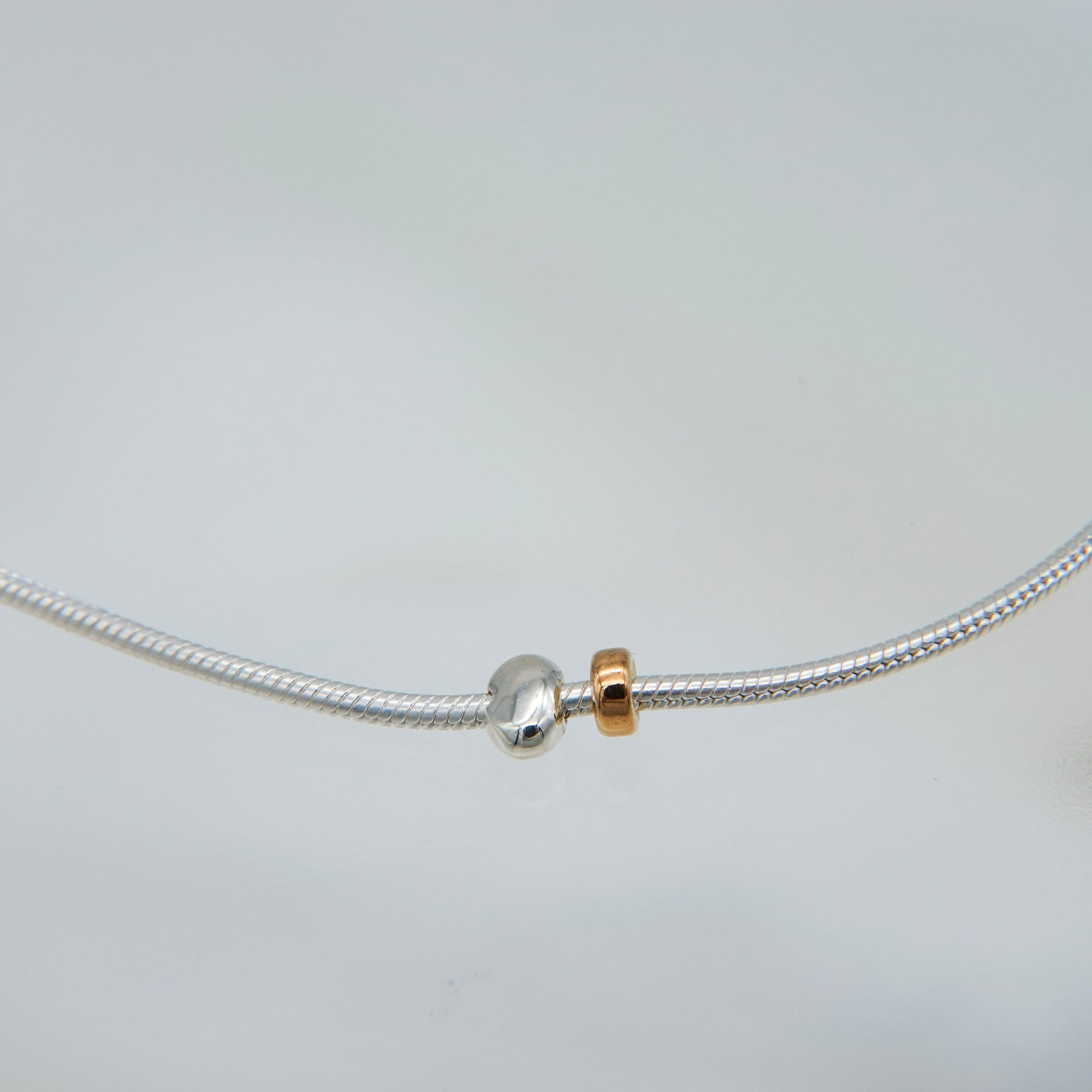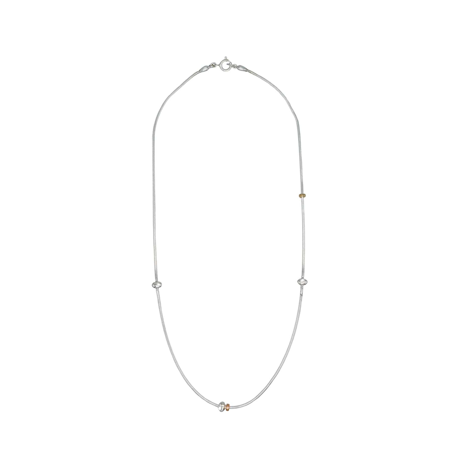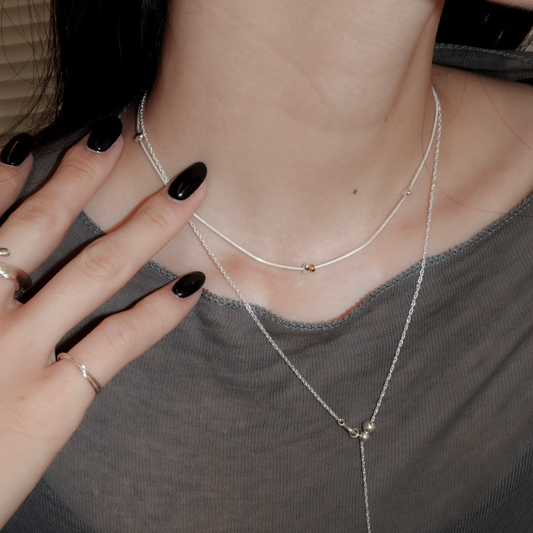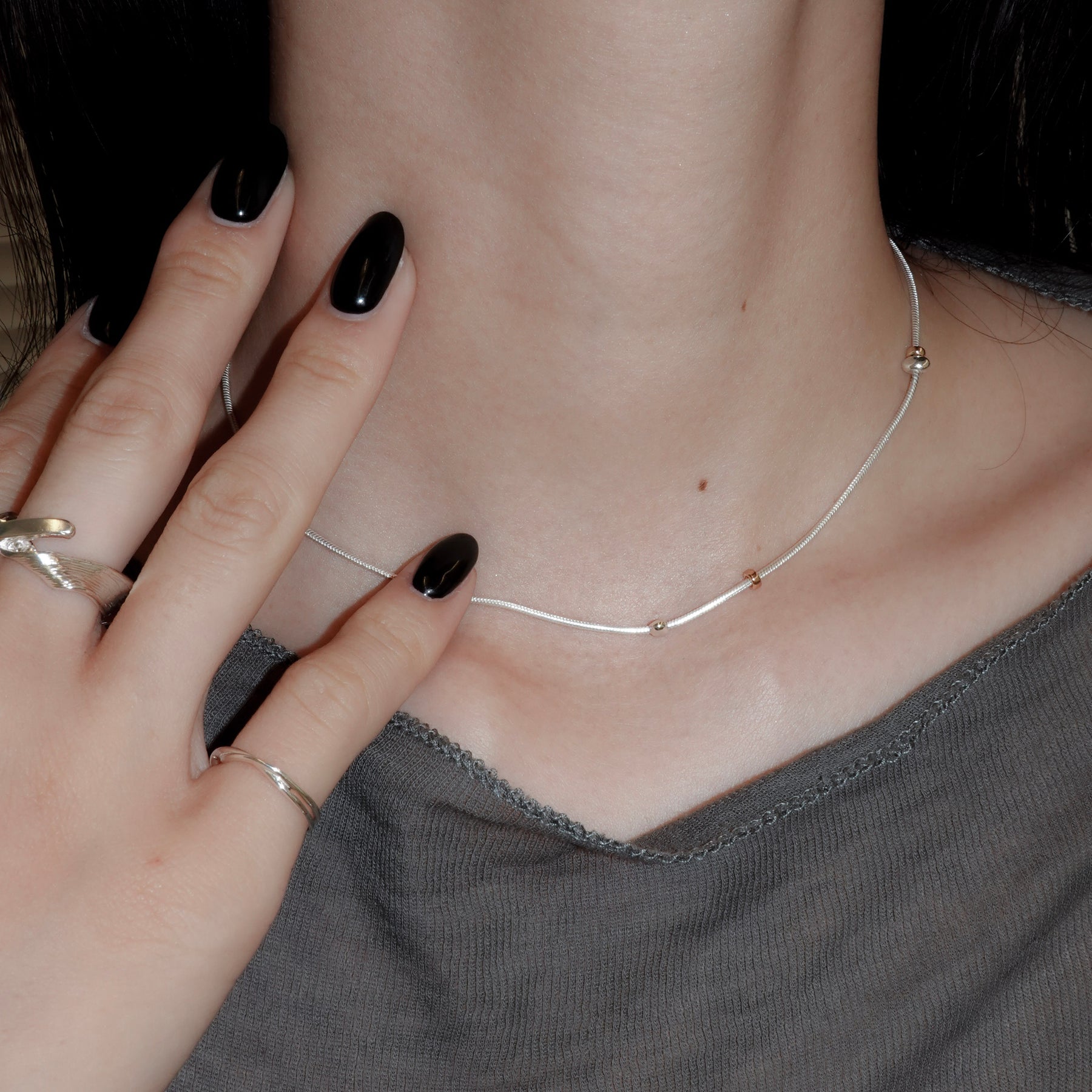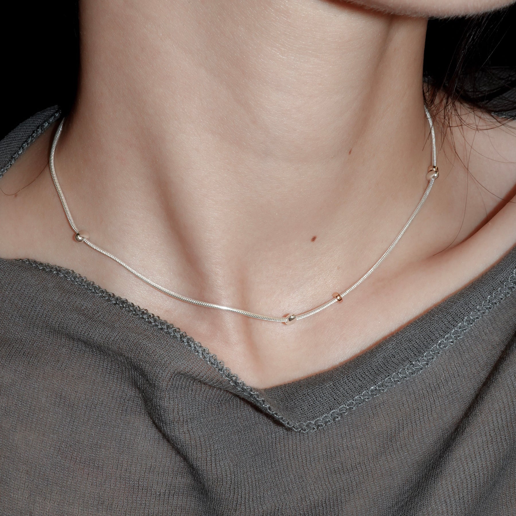 蕾をモチーフにしたシルバーとゴールドのパーツが、体の動きに合わせて軽やかに揺れるチョーカー。
