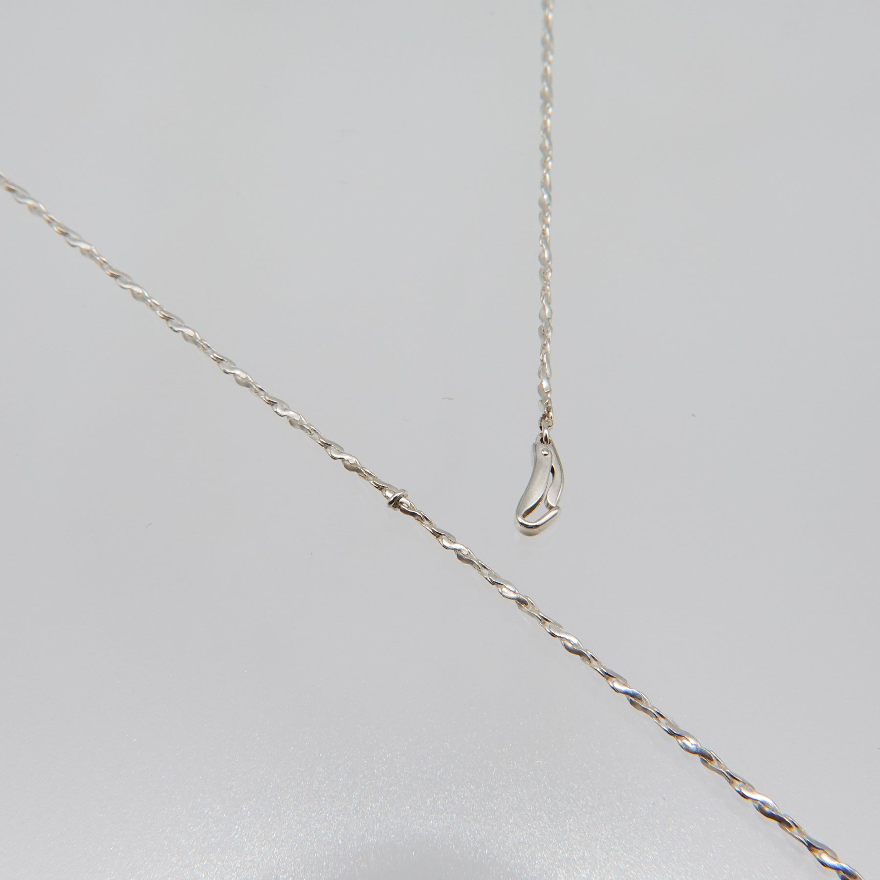 ※チェーン上には、小さな丸カンを2箇所配置しています。デザインの特性上、留め具が自然に上に移動するため、丸カンの下に留め具をセットしてご使用いただくと安定して着けることができます。